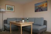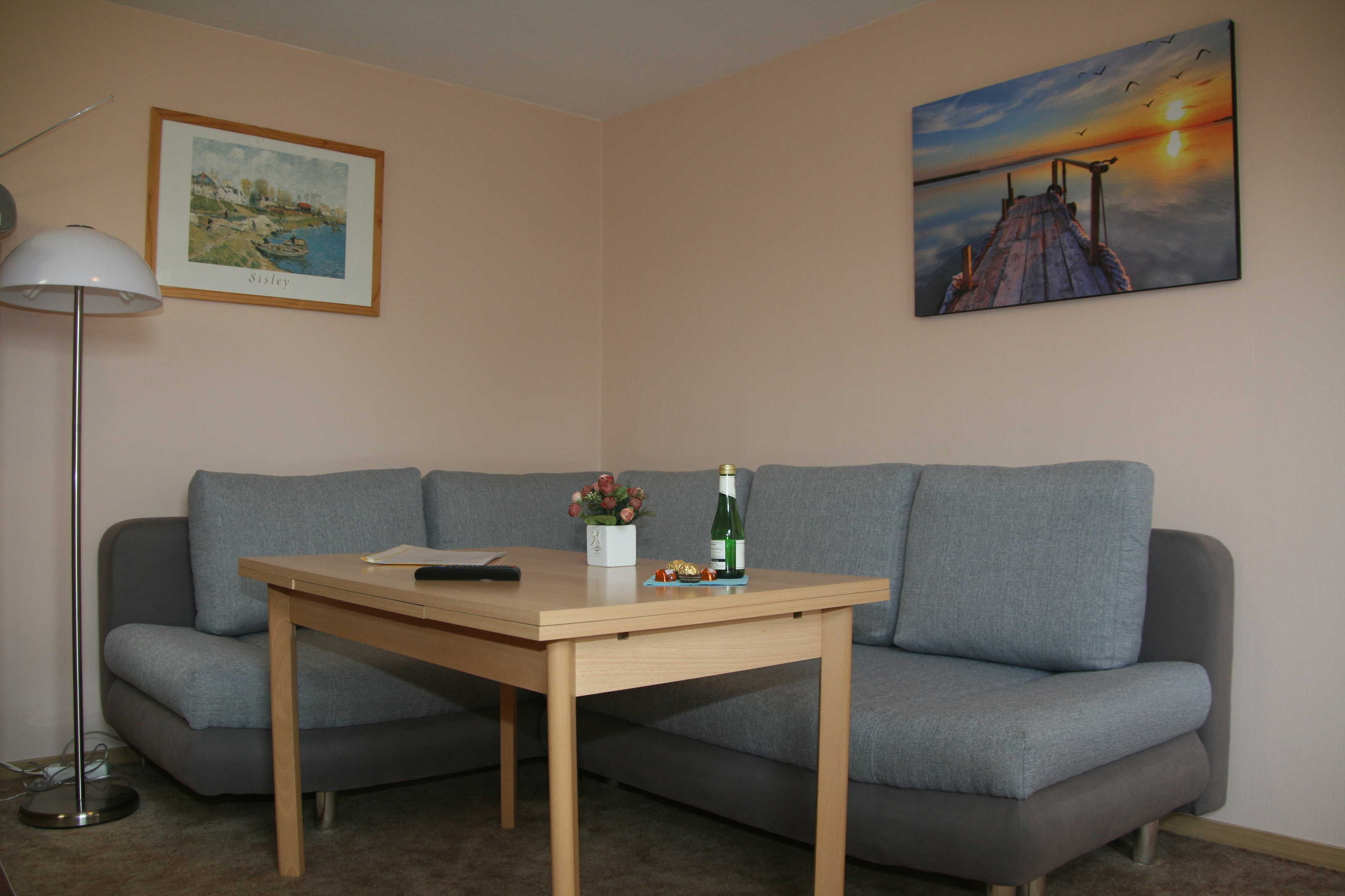Wohnraum mit Sitzecke, Schlafraum 1 mit Doppelbett für 2 Personen (2 Polsterbetten), Schlafraum 2 mit Einzelbett (Polsterbett). Küchenzeile mit 2-Kochfelder-Herd (Ceran), Toaster, Kaffeemaschine, Wasserkocher, DU/ WC, TV, Radio.