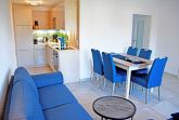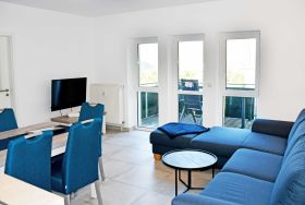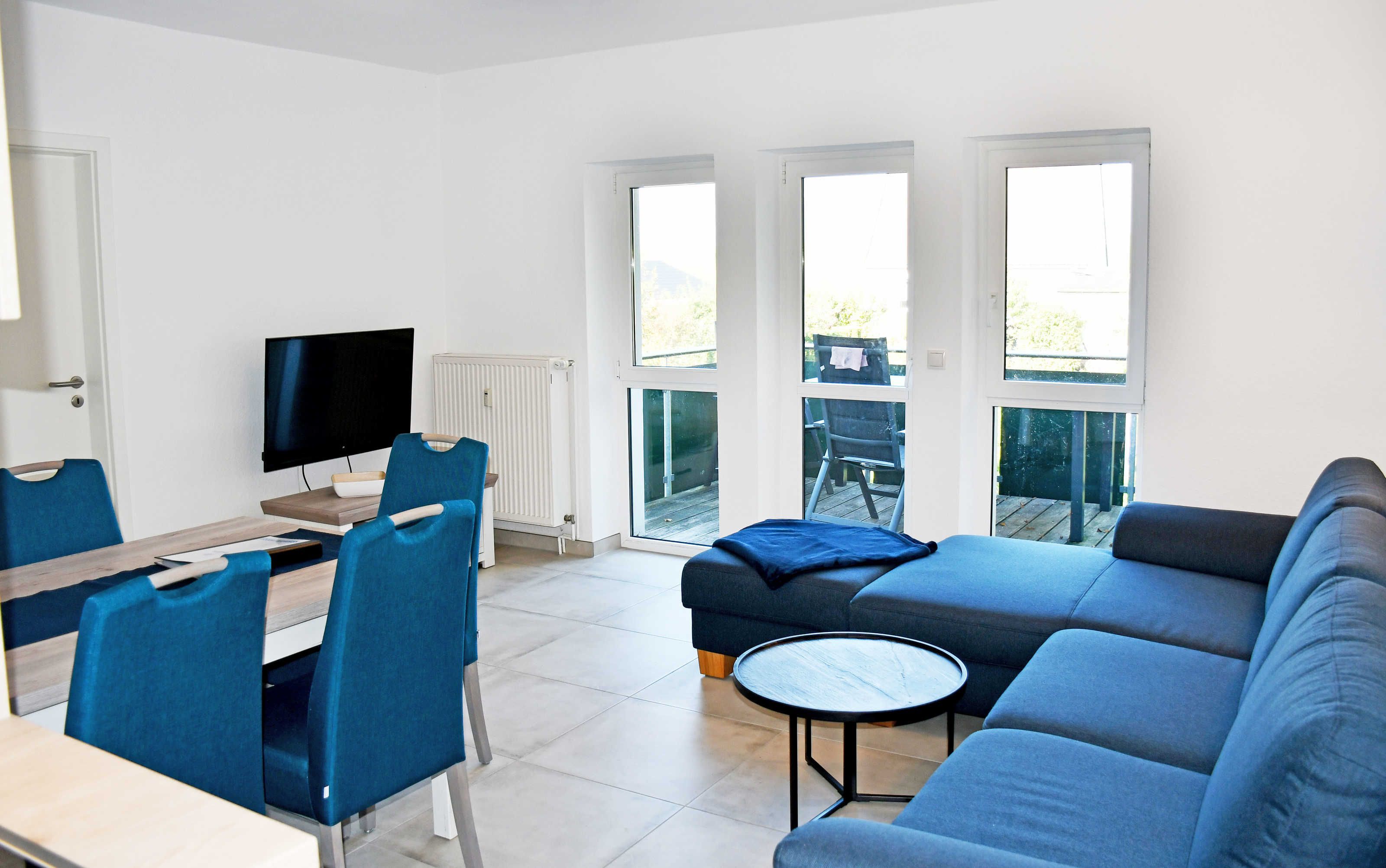 Im Wohnzimmer wartet die gemütliche Sofalandschaft mit Couchtisch und ein modernes Flachbild-TV-Gerät auf Sie zum Relaxen. Hier steht auch ein Esstisch mit fünf Stühlen. Kochfreunde werden in der neuen, hellen und modernen offenen Küche mit hochwertigen Markengeräten wie Backofen, Cerankochfeld mit Abzugshaube, Mikrowelle, Kühlschrank mit Gefrierfach und Geschirrspüler voll auf Ihre Kosten kommen.