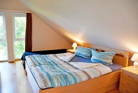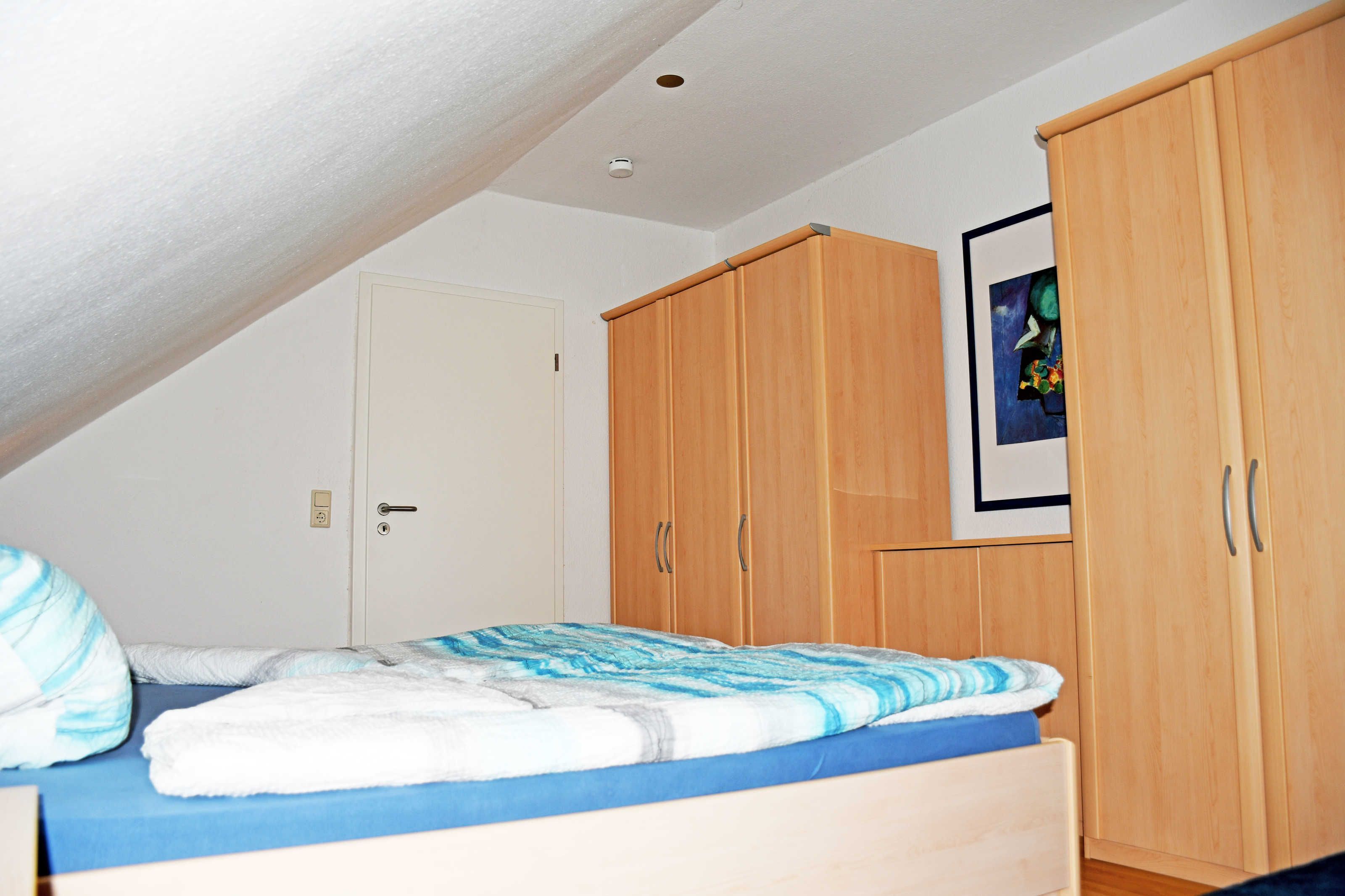 Die Komfortable Ferienwohnung verfügt über 1 separates Schlafzimmer mit Doppelbett (.cm x .cm), Einzelbett (.cm x .cm), Nachttischen mit Beleuchtung sowie einem großzügigen Kleiderschrank. Die Bodentiefen Fenster sind mit Vorhängen verdunkelbar. Bei Ihrer Anreise liegen frische Handtücher bereit und die Betten sind bereits mit Bettwäsche bezogen.