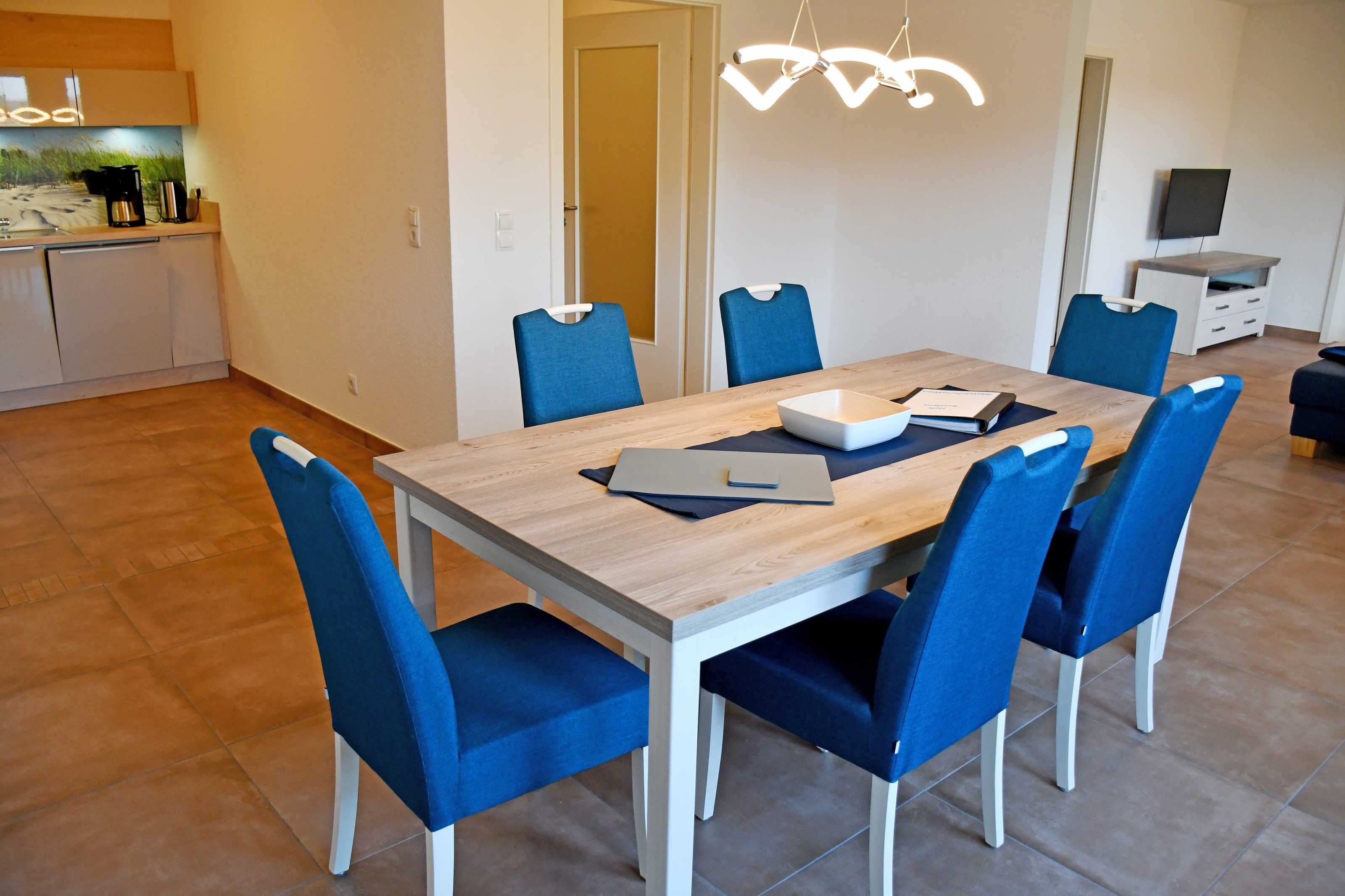 Im kombinierten Wohn- und Esszimmer wartet die gemütliche Sofalandschaft mit Couchtisch und ein modernes Flachbild-TV-Gerät auf Sie zum Relaxen. Hier steht auch ein großer Esstisch mit sechs Stühlen. Kochfreunde werden in der neuen, hellen und modernen offenen Küche mit hochwertigen Markengeräten wie Backofen, Cerankochfeld mit Abzugshaube, Mikrowelle, Kühlschrank mit Gefrierfach und Geschirrspüler voll auf Ihre Kosten kommen.
