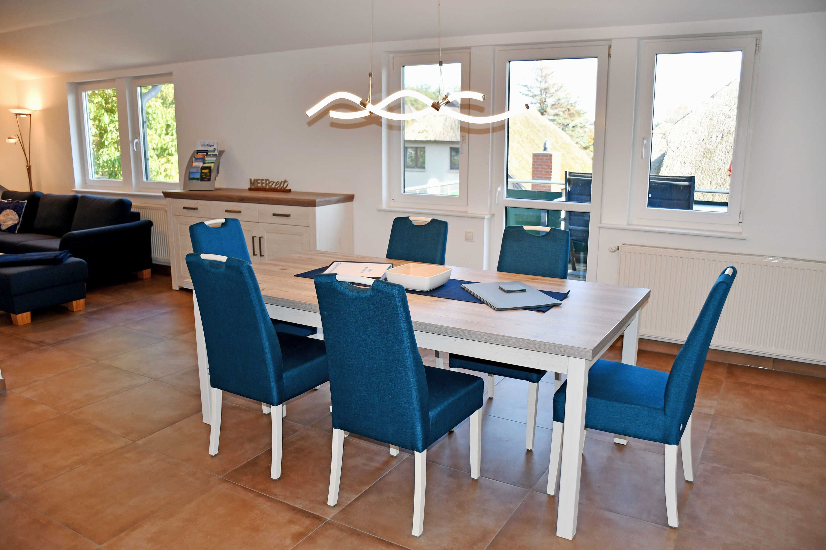 Die großzügige Ferienwohnung Boddentraum bietet auf 86 qm Platz für bis zu 3 Erwachsene und ein Kleinkind bis 3 Jahre im Kinderreisebett. Die in 2021 hochwertig modernisierte Wohnung liegt im 1. Obergeschoss der Höft Residenz.