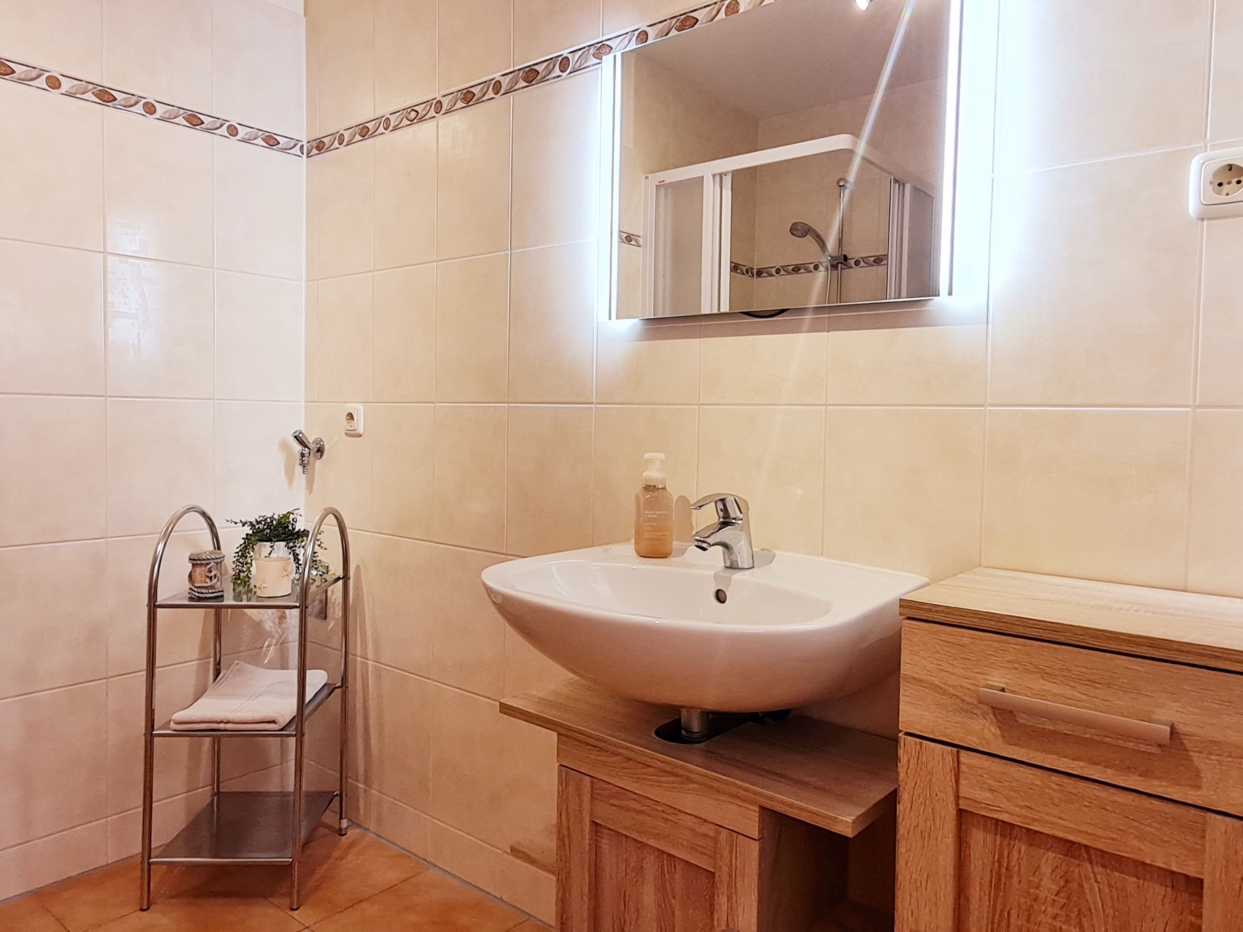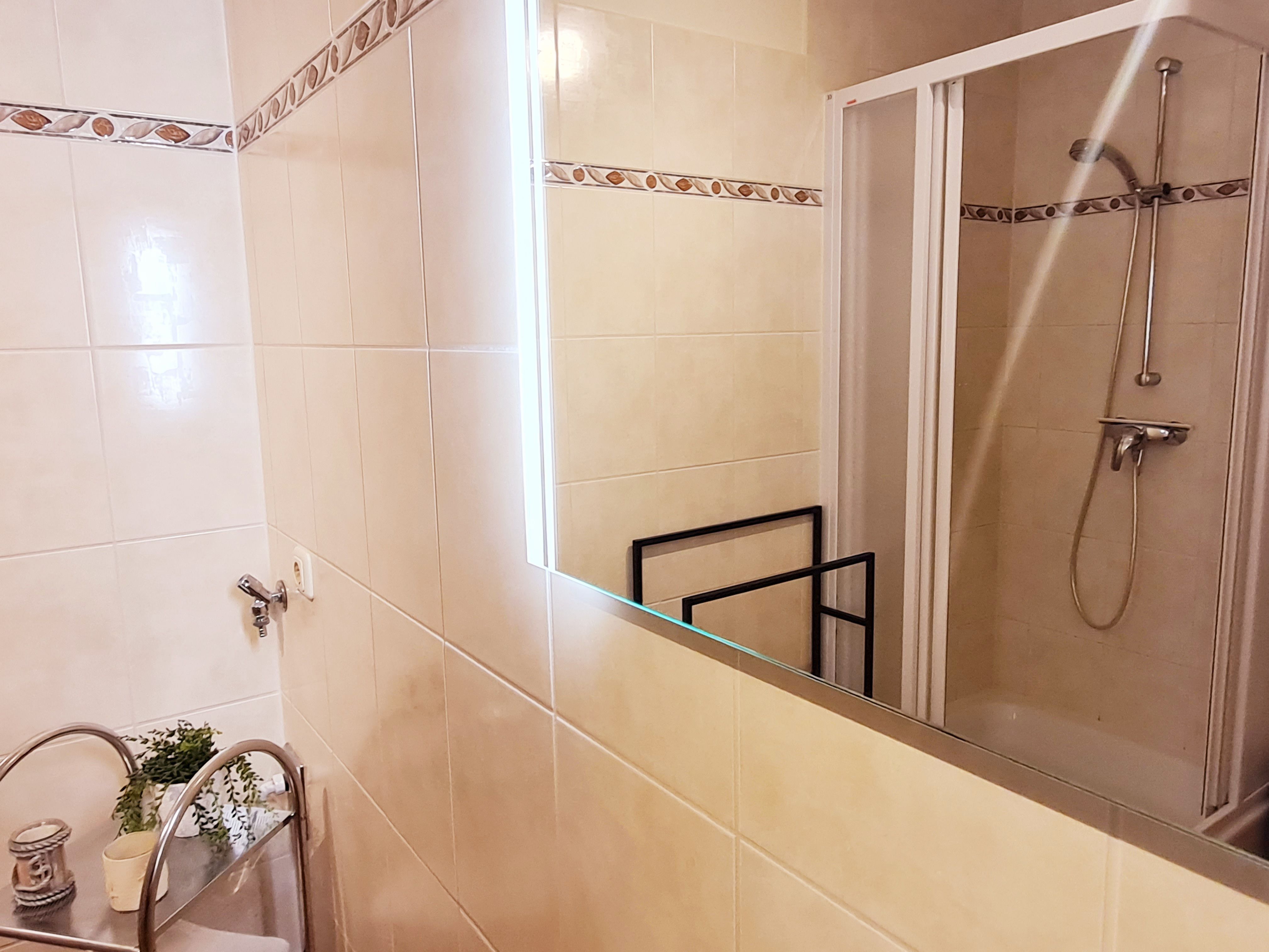 • Bad: ohne Fenster, Dusche, Waschbecken, Toilette, Spiegel, Unterschrank Waschbecken, Schrank, Handtuchhalter
