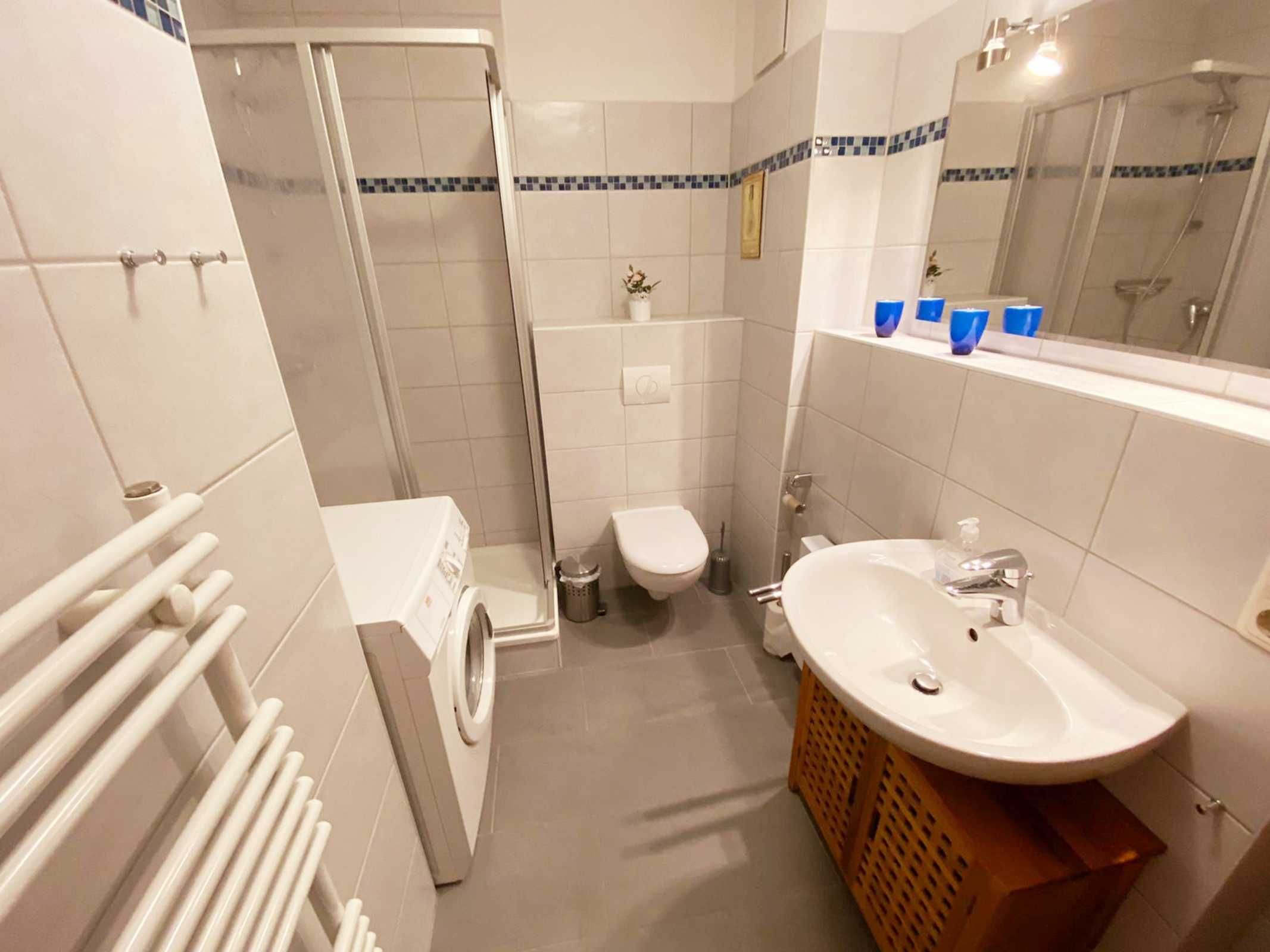 • Badezimmer: ohne Fenster, mit Dusche, Toilette, Waschbecken, Waschbeckenunterschrank, Spiegel, Handtuchhaken ( ohne WM- Privat, Wäschetrockner gegen Gebühr im Hause)