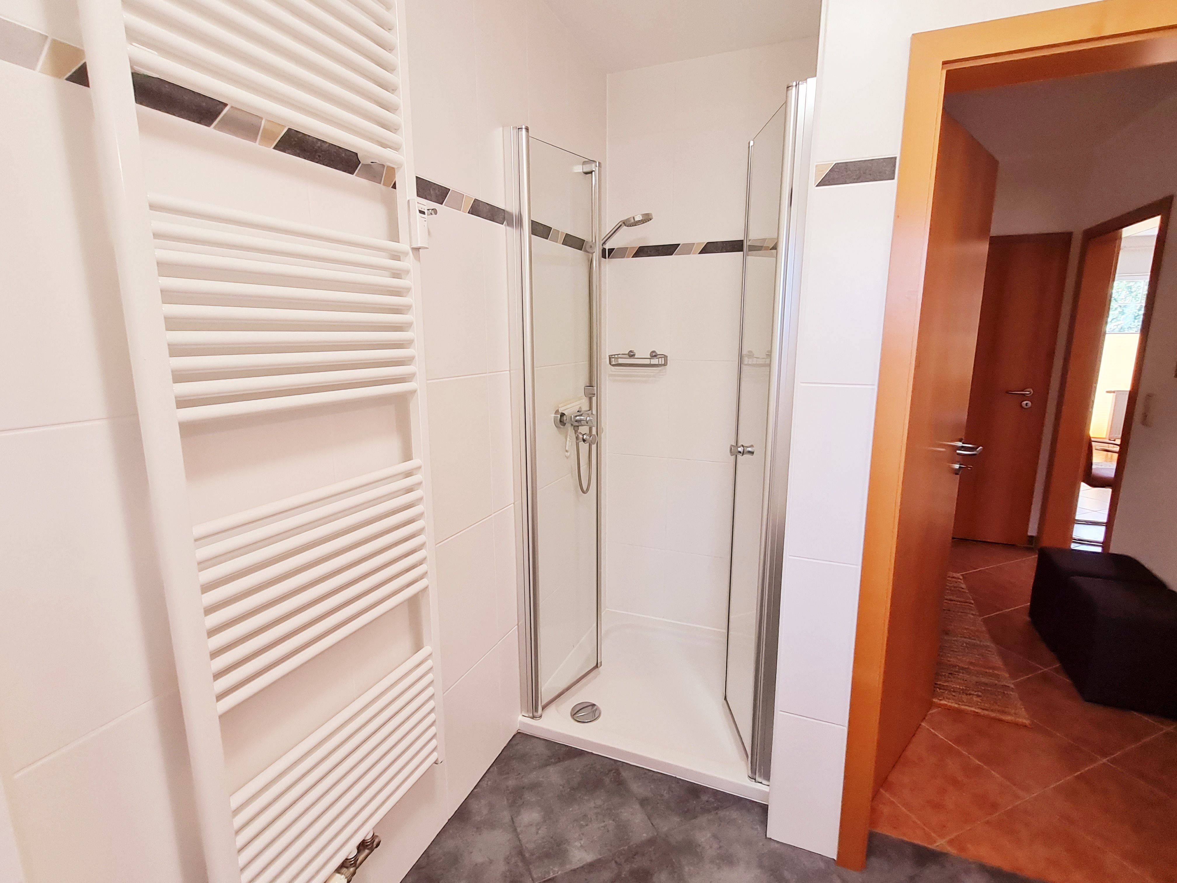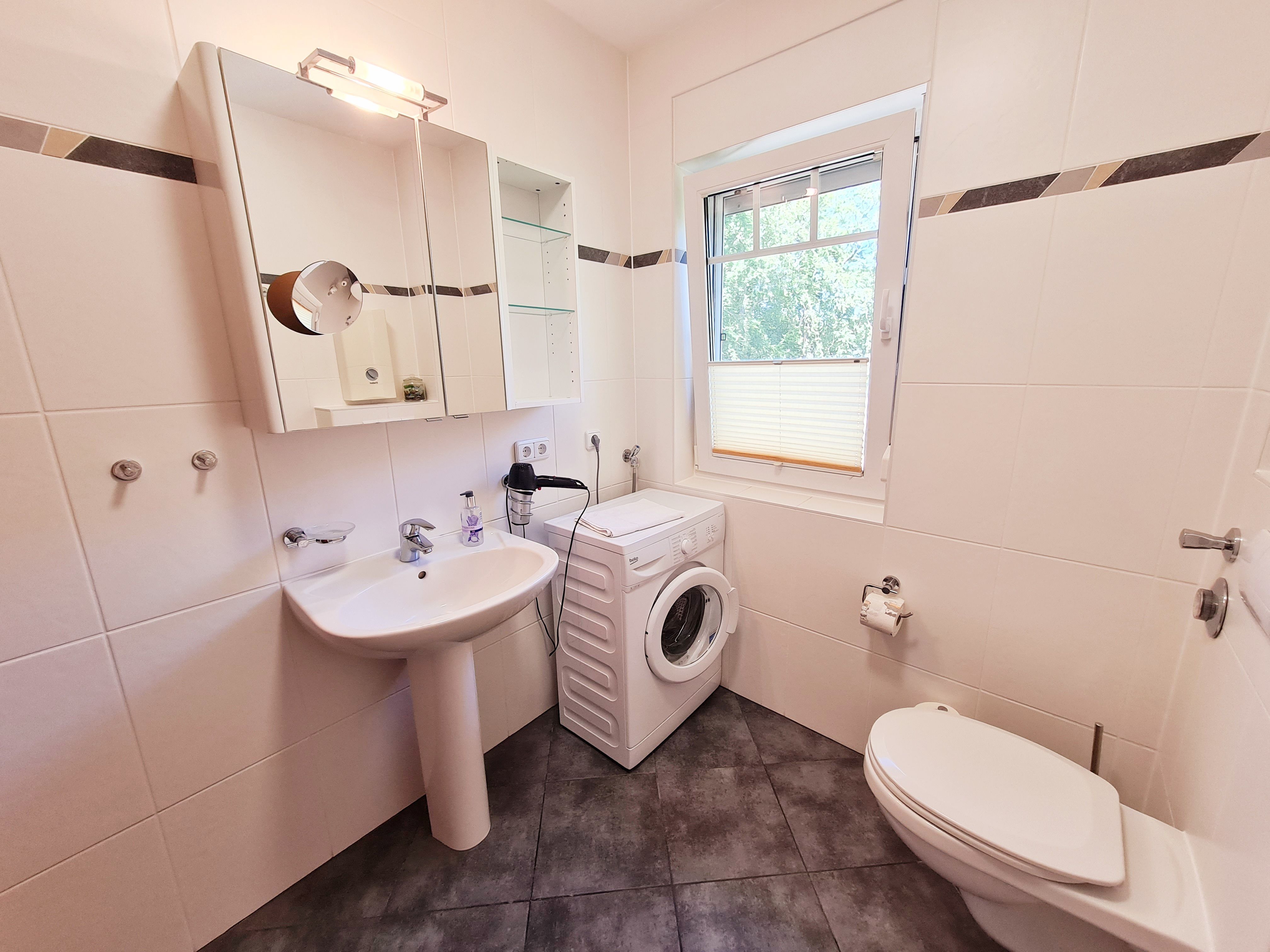• Bad: mit Fenster, Echtglasdusche mit flachem Einstieg, Waschbecken, Toilette, Spiegelschrank, Handtuchhalter, Waschmaschine, Fön
