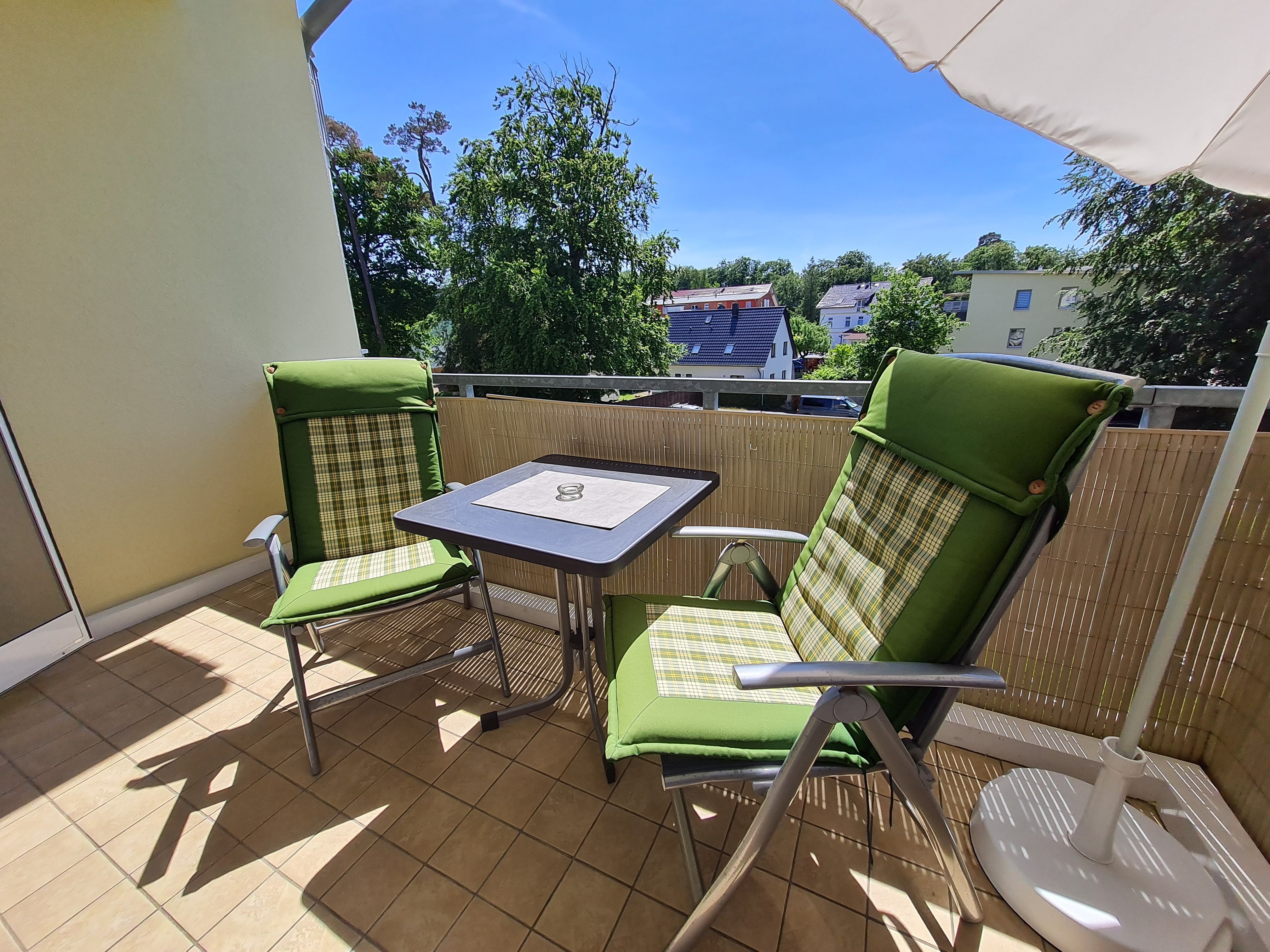 • Balkon: Südausrichtung, Tisch, 2 Stühle, Sonnenschirm