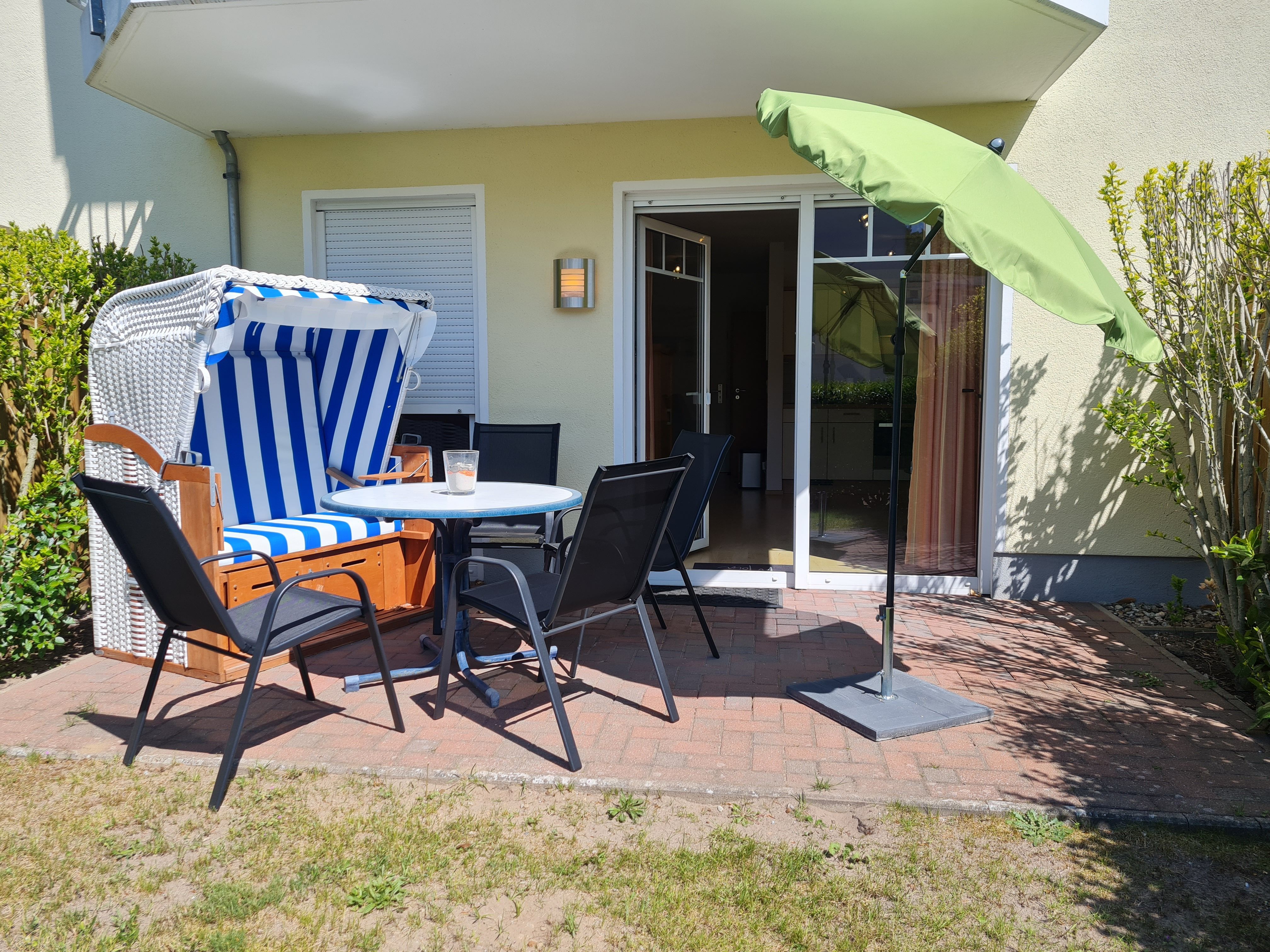 • Terrasse: Südausrichtung mit Gartenstück, Tisch, Stühle, Sonnenschirm, Strandkorb