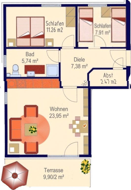 • Terrasse: Südausrichtung mit Gartenstück, Tisch, 4 Stühle, Sonnenschirm