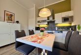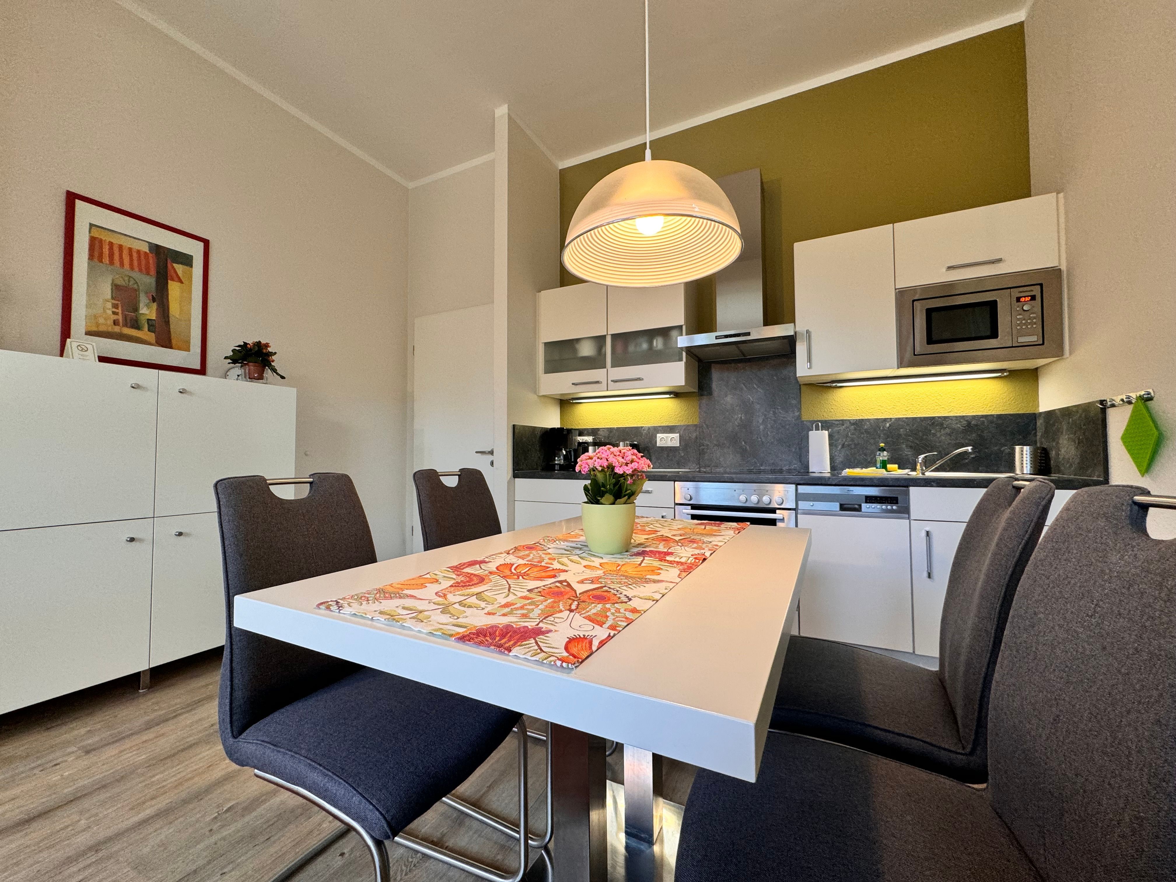 Die Ferienwohnung überzeugt durch ein lichtdurchflutetes Wohnzimmer mit gemütlicher Couchecke (Schlafsofa), Flachbild-TV, Essbereich und Zugang zur offenen Küchenzeile, die keine Wünsche offen lässt. Zur Ausstattung gehören: