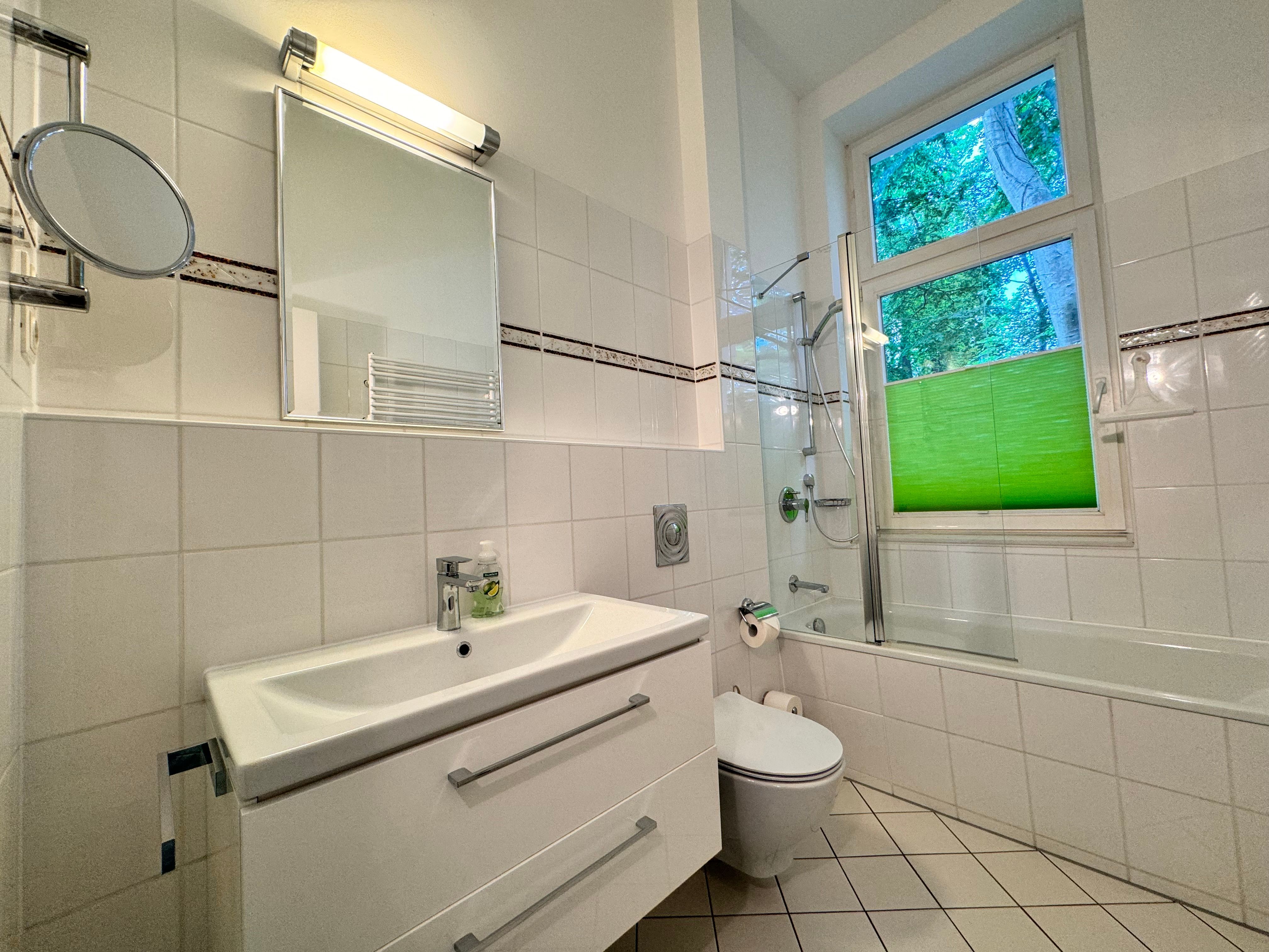 Im modernen Badezimmer finden Sie eine Badewanne, WC, Föhn und Kosmetikspiegel alles für Ihr tägliches Wohlbefinden.
