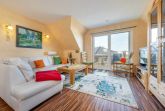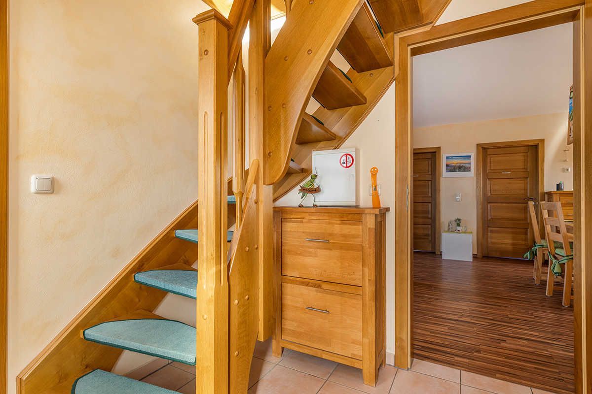 Die Ferienwohnung Fährmann erstreckt sich über das erste Ober- und Dachgeschoss des Ferienhauses Wilke und ist über eine Außentreppe (ca.15 Stufen) zu erreichen. Die Maisonette-Wohnung verfügt über ca. 85 m² und bietet Platz für bis zu sechs Feriengäste. Vom Flur aus gelangen Sie linkerhand ins Gäste WC mit Fenster, WC und Waschmaschine. Rechterhand steht Ihnen ein Tageslichtbad mit Dusche/WC, Waschtisch und Fön zur Verfügung. Geradeaus kommen Sie in den Wohn- und Essbereich, sowie zwei angrenzende Schlafzimmer. Über die im Flur befindliche Holztreppe gelangen Sie vom Obergeschoss zum Spitzboden des Feriendomizils. Hier befindet sich eines der drei Schlafzimmer. Der gemütliche Schlafbereich ist mit einem Einzelbett 90x200 (dieses kann ausgezogen werden, so dass zwei Personen Platz finden -höhenversetzt-), Nachttisch und einem abdunkelbarem Dachfenster mit Insektenschutz ausgestattet. Vom obersten Geschoss haben Sie einen tollen Blick auf die Insel Hiddensee.