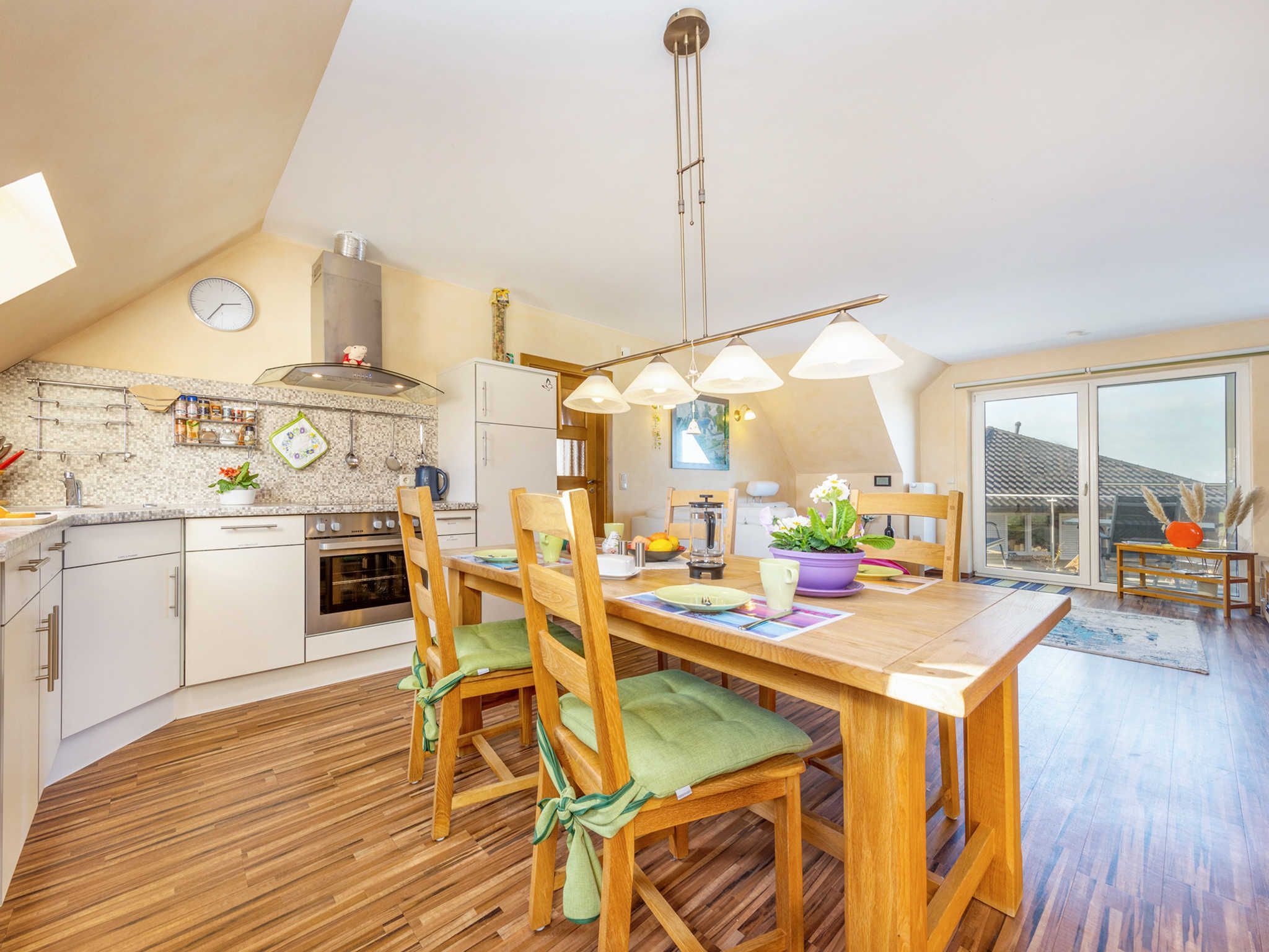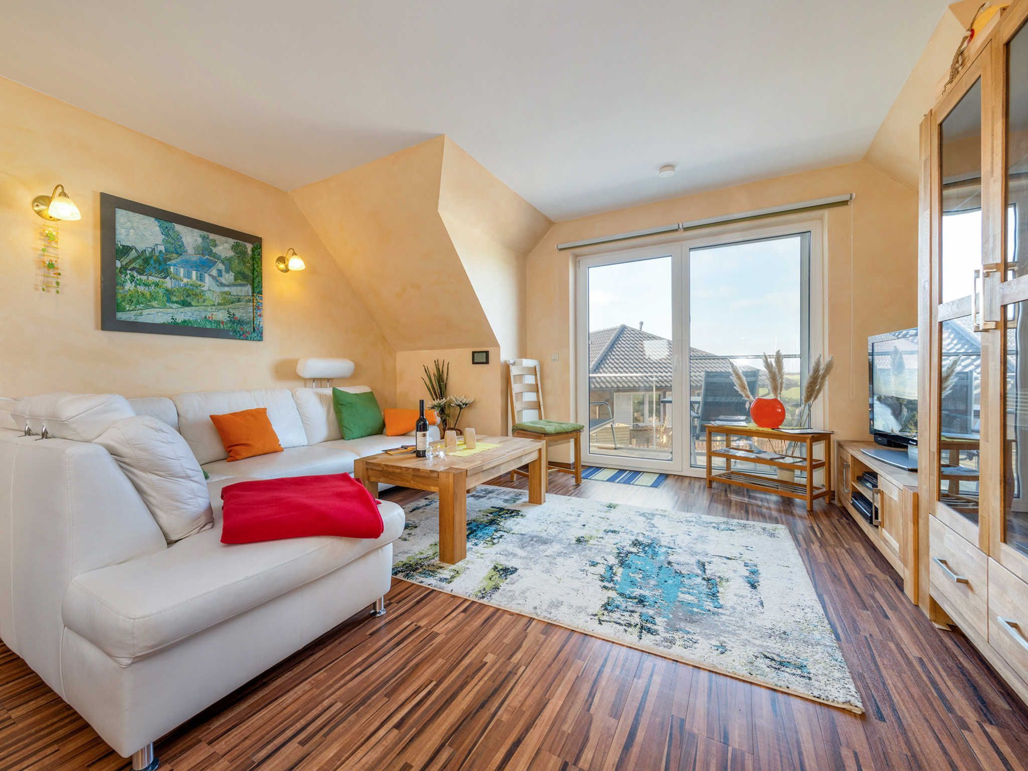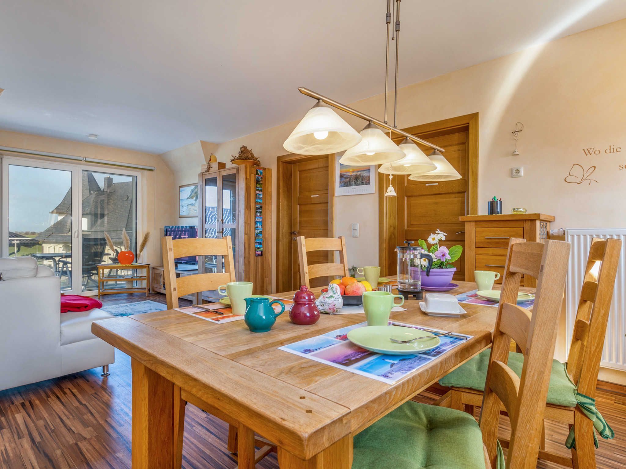 Der geschmackvoll gestaltete Wohn- und Essbereich mit angrenzendem Süd-West Balkon lädt zum Verweilen ein. Der große Esstisch und auch die gemütliche Eckcouch bieten Platz für alle Gäste. Ein Flachbild TV mit einer Bildschirmdiagonale von ca. 105 cm und ein DVD Player sind vorhanden. Die offene Wohnküche ist mit Kühlschrank (integriertem kleinen Gefrierfach), Cerankochfeld, Backofen, Geschirrspüler, Toaster, Wasserkocher und Kaffeemaschine ausgestattet. Vom Wohn- und Essbereich mit Küchenzeile gelangen Sie in zwei der drei Schlafzimmer. Beide Schlafräume verfügen über große Doppelbetten mit hochwertigen Matratzen, sowie je einen Kleiderschrank und einer Kommode. Eines dieser zwei Schlafzimmer wurde mit TV Gerät und Safe, sowie Ganzkörperspiel ausgestattet. Direkt neben dem Ferienhaus Wilke befindet sich unser „Fähreck“, dieser gemütliche, mit Gartenmöbeln gestaltete Grillbereich steht Ihnen zur freien Verfügung.