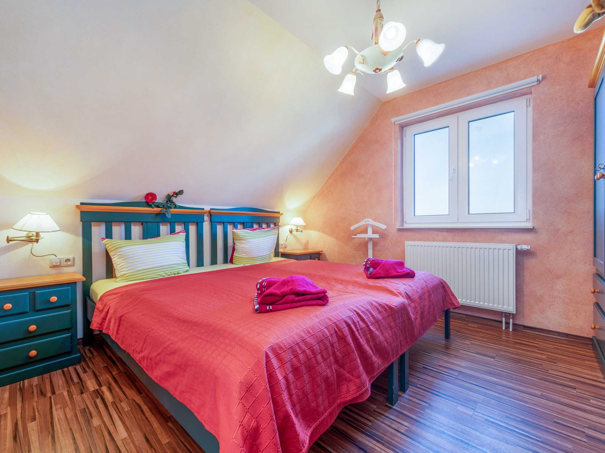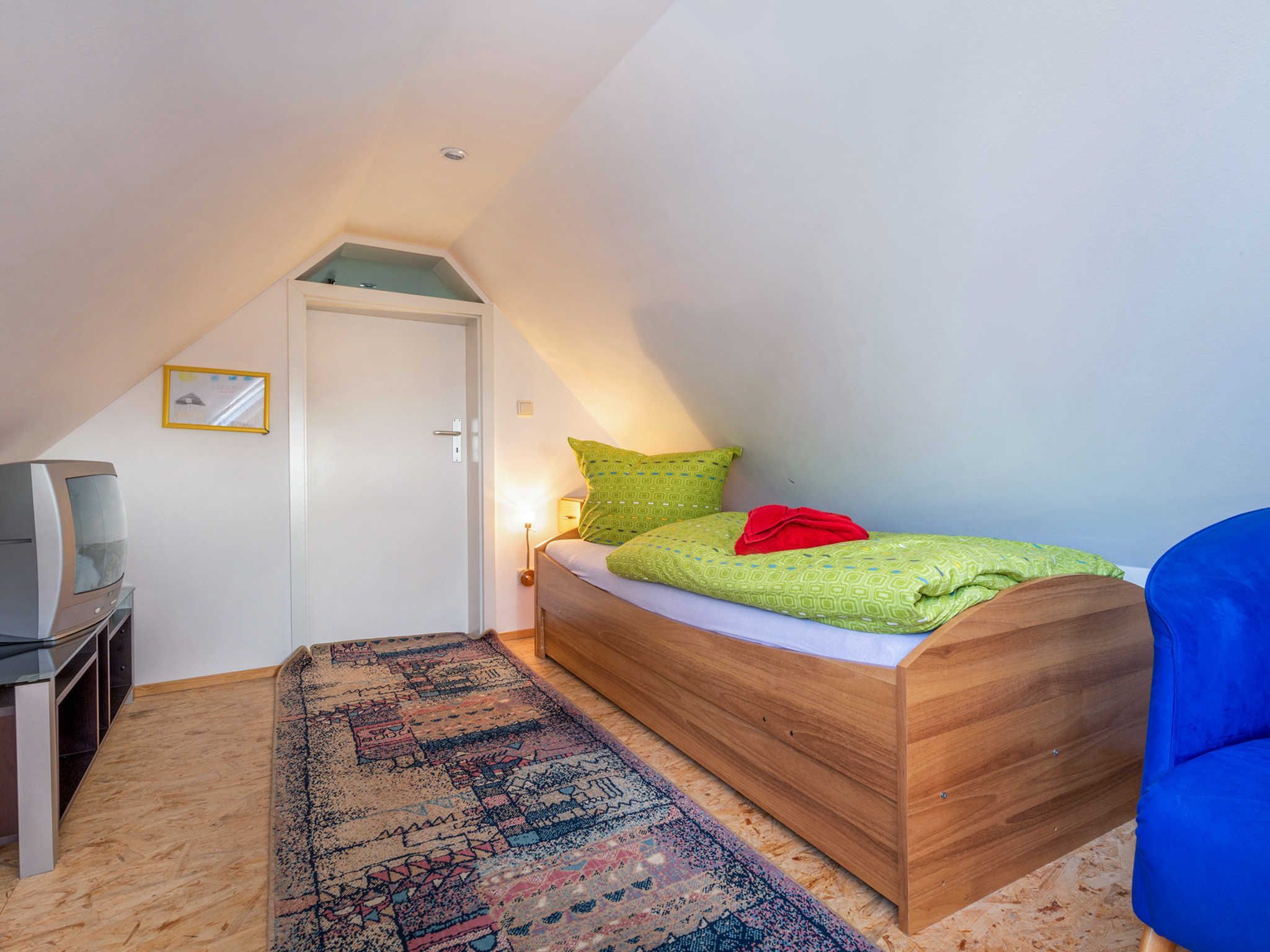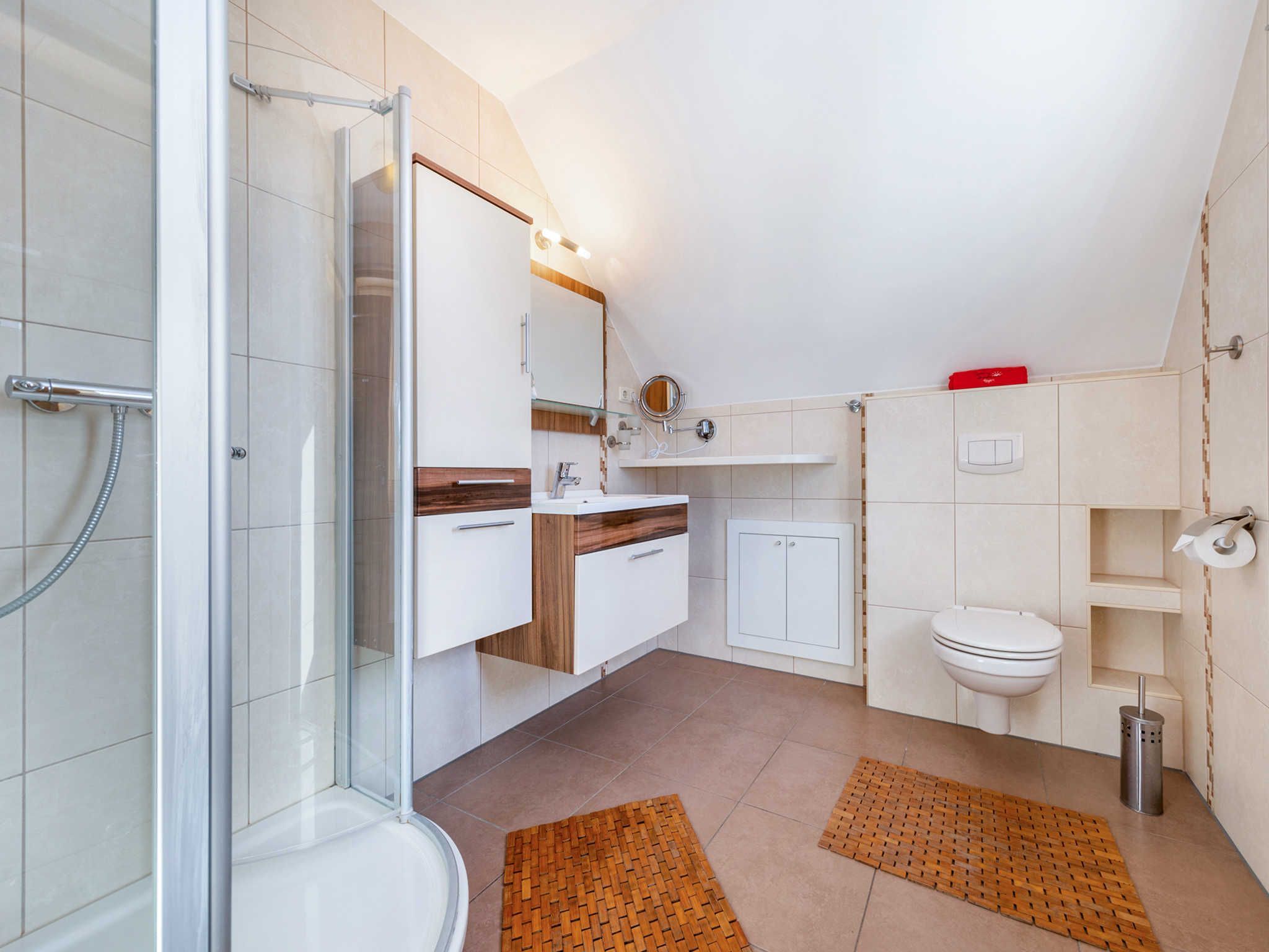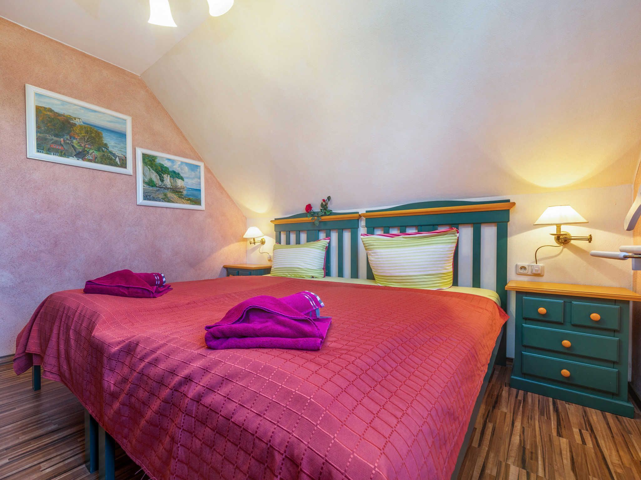 Die Ferienwohnung Fährmann erstreckt sich über das Obergeschoss des Ferienhauses Wilke und ist über eine Außentreppe (15 Stufen) zu erreichen. Die Wohnung verfügt über ca. 85 m² und bietet Platz für bis zu sechs Feriengäste. Vom Flur aus gelangen Sie linkerhand ins Gäste WC mit Fenster, WC und Waschmaschine. Rechterhand steht Ihnen ein Tageslichtbad mit Dusche/WC, Waschtisch und Fön zur Verfügung. Geradeaus gelangen Sie in den Wohn- und Essbereich, sowie zu den zwei angrenzenden Schlafzimmern. Über die im Flur befindliche Holztreppe gelangen Sie vom Obergeschoss in den Spitzboden des Feriendomizils. Hier befindet sich das dritte Schlafzimmer (offen). Der gemütliche Schlafbereich ist mit einem ausziehbarem Einzelbett, einem kleinen Nachttisch und einem abdunkelbarem Dachfenster mit Insektenschutz ausgestattet. Vom Spitzboden haben Sie einen tollen Blick auf die Insel Hiddensee.