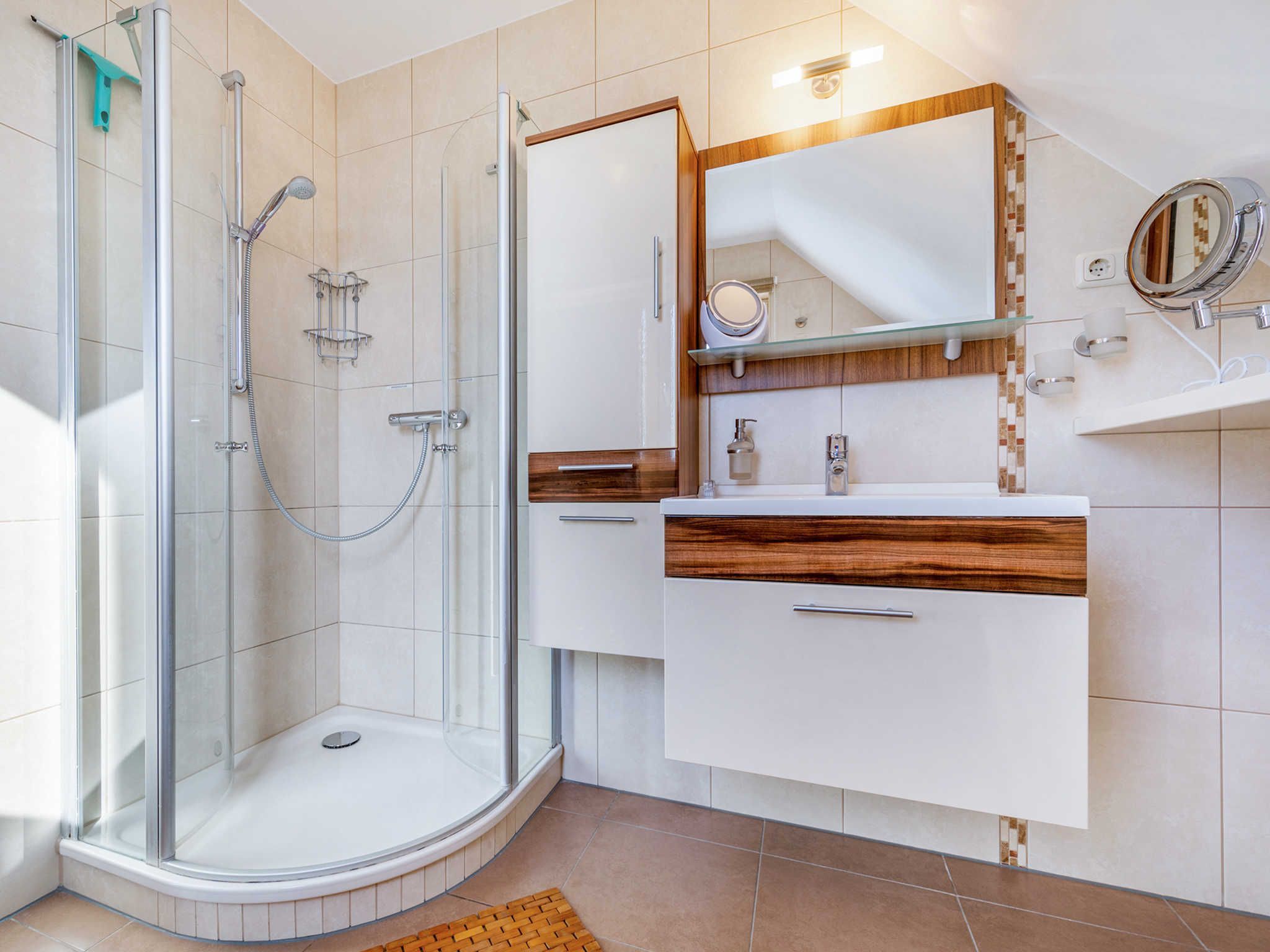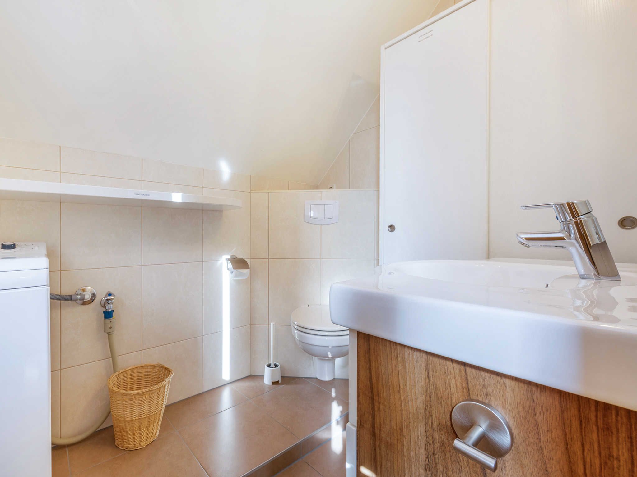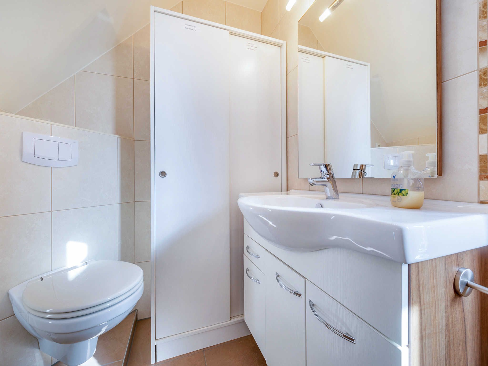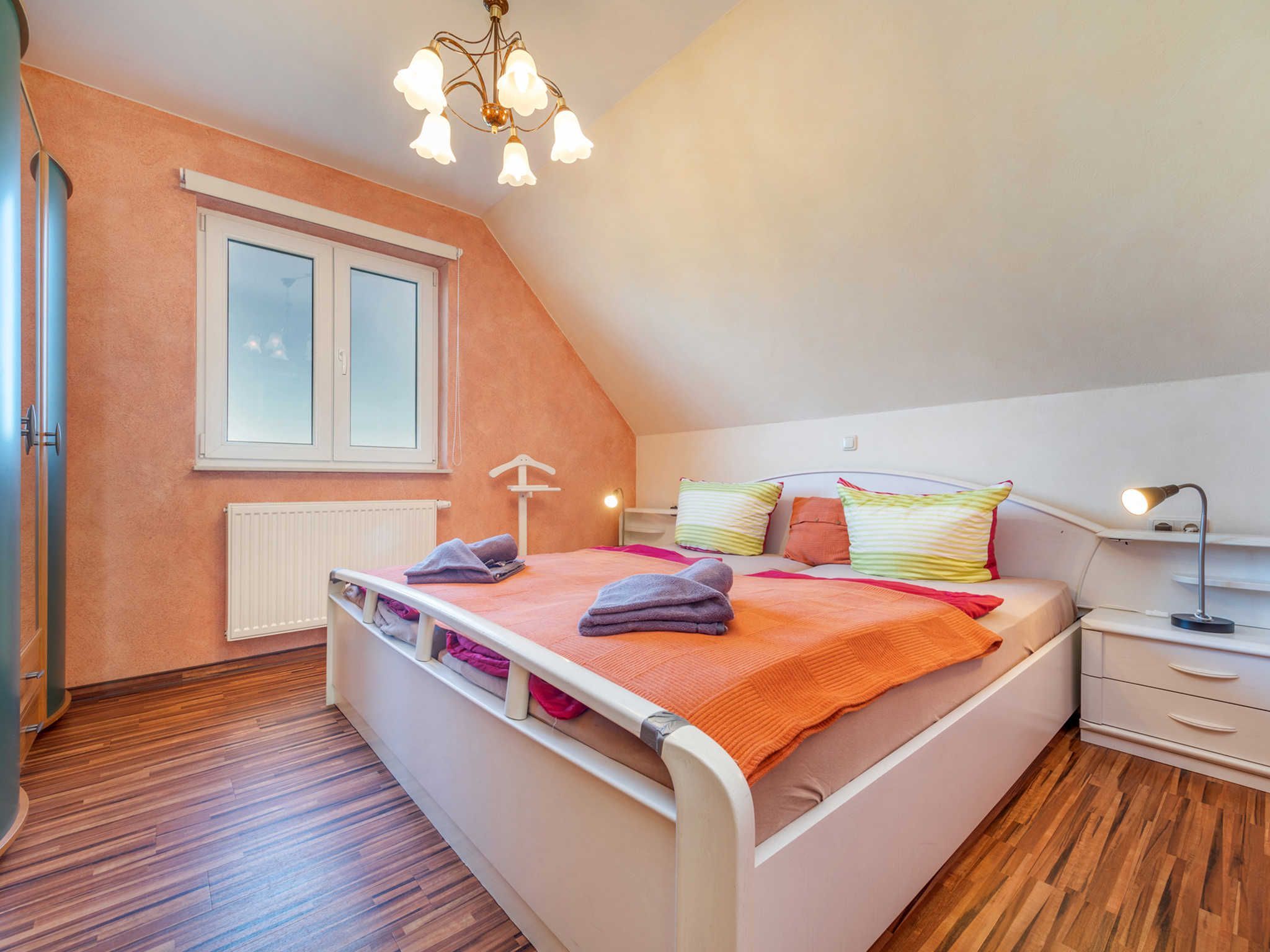 Die Ferienwohnung Fährmann erstreckt sich über das Obergeschoss des Ferienhauses Wilke und ist über eine Außentreppe (15 Stufen) zu erreichen. Die Wohnung verfügt über ca. 85 m² und bietet Platz für bis zu sechs Feriengäste. Vom Flur aus gelangen Sie linkerhand ins Gäste WC mit Fenster, WC und Waschmaschine. Rechterhand steht Ihnen ein Tageslichtbad mit Dusche/WC, Waschtisch und Fön zur Verfügung. Geradeaus gelangen Sie in den Wohn- und Essbereich, sowie zu den zwei angrenzenden Schlafzimmern. Über die im Flur befindliche Holztreppe gelangen Sie vom Obergeschoss in den Spitzboden des Feriendomizils. Hier befindet sich das dritte Schlafzimmer (offen). Der gemütliche Schlafbereich ist mit einem ausziehbarem Einzelbett, einem kleinen Nachttisch und einem abdunkelbarem Dachfenster mit Insektenschutz ausgestattet. Vom Spitzboden haben Sie einen tollen Blick auf die Insel Hiddensee.