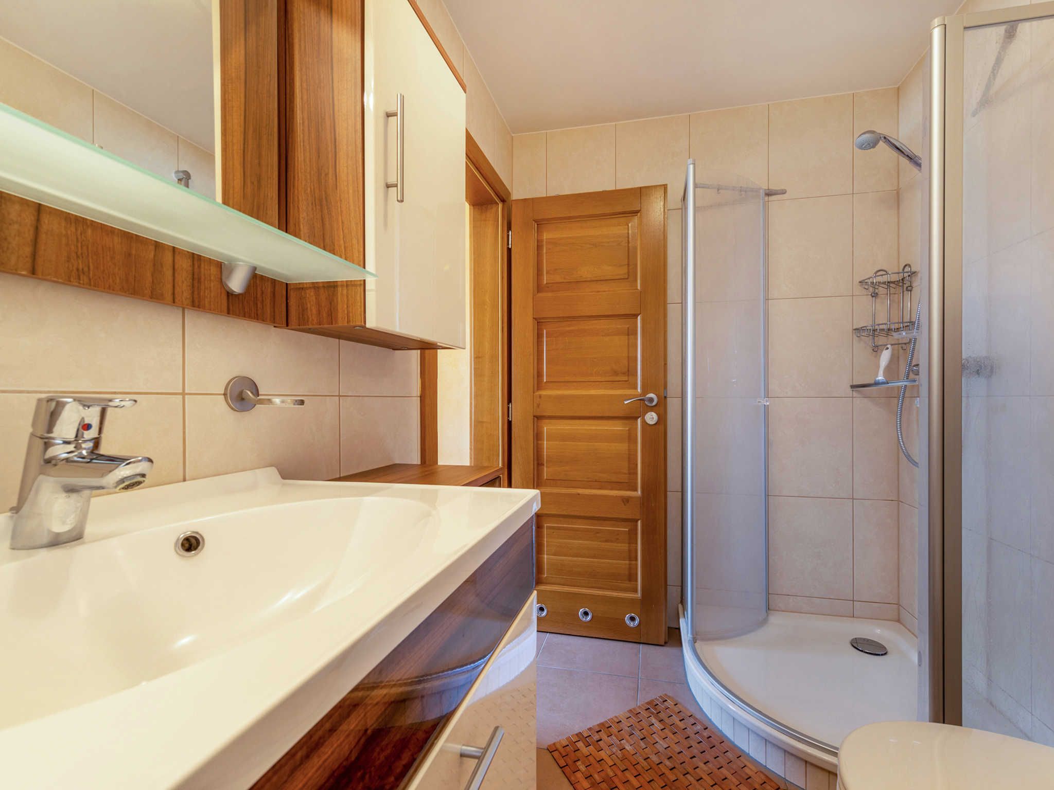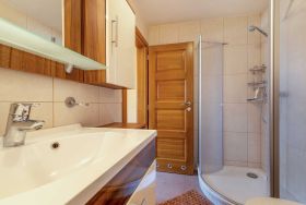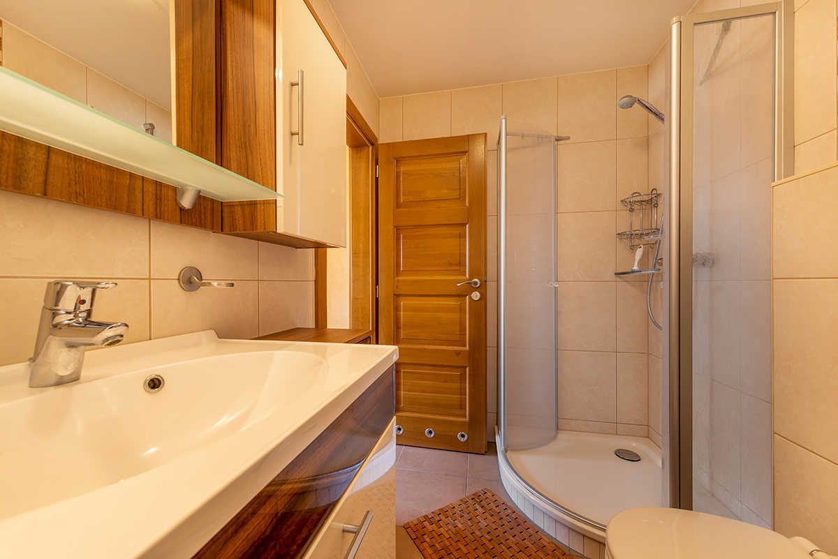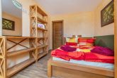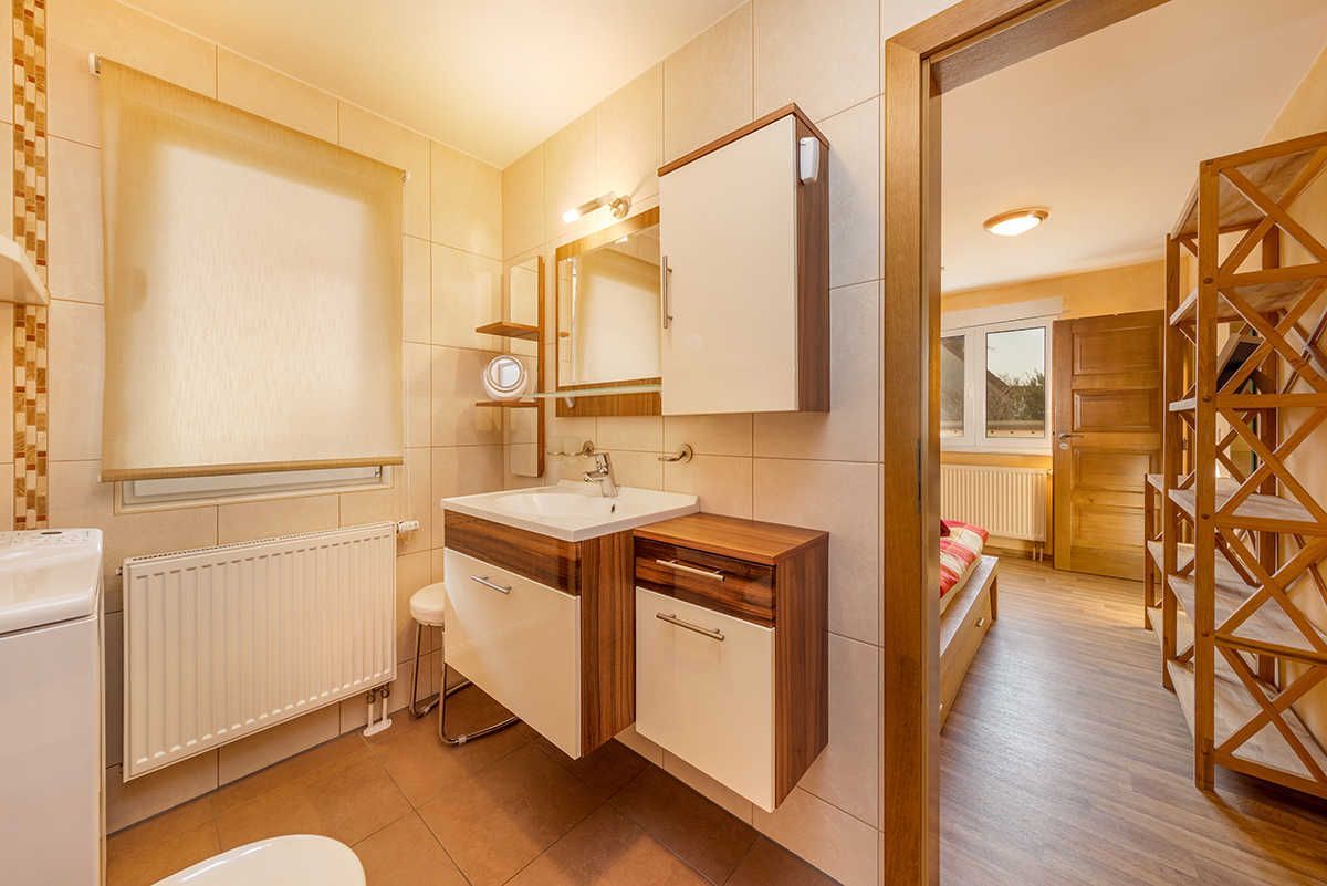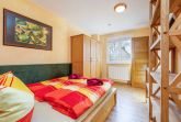Das komplett verdunkelbare Schlafzimmer ist mit einem Doppelbett (1,40 m breit), einem Kleiderschrank und einem Regal ausgestattet. Direkt an das Schlafzimmer grenzt das Tageslichtbad, dieses ist mit Dusche / WC, Waschtisch und Fön ausgestattet.