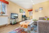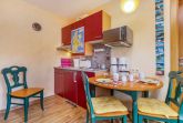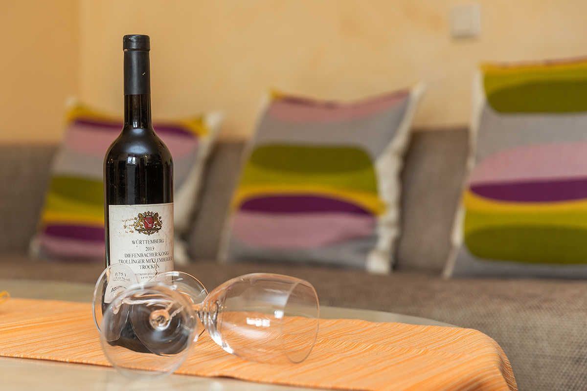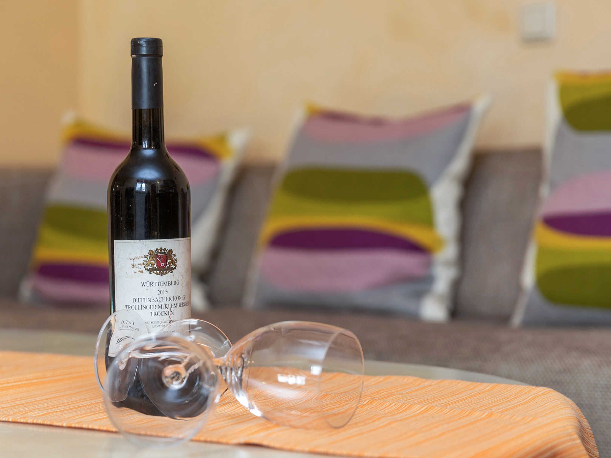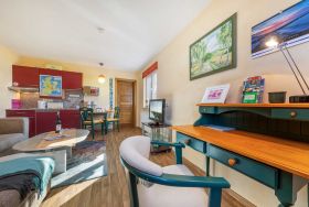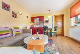 Das Urlaubsdomizil bietet auf 52 m² Platz für zwei Personen. Das Wohnzimmer verfügt über eine Couch mit Schlaffunktion (Aufbettung für max. eine Person nach Absprache möglich), Flachbild TV mit einer Bildschirmdiagonale von 60 cm mit Radiofunktion, einem Schreibtisch, sowie eine Küchenzeile mit Kühlschrank (integriertem kleinem Gefrierfach), zwei Platten Cerankochfeld, Kaffeemaschine, Toaster und Wasserkocher.