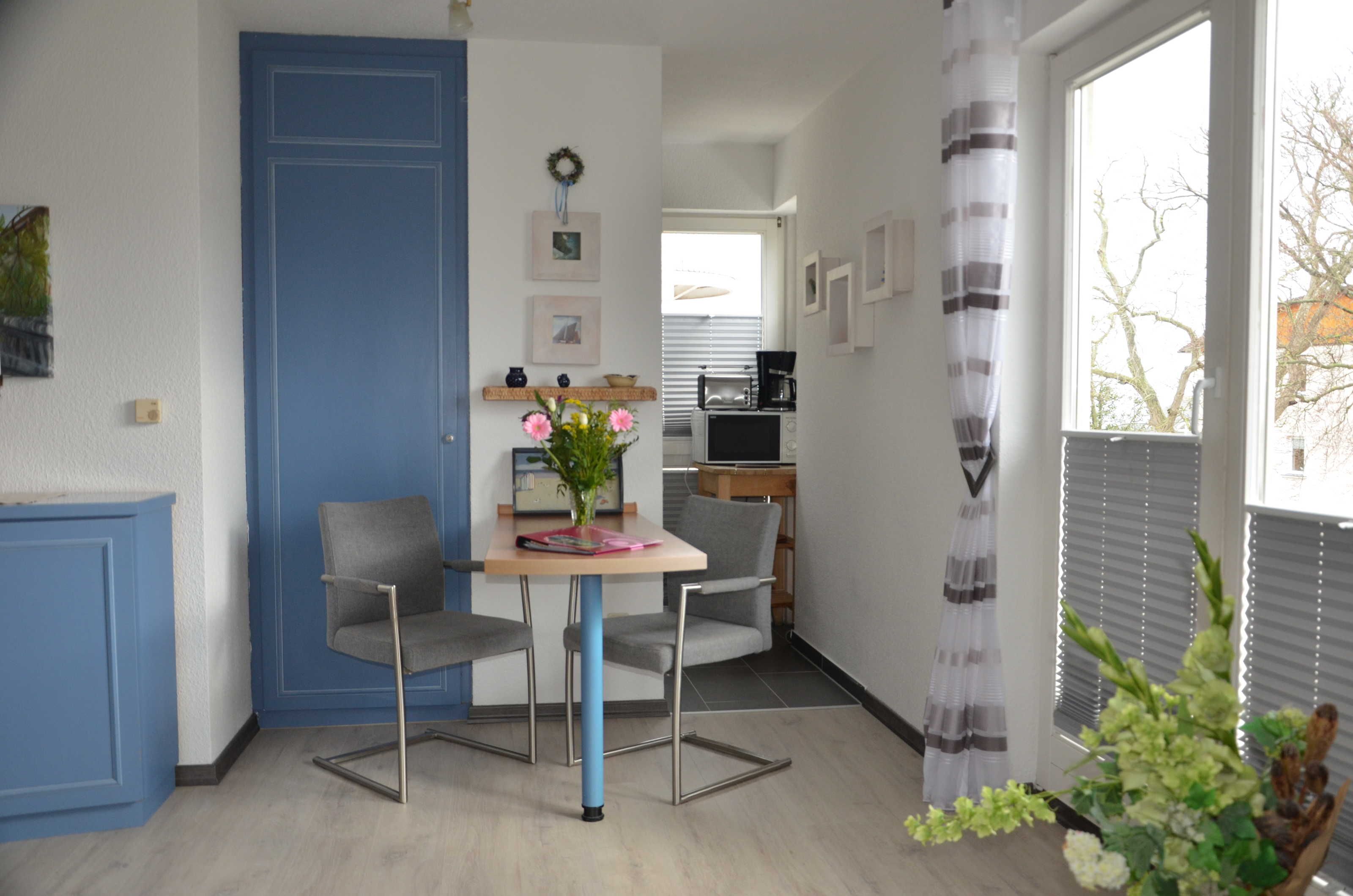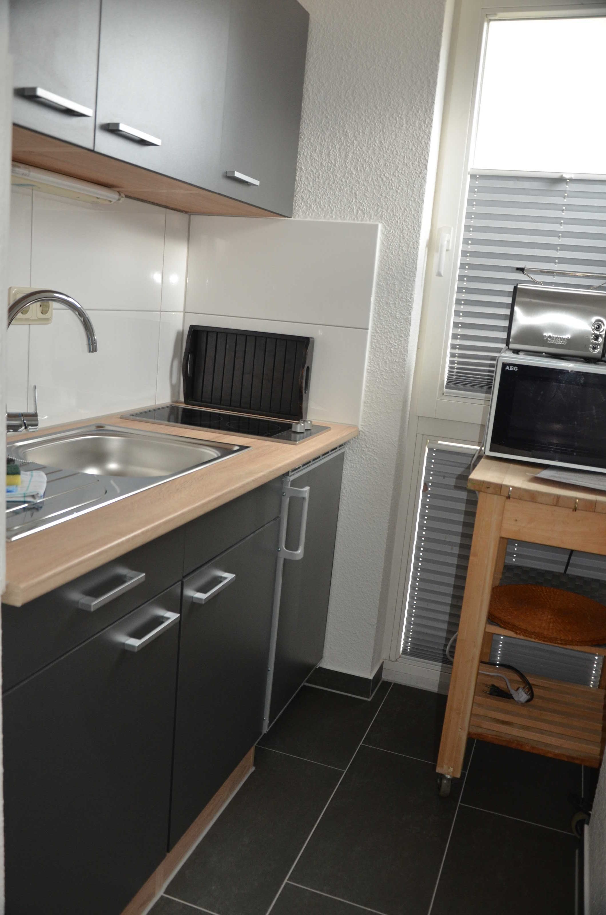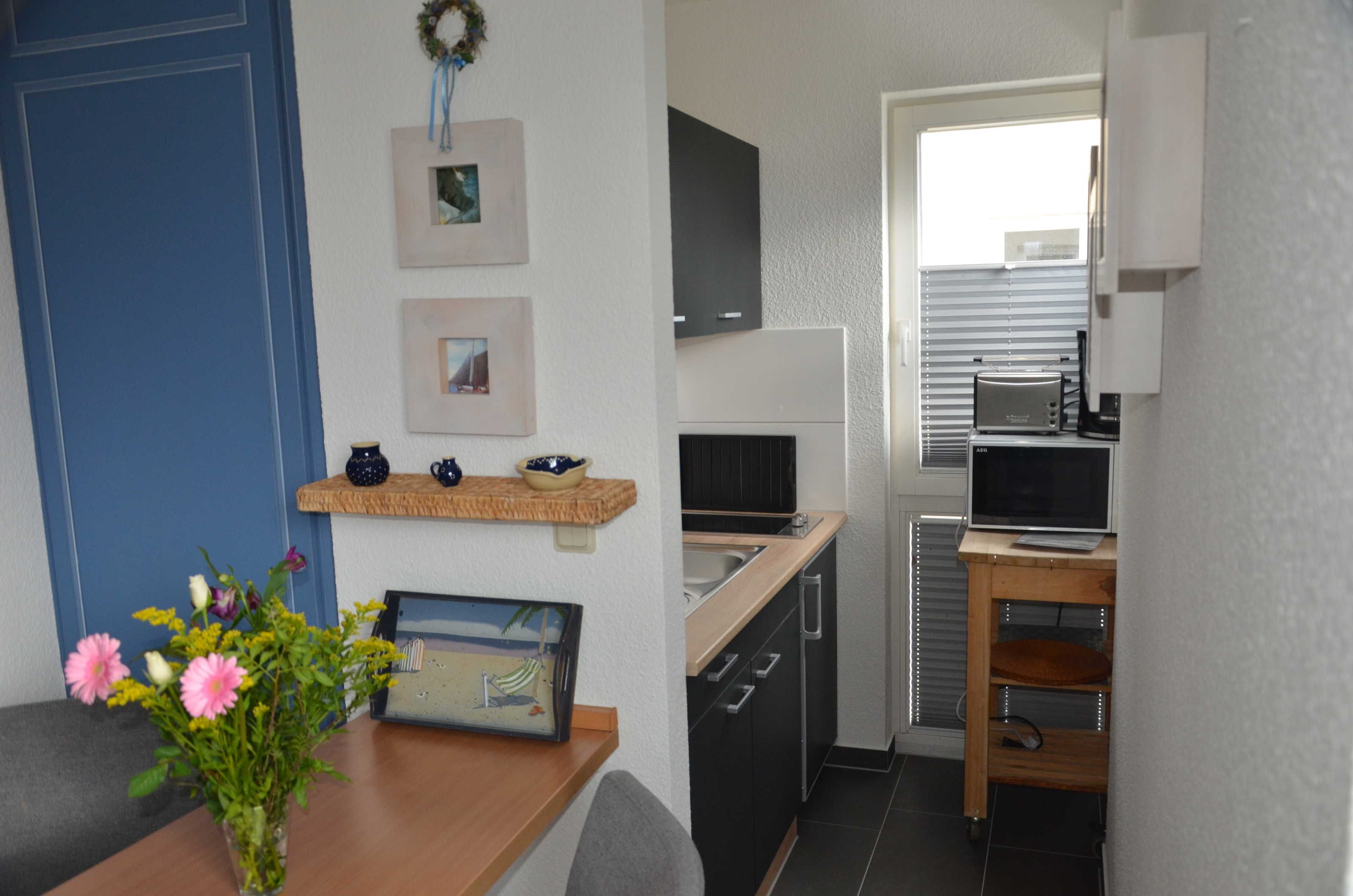 • Die Mini-Küche ist offen zum Wohnbereich und ausgestattet mit 2-Platten-Ceran-Kochfeld, Mikrowelle, Kaffeemaschine, Toaster, Wasserkocher und diversen Küchenutensilien.