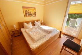 • Schlafzimmer: Doppelbett mit zwei Einzelmatratzen 90x200 m, 4-türiger Schrank, Nachttische + Lampen, Platz für Reisebett, direkter Zugang Terrasse