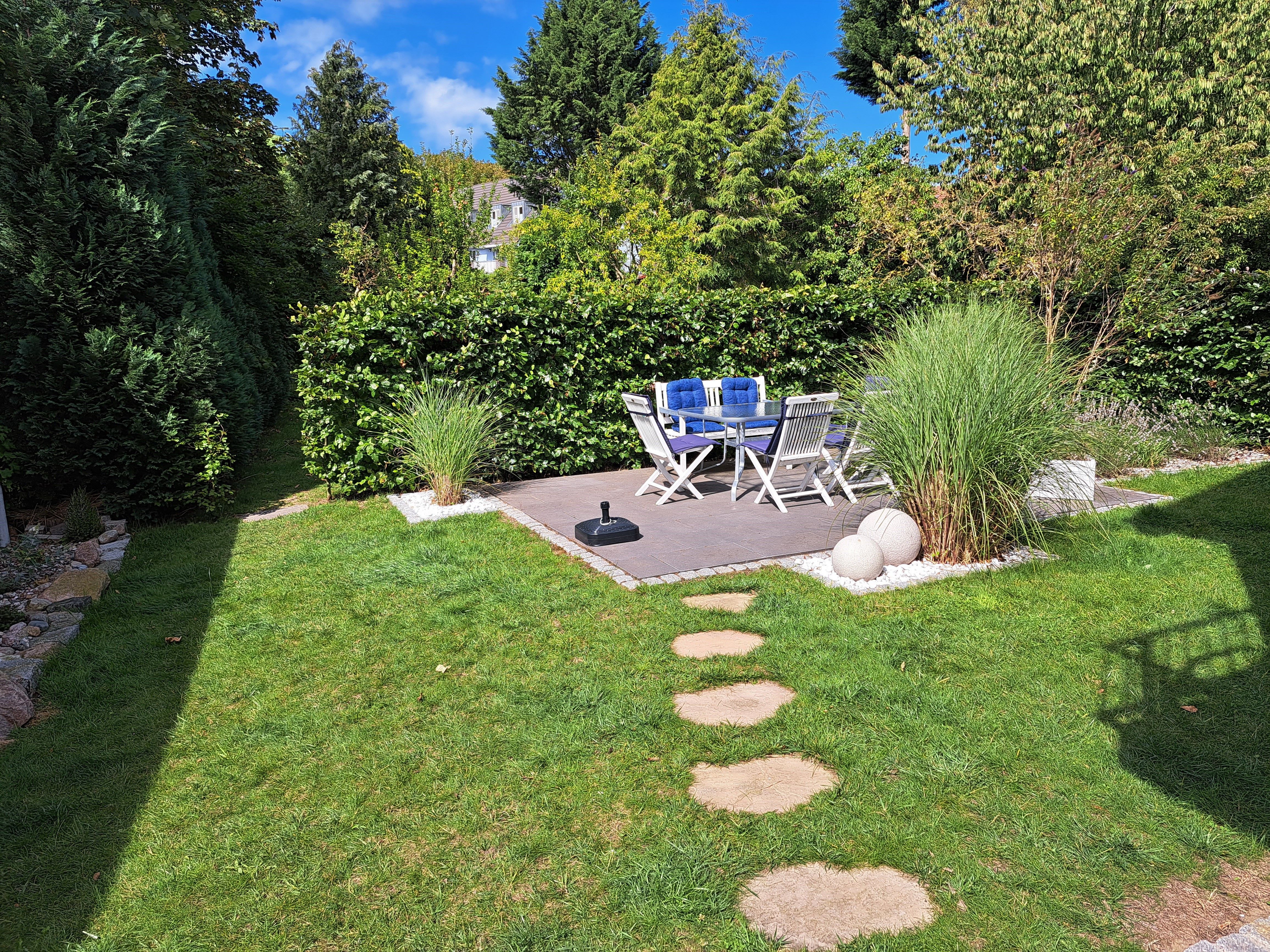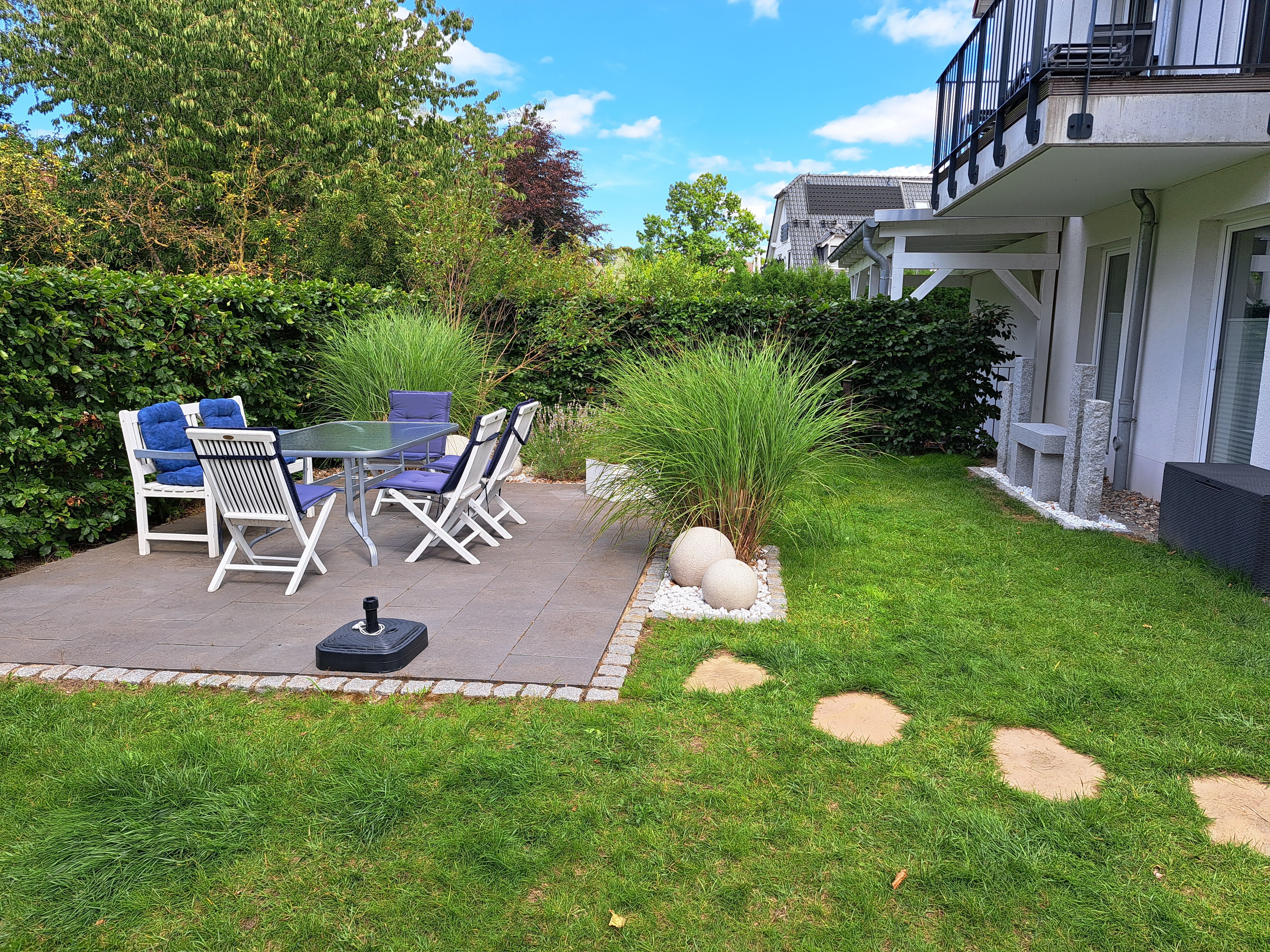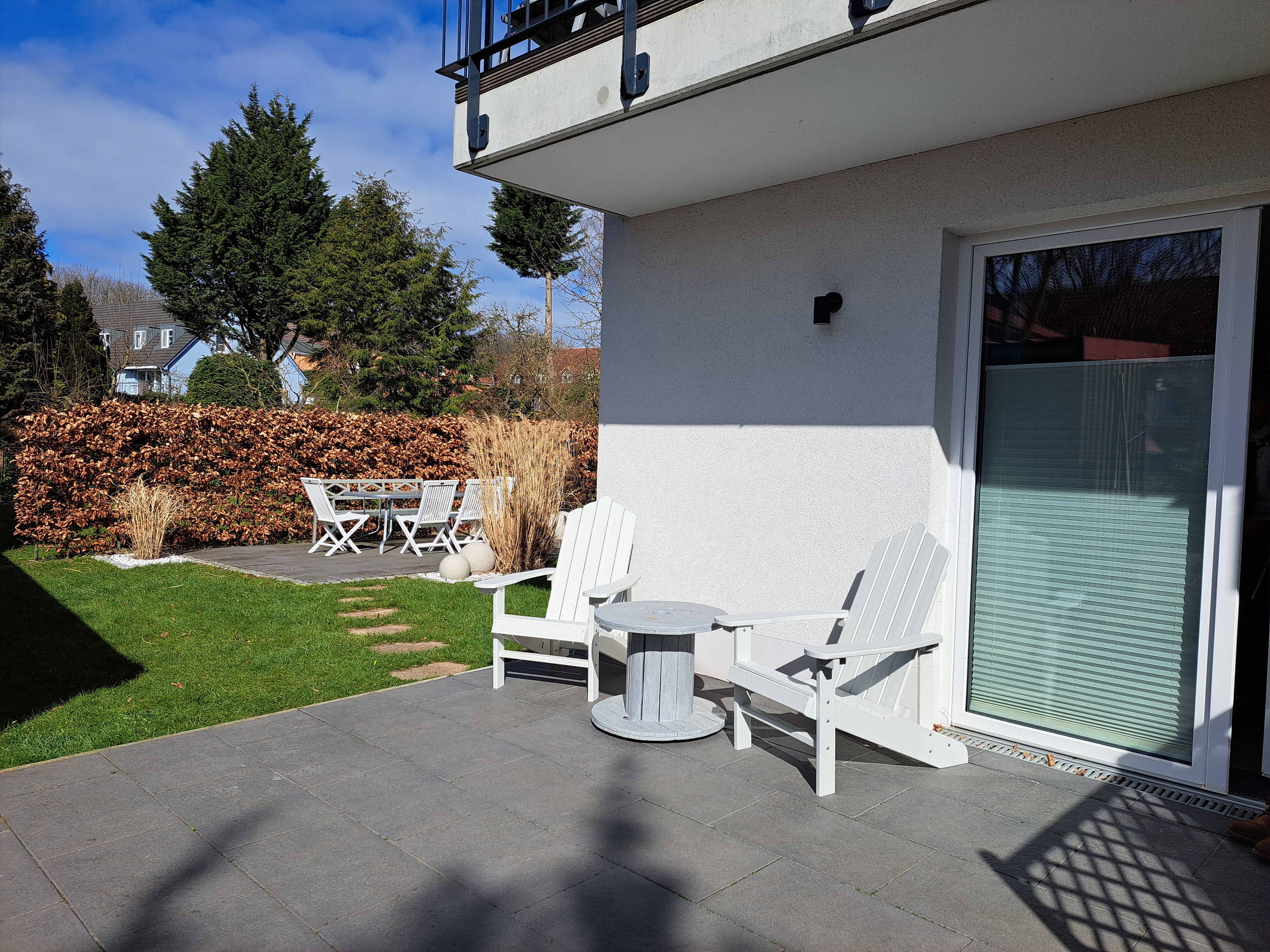 Unsere 84m² große, gemütliche Ferienwohnung im maritimen Landhausstil mit exklusiver Ausstattung befindet sich im Erdgeschoss mit eigenem Auto Stellplatz direkt vor der Haustür. Die Ferienwohnung verfügt über einen großzügigen Wohnbereich mit integrierter exklusiver Küchenzeile sowie einem komfortablen Essplatz. Insgesamt 2 Terrassen und ein eigener kleiner Garten umgeben von Obstbäumen laden zum Relaxen ein. Sie finden bei uns zwei helle, geräumige Schlafzimmer (u.a. mit hochwertigem Boxspringbett), die Platz für 2 bis maximal 5 Personen bieten. Unser großzügiges Badezimmer verfügt über eine ebenerdige große Dusche, eine Badewanne und ein WC. Für die kleinen Gäste ist ein Kinderbett, Kinderstuhl und separates Kindergeschirr vorhanden. Ein Hund darf auch mitkommen.