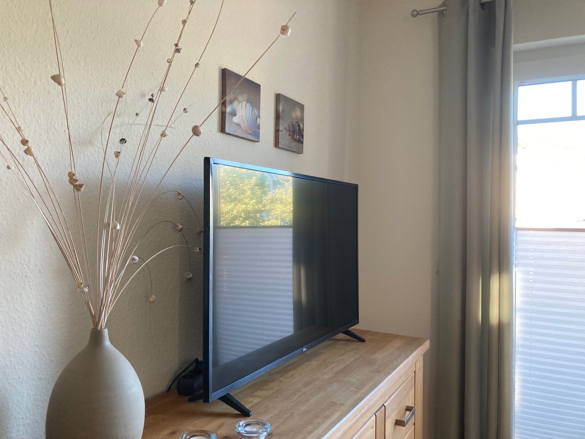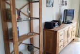 • Wohnzimmer: gemütliche Schlafcouch aus Textil 150x200 cm, TV-Flachbild, Sideboard, Tisch, Sessel,CD-Radio, Leselampe, Spiele, Bücher