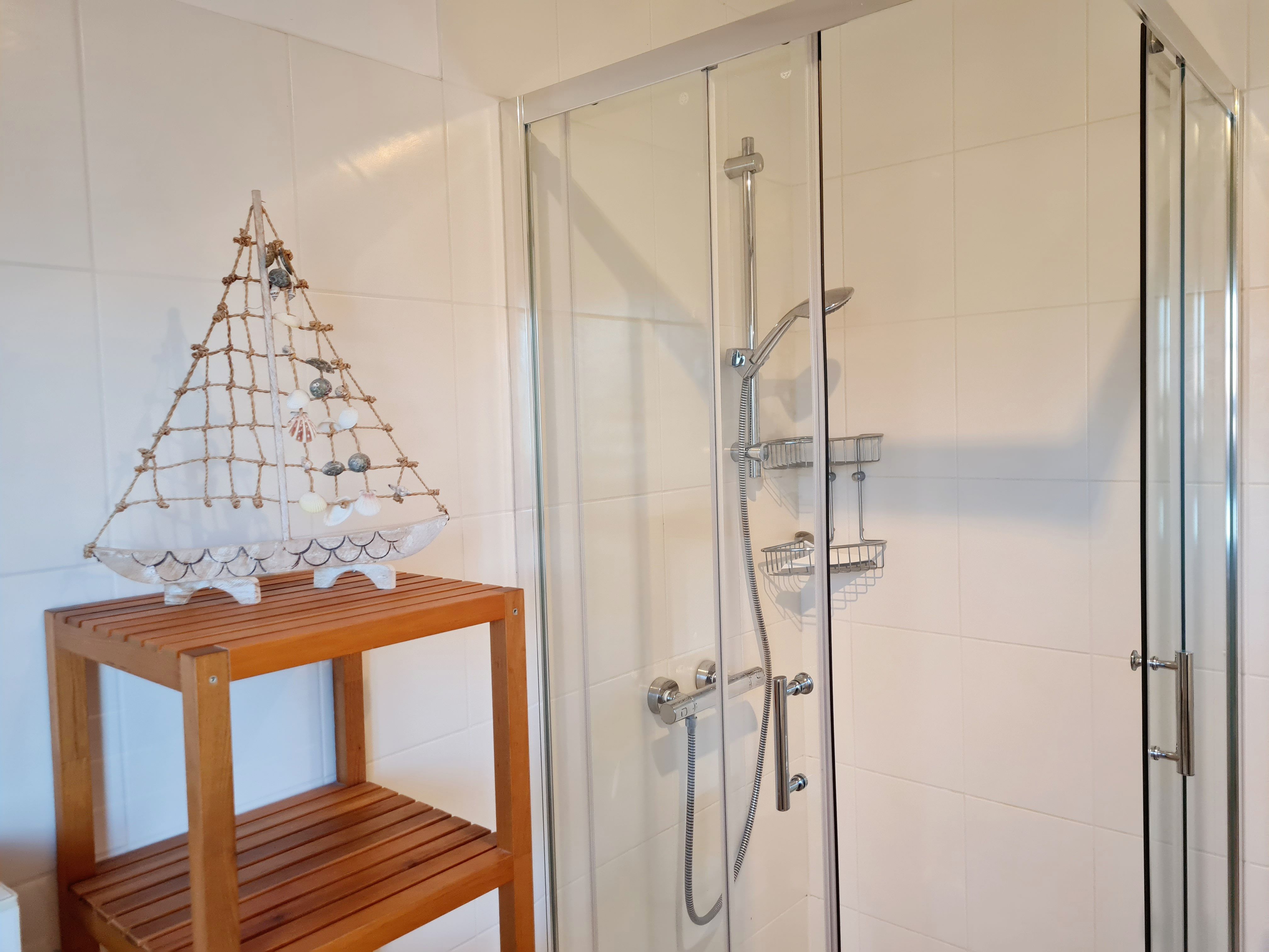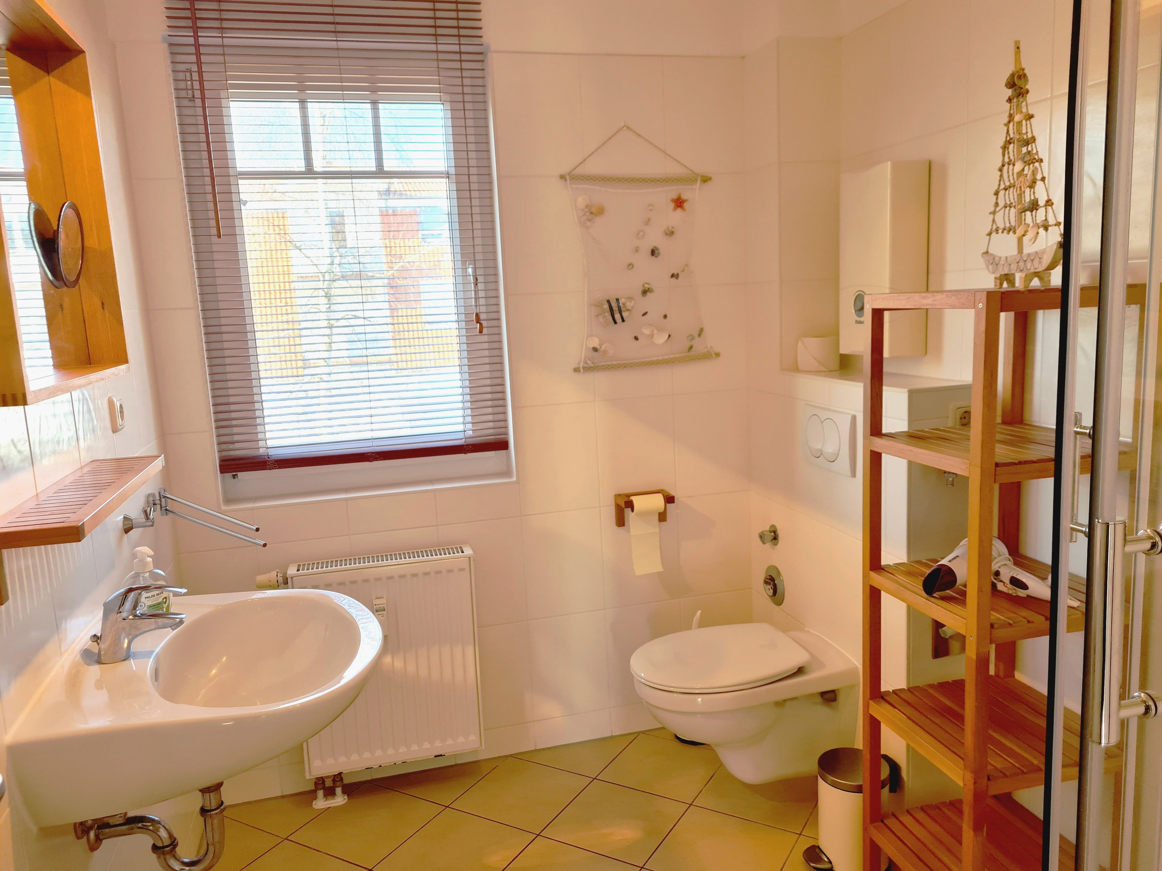 • Bad: mit Fenster, Dusche, Waschbecken, Toilette, Spiegel, Regal, Handtuchhalter, Fliegenschutz, Rollo, Fön