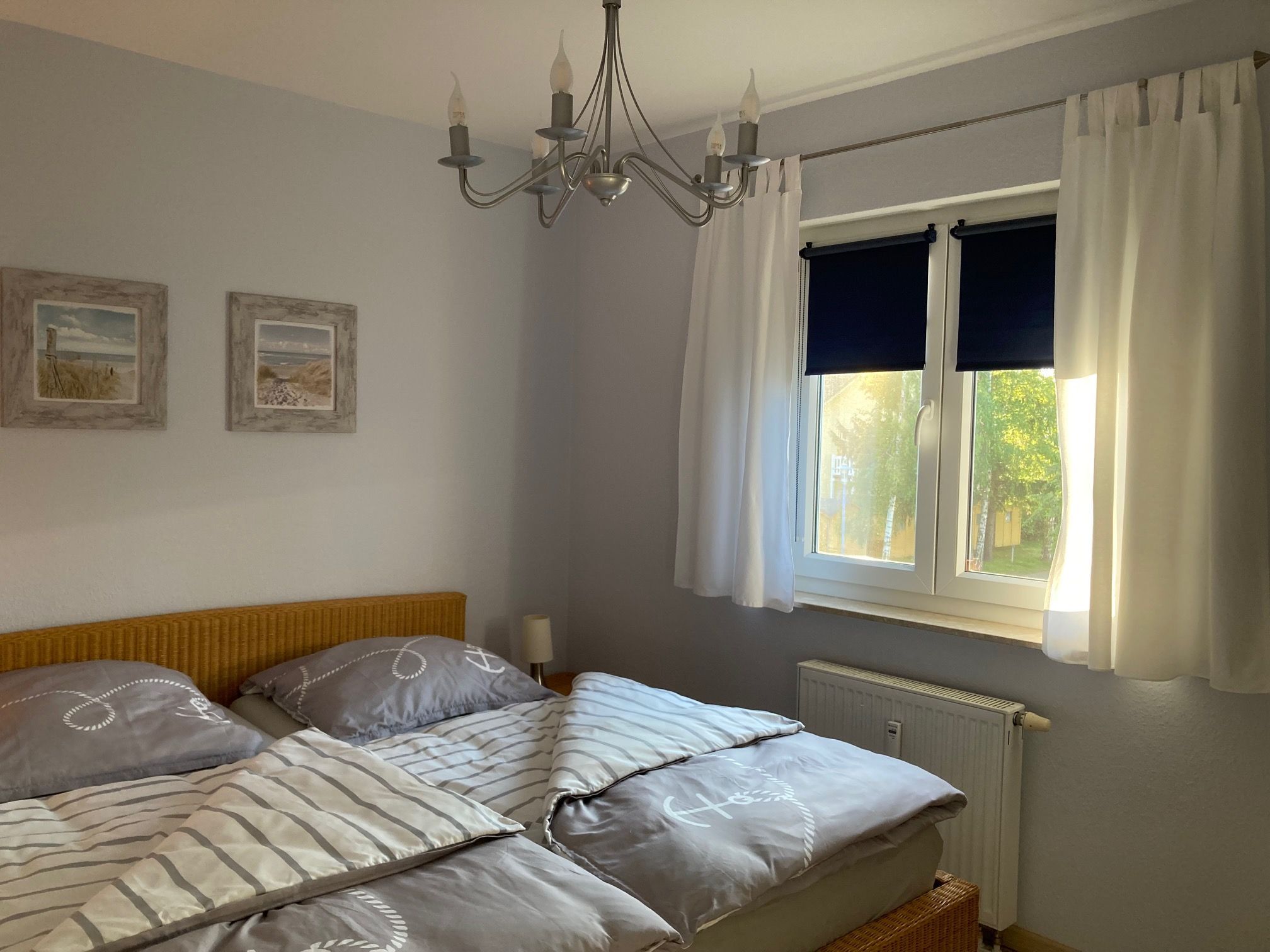 • Schlafzimmer: Doppelbett mit zwei Einzelmatratzen 90x200 m, Schrank, Nachttische + Lampen, Stuhl, Hocker, Fliegengitter an Fenster, Verdunklungsrollo