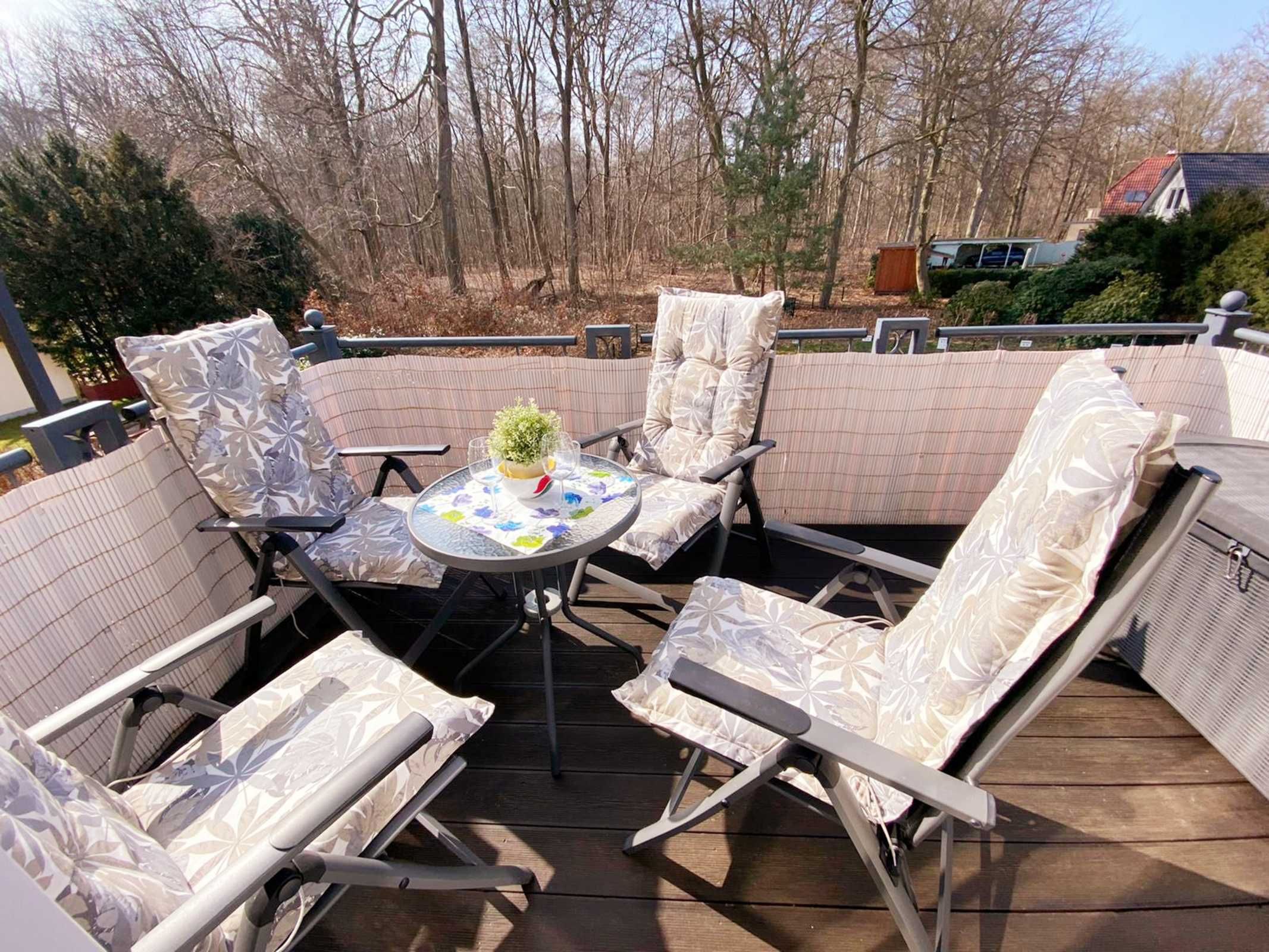 • Balkon: Ausgestattet mit 4 bequemen Hochlehnstühlen, Tisch und Sonnenschirm steht einem Frühstück oder Abendessen, oder einfach nur Relaxen, nichts im Wege. Genießen Sie den Abend auf dem schönen Südwest-Balkon! Für kältere Abende sind selbstverständlich auch wärmende Decken vorhanden.