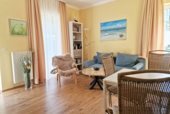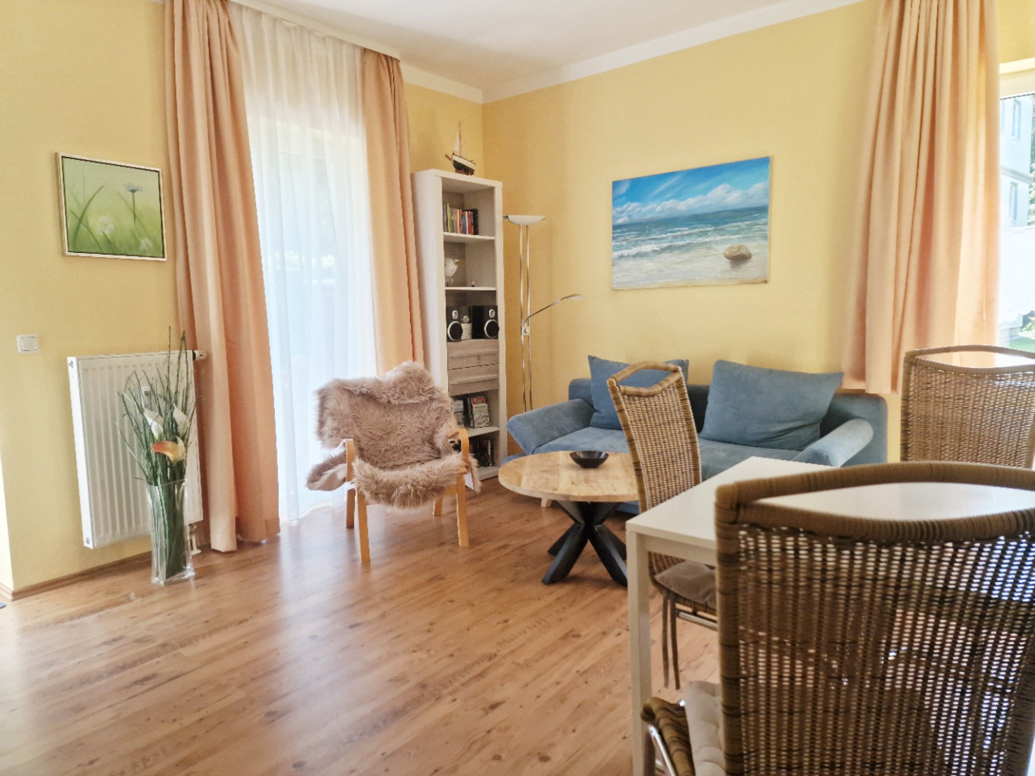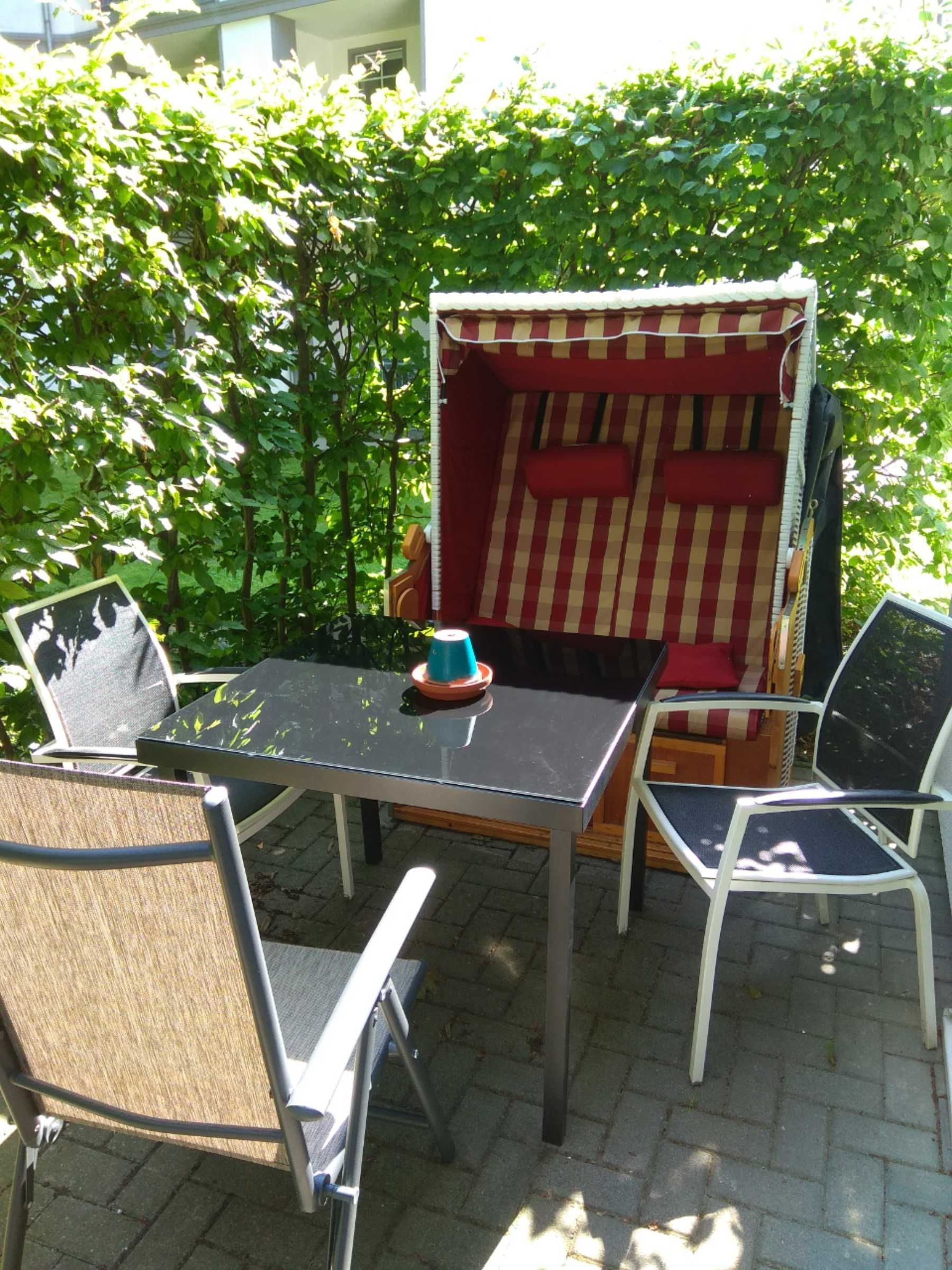 Die Terrasse - in O/S-Lage - bietet Ihnen einen wunderschönen Platz für die Einnahme Ihrer Mahlzeiten, gemütliche Stunden am Abend oder eine entspannte Mittagsruhe im komfortablen Strandkorb.
