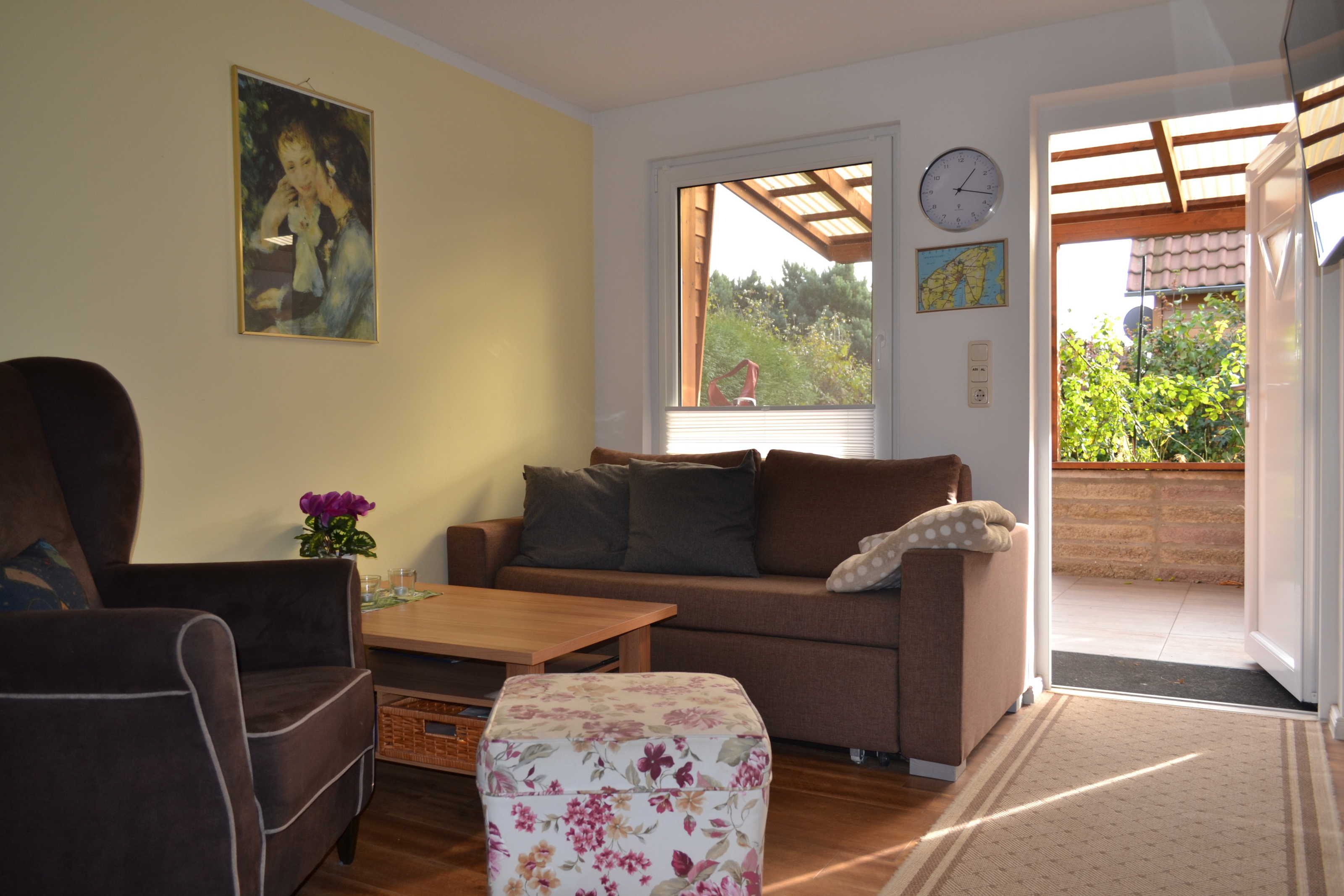 Das Häuschen verfügt über 1 Schlafzimmer mit Doppelbett und TV, 1 Wohnzimmer mit kleiner, ausziehbarer Couch für evtl. ein Kind, und ebenfalls Sat-TV, vollausgestatteter Küche, Bad mit Dusche und WC, Haarföhn, Terrassenmöbel mit Grill, 2 Gartenliegen.