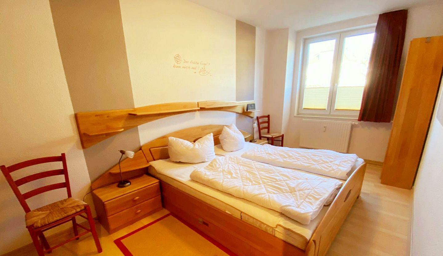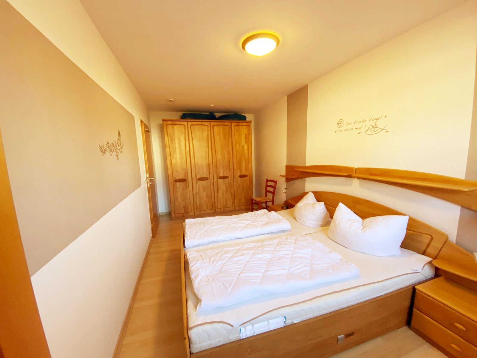 • Schlafzimmer I: Doppelbett mit 100x200cm Matratzen, Schrank, Nachttische und Lampen, Stuhl, Regal