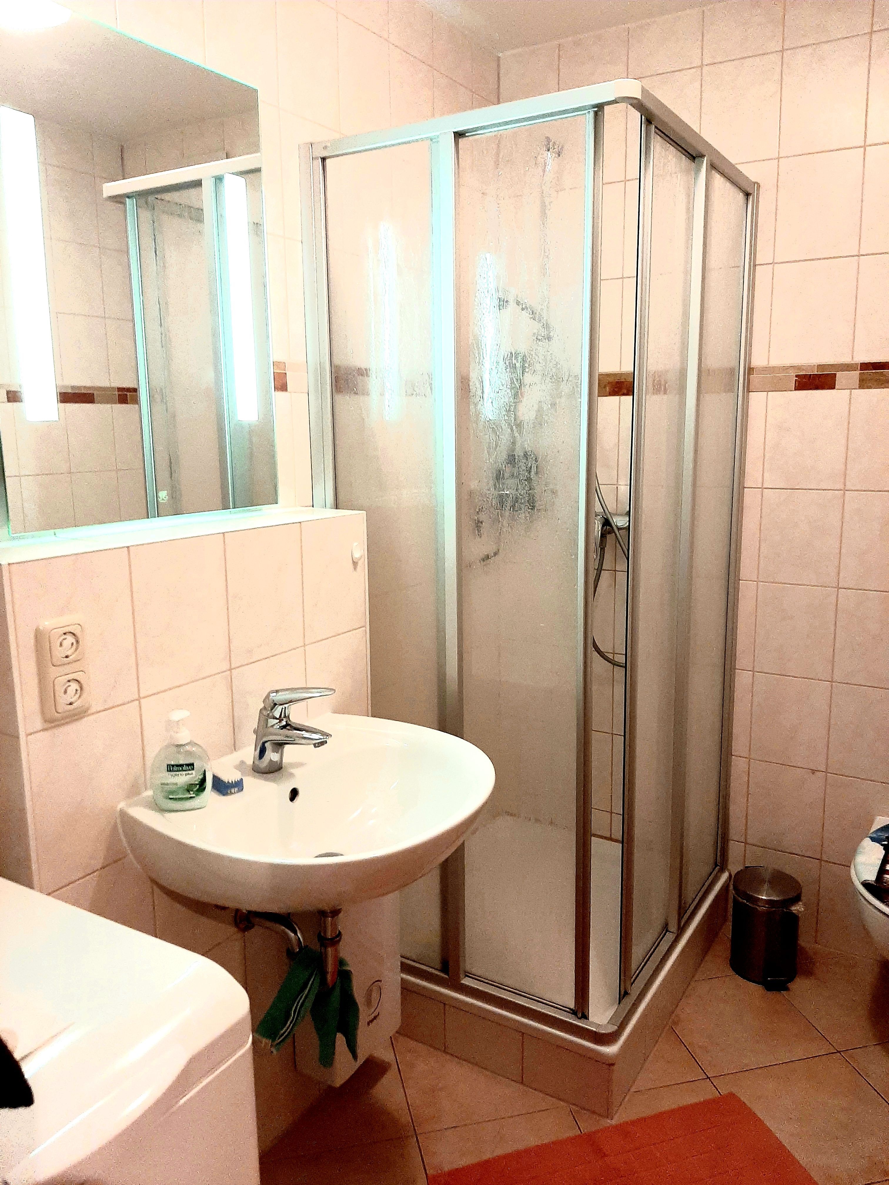 • Badezimmer: ohne Fenster, mit Dusche, WC, Waschbecken, Handtuchhaken und Waschmaschine (Wäschetrockner gegen Gebühr im Hause)