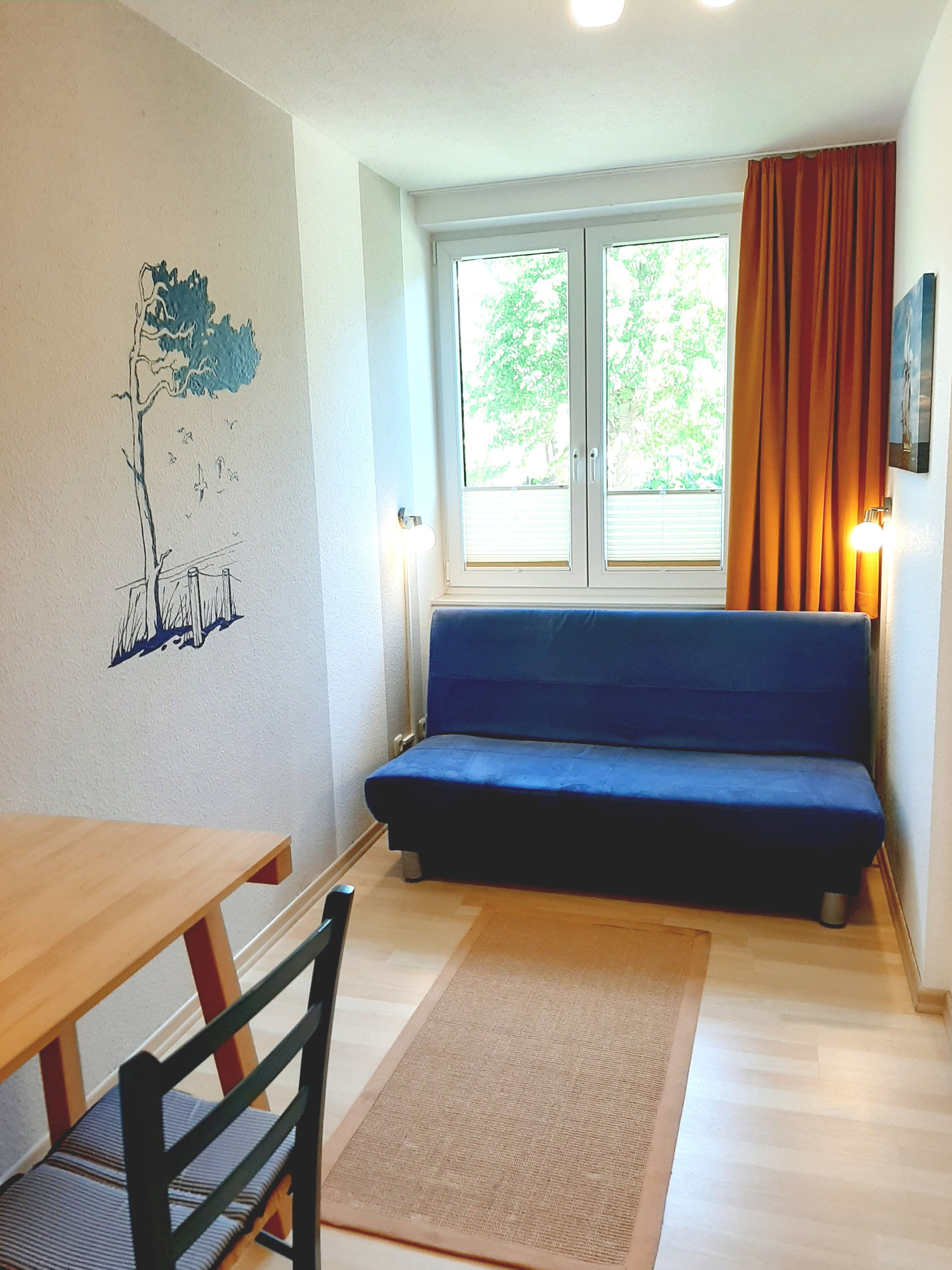 • Wohnzimmer: gemütliche Schlafcouch mit 1,50x2,00m, zwei gemütlichen Sesseln zum relaxen mit Hocker, Flachbild-TV, Tisch, Sideboard, CD-Radio, Wohnwand mit Büchern und Spielen