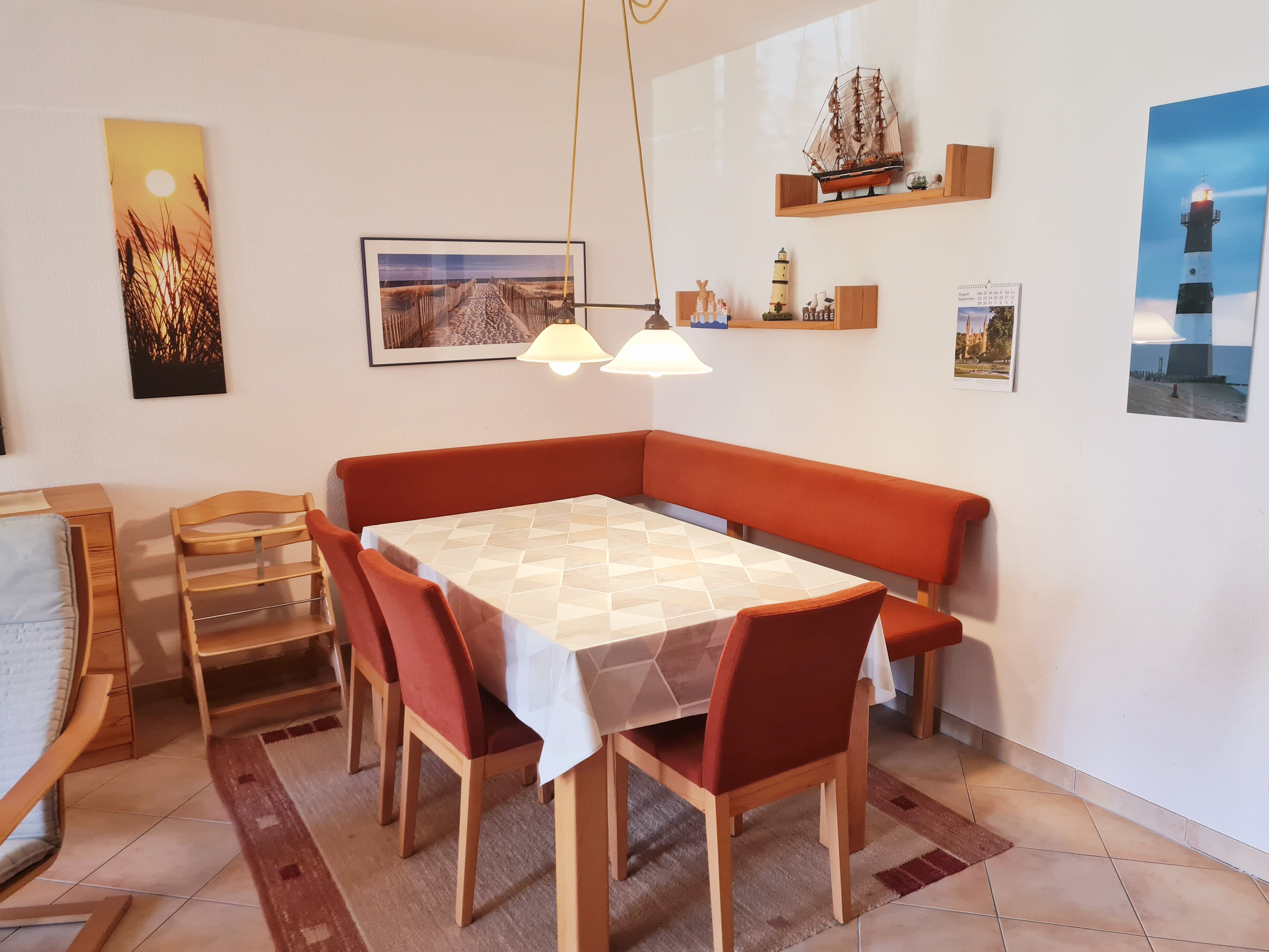 • Küche: Küche und Essbereich für 6 Personen, offen zum Wohnzimmer, komplett eingerichtete Einbauküche mit Backofen, Ceranfeld, Toaster, Kaffeemaschine, Wasserkocher, Kühlschrank mit Gefrierfach, Geschirrspüler, Mikrowelle