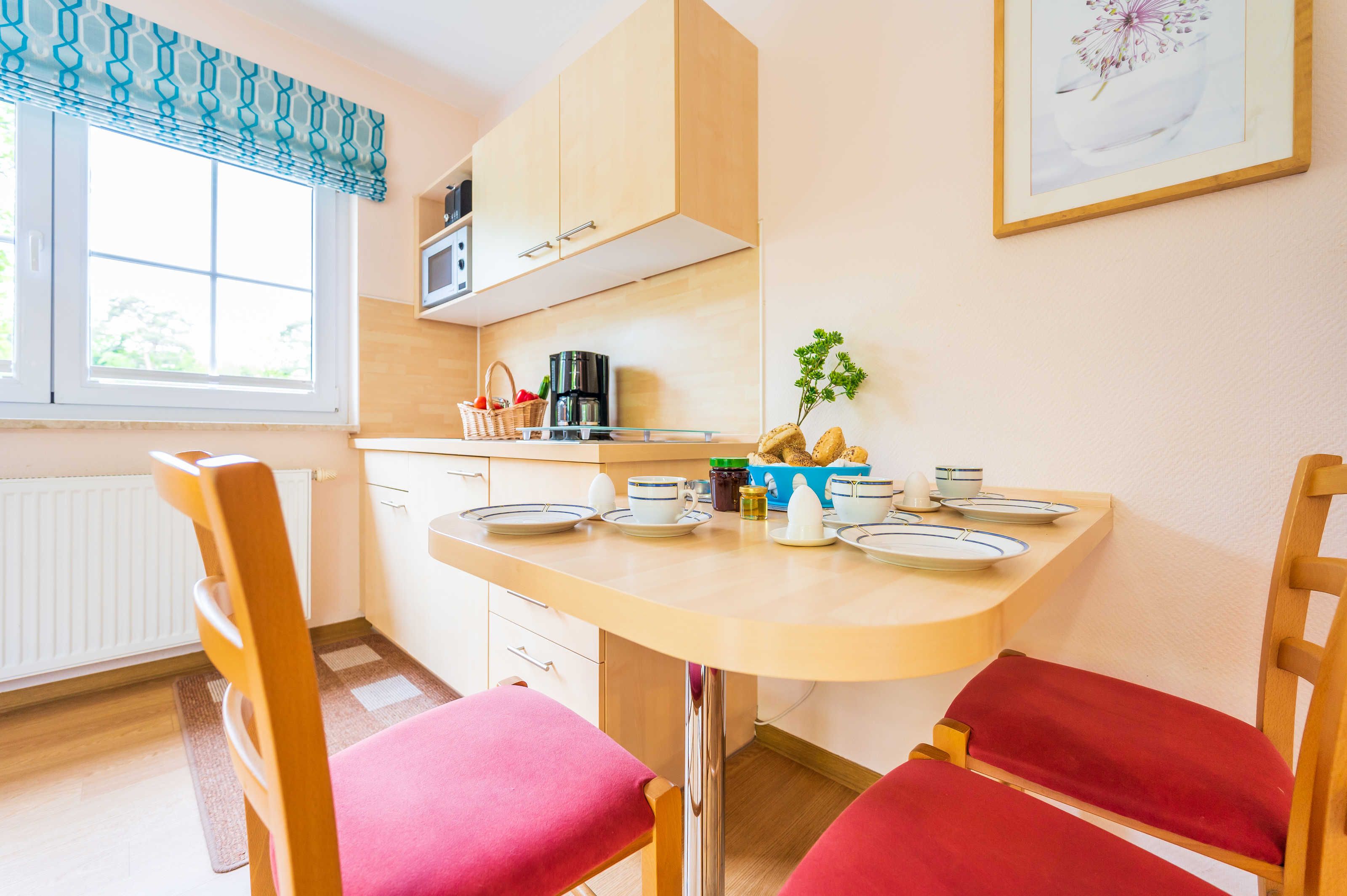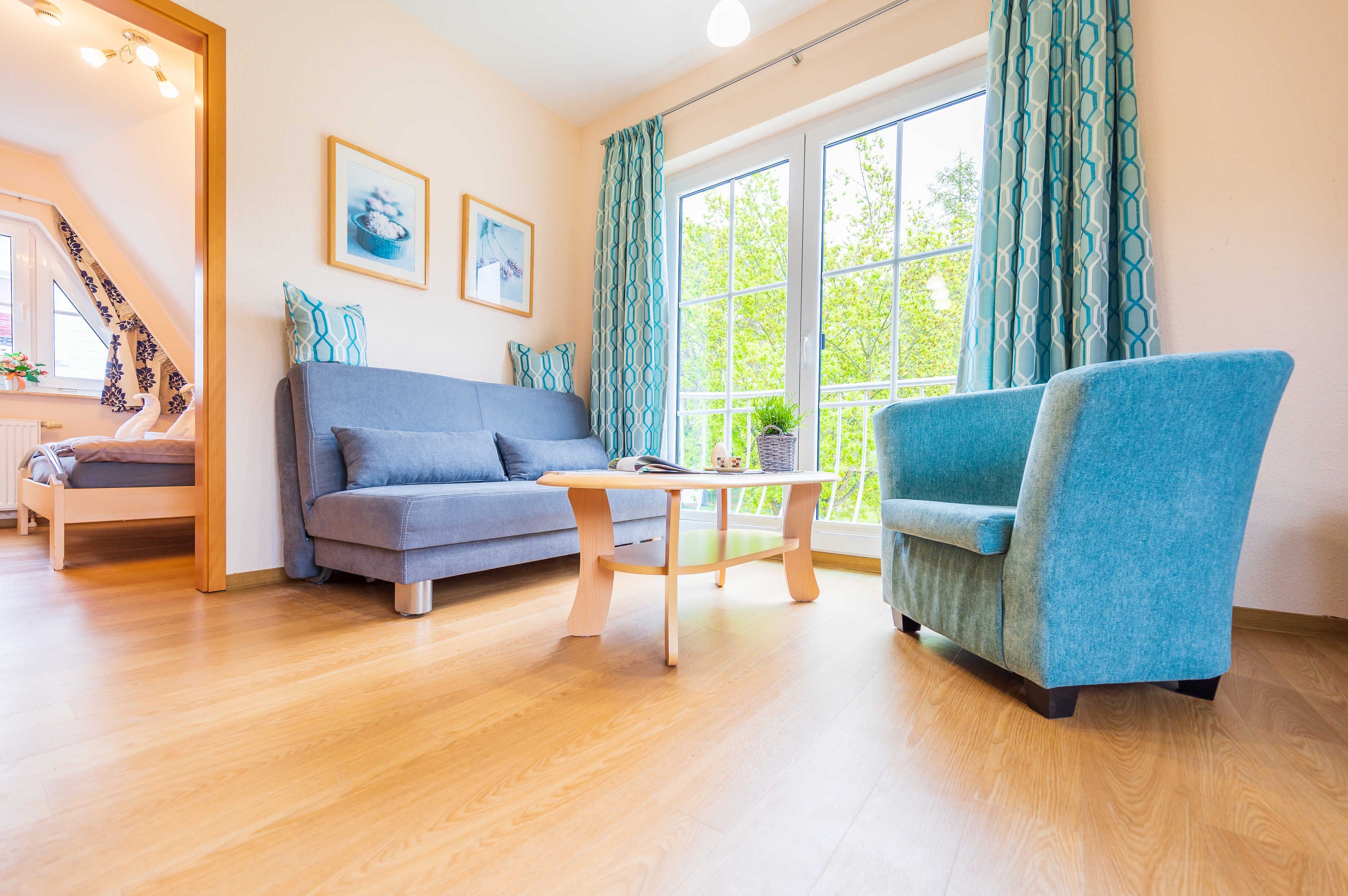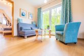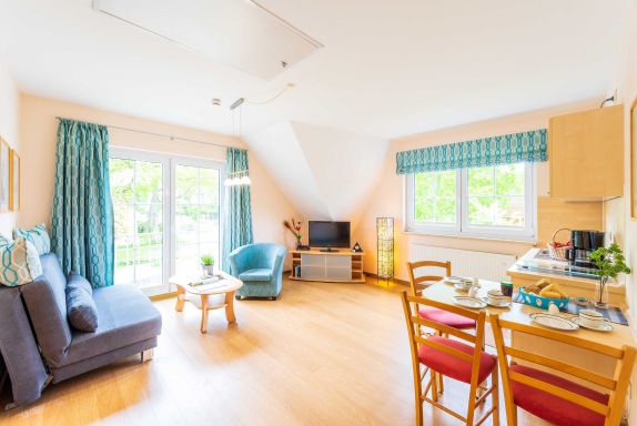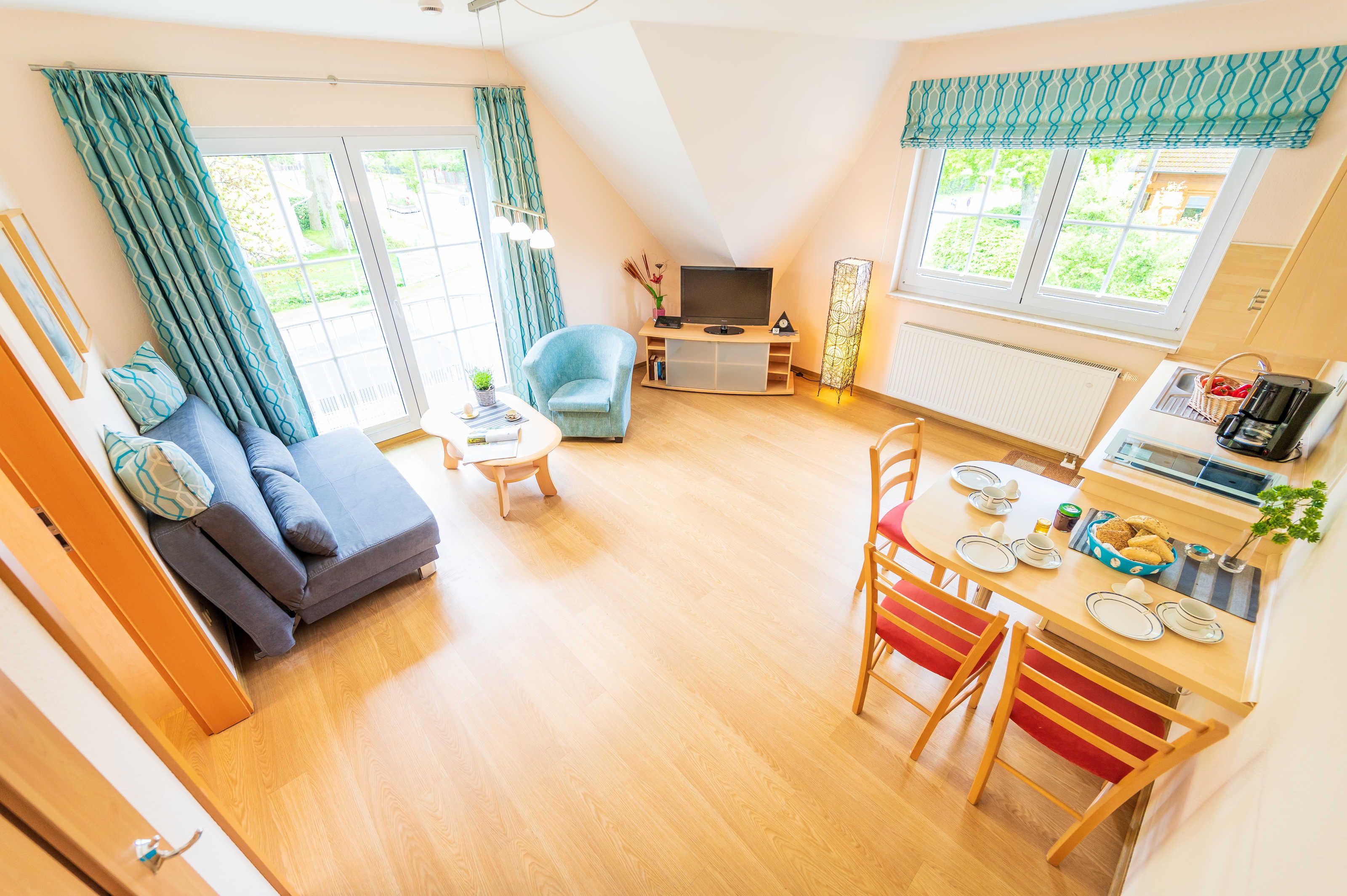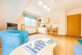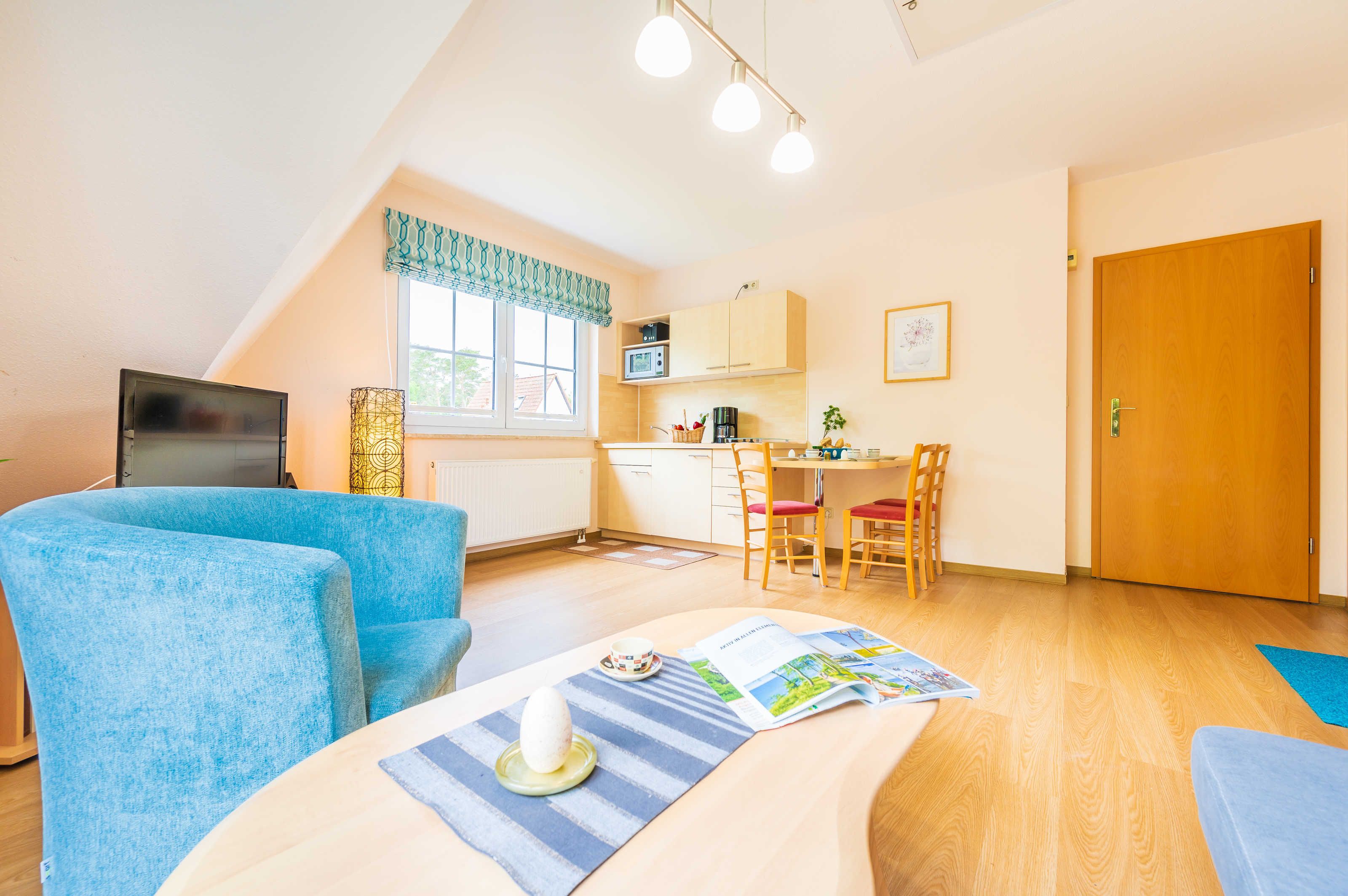 Das Nichtraucher-Appartement 1 im 1.OG/DG, ist individuell sehr wohnlich und gemütlich eingerichtet. Die ca 30 m² große Wohnung ist für max. 2 Personen ausgerichtet und verfügt über einen Wohnraum und Schlafraum sowie DU/WC. Im Wohnbereich befindet sich eine bequeme Couch und Sessel ,TV, Eßbereich sowie eine kleine Küchenzeile ausgestattet mit 2-Platten Cerankochfeld,Kühlschrank,Microwelle und diversen Kleingeräten. Schlafraum mit Boxspringbett (1,60m x 2.00m) und Kleiderschrank. Terrasse zur gemeinsamen Nutzung. PKW-Stellplatz auf dem Grundstück. Fahrräder können in der abschließbaren Garage untergebracht werden.