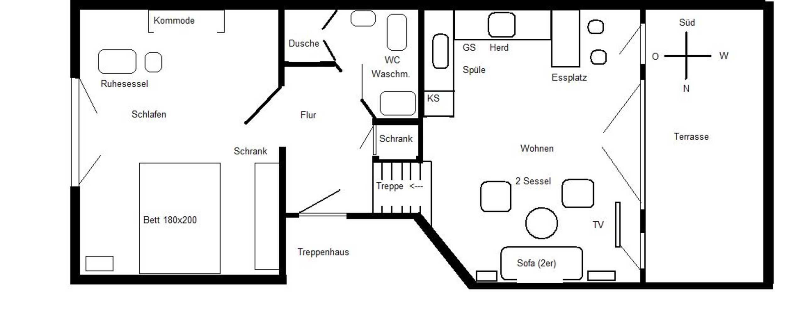 Die Ferienwohnung liegt im Dachgeschoss des Ferienhauses. Sie besteht aus Wohnzimmer mit Küchenzeile, Schlafzimmer und Tageslichtbad.