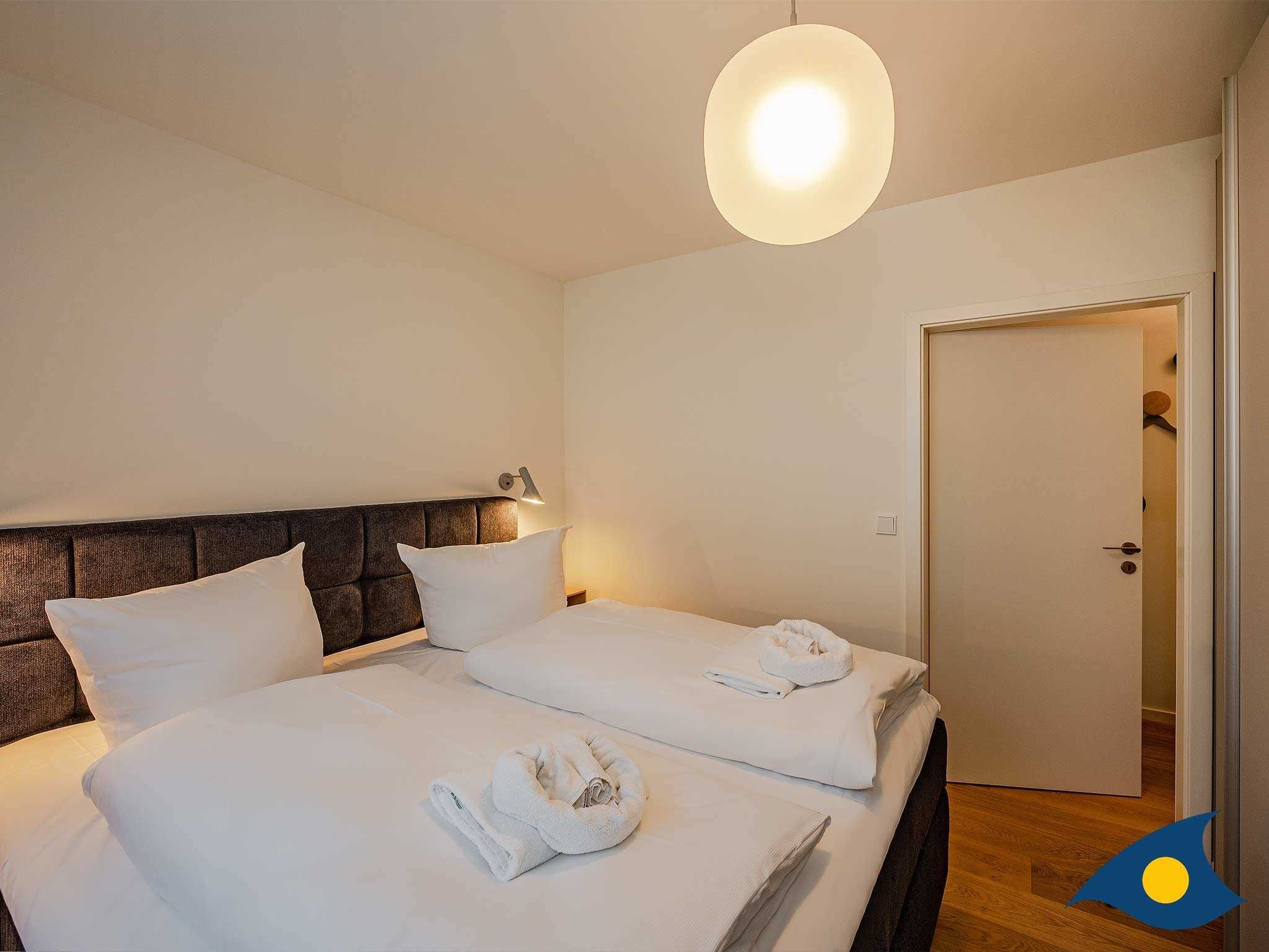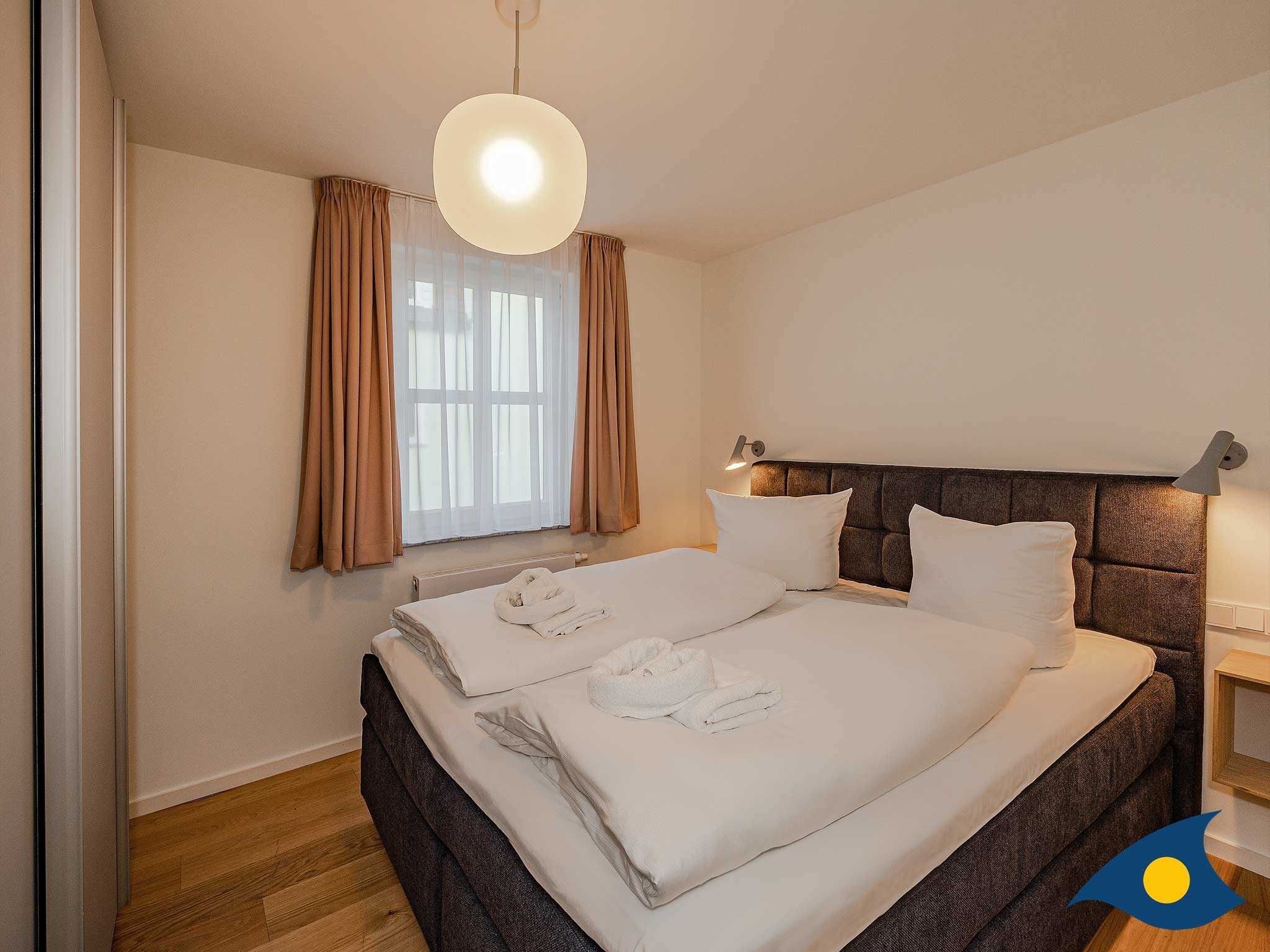 Das Schlafzimmer ist mit einem hochwertigen, bequemen Boxspringbett (Matratzenstärke M) ausgestattet. Im Kleiderschrank, der viel Stauraum für Ihre persönlichen Sachen bietet, versteckt sich ein zweiter Fernseher sowie ein kabelloser Handstaubsauger.