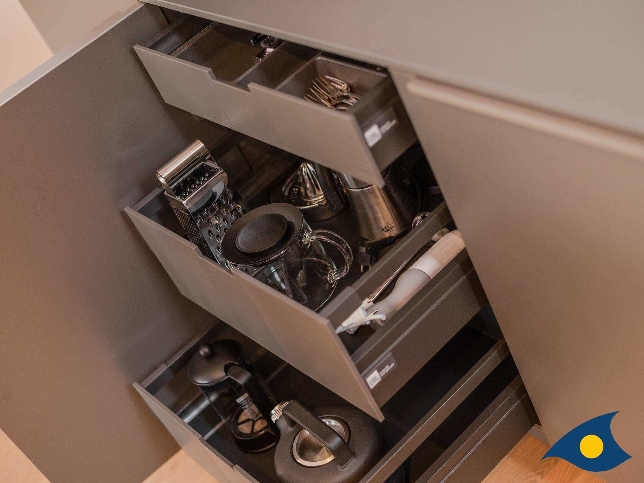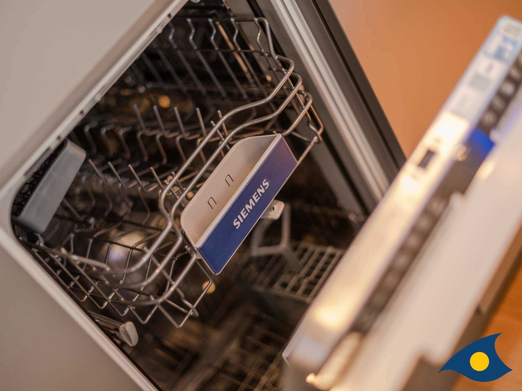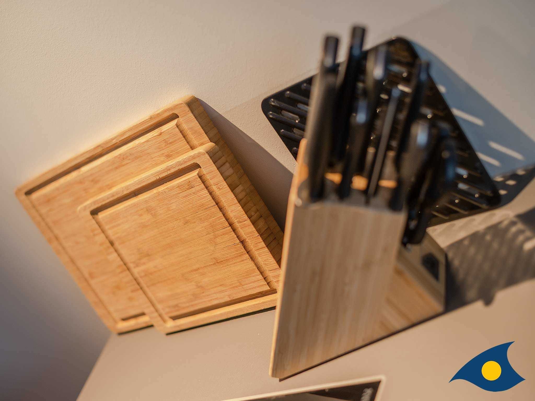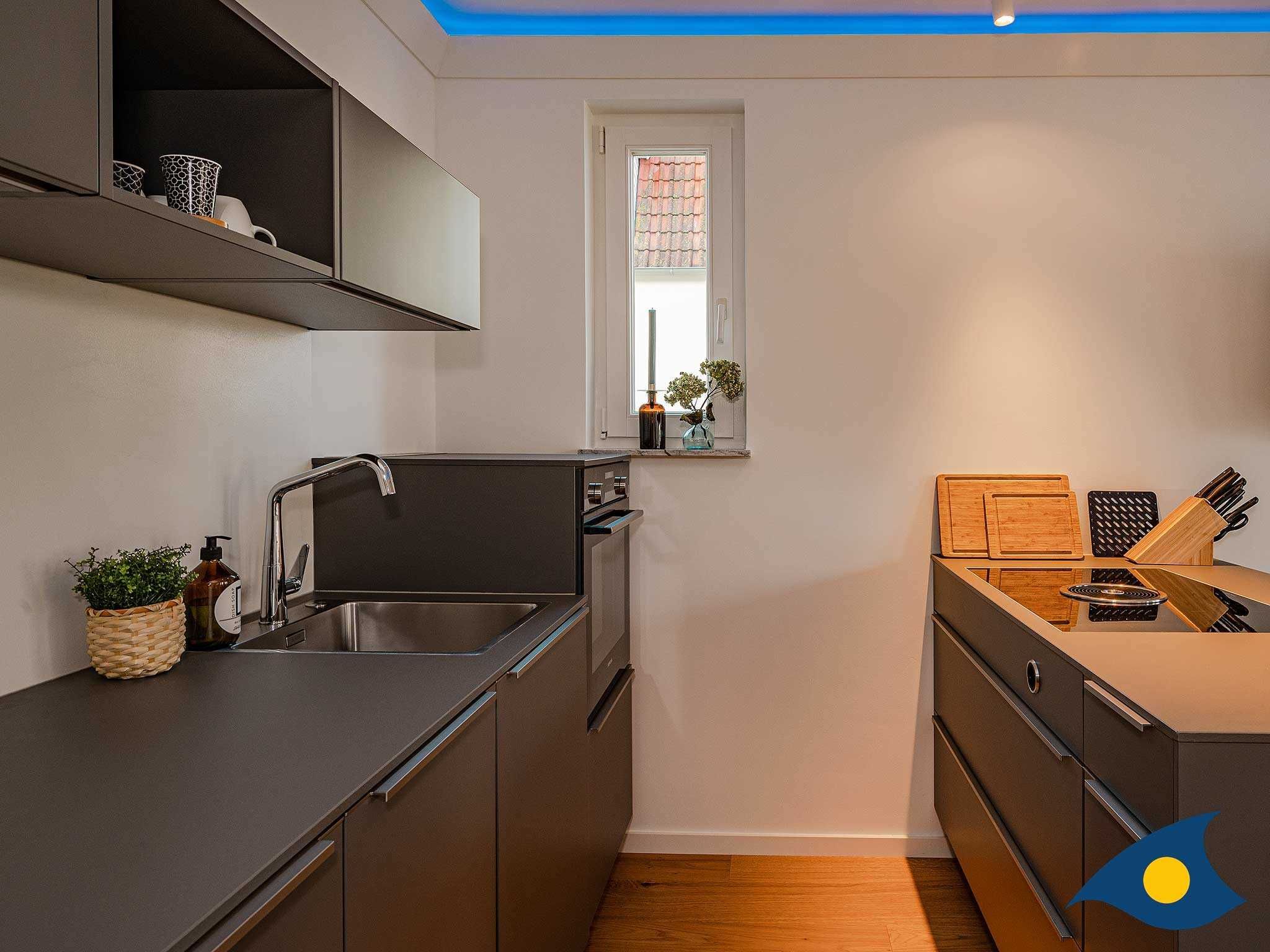 Die hochwertig ausgestatte Küchenzeile mit Geschirrspülmaschine und Kochinsel inklusive Kochfeld von Bora mit integrierter Abzugshaube lässt das Herz von Hobbyköchen höher schlagen.