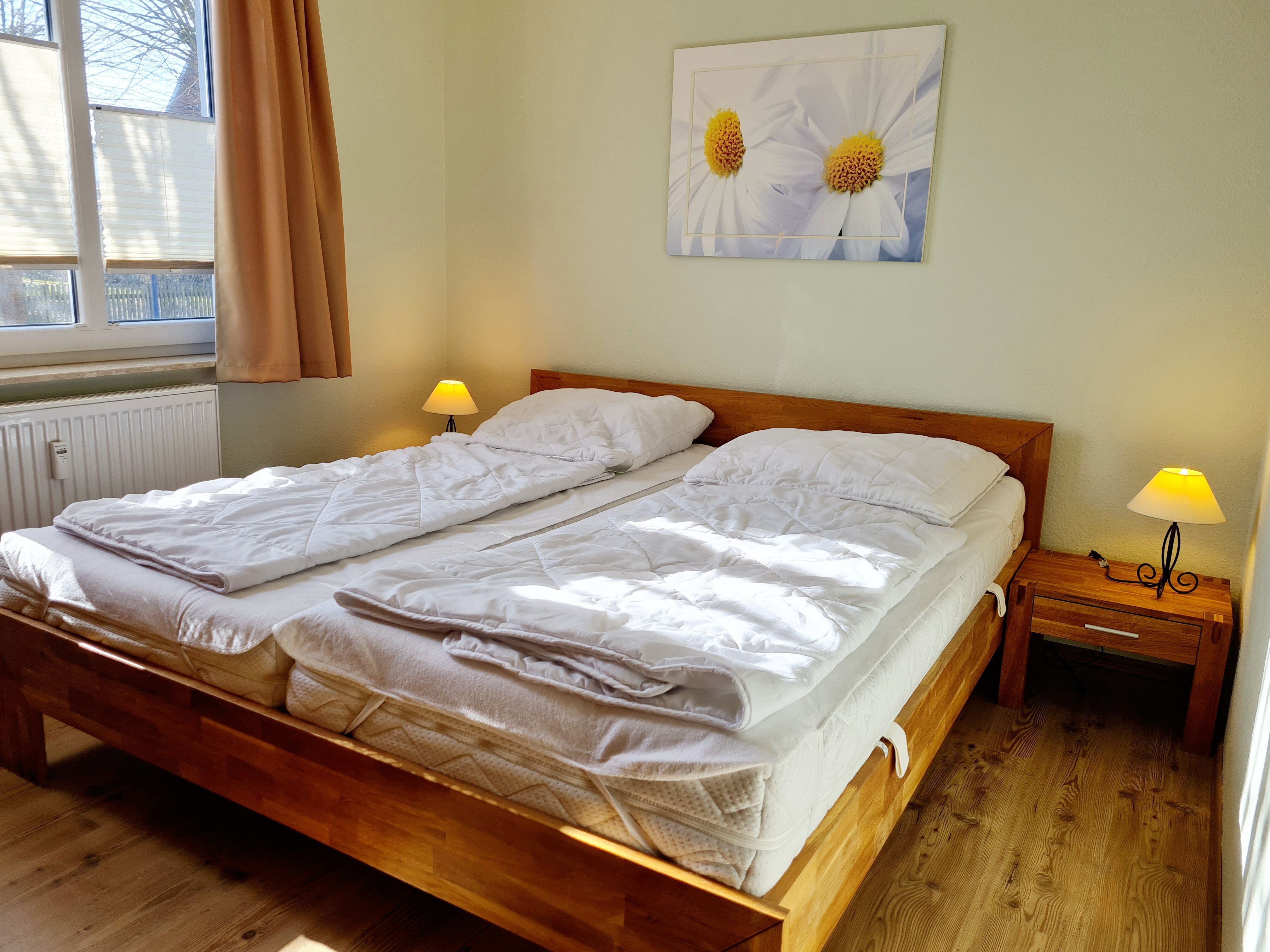 • Schlafzimmer: Doppelbett mit zwei Einzelmatratzen 90x200 cm, Schrank, Kommode, Nachttische, Lampen, Platz für Reisebett vorhanden