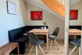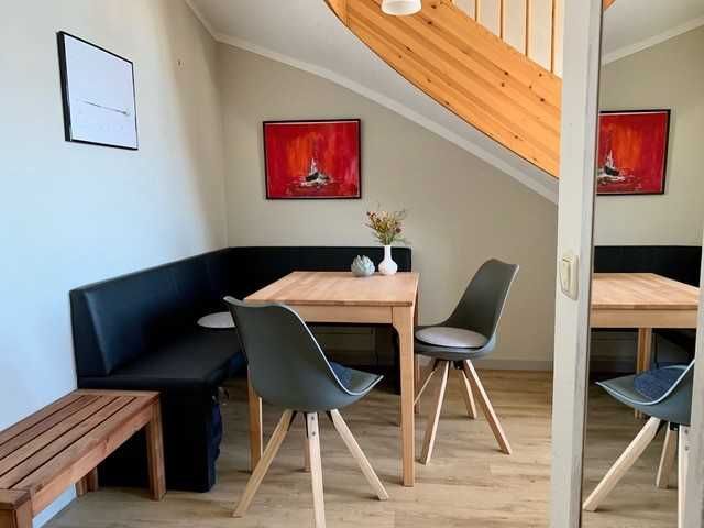 Die Maisonette-Ferienwohnung verfügt über 2 Zimmer zzgl. Wohnküche. Sie hat Meerblick von allen Zimmern. Im Untergeschoss: ein separates Wohnzimmer mit moderner Schlafcouch (1,60m breit), Flachbild-TV mit allen gängigen Programmen (inkl. Smart-Funktion) und Stereoanlage, separater wohnlicher Essbereich mit gemütlicher Eckbank und moderner Küchenzeile (komplette Ausstattung, Backofen, Spülmaschine, Radio)