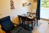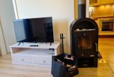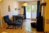 • Wohnzimmer: gemütliche Schlafcouch mit 130x200 cm, Flachbild-TV, TV-Bank, Tisch, direkter Zugang zum Westbalkon, Kaminofen, Plissees und Verdunklungsvorhänge