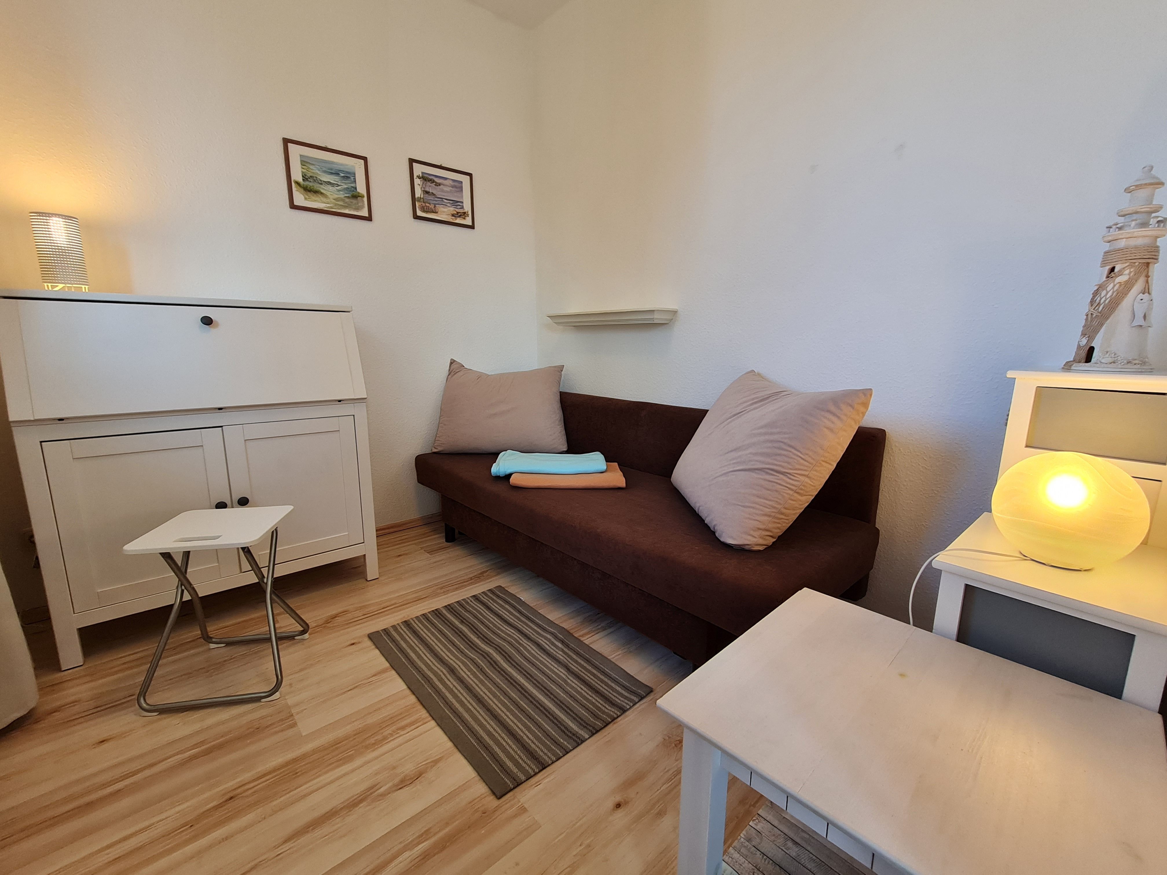 • Schlafzimmer II: Schlafcouch Textil mit 140x200 cm, Tisch, kl. Schrank, CD-Radio, Leselampe, Plissees und Verdunklung durch Vorhänge