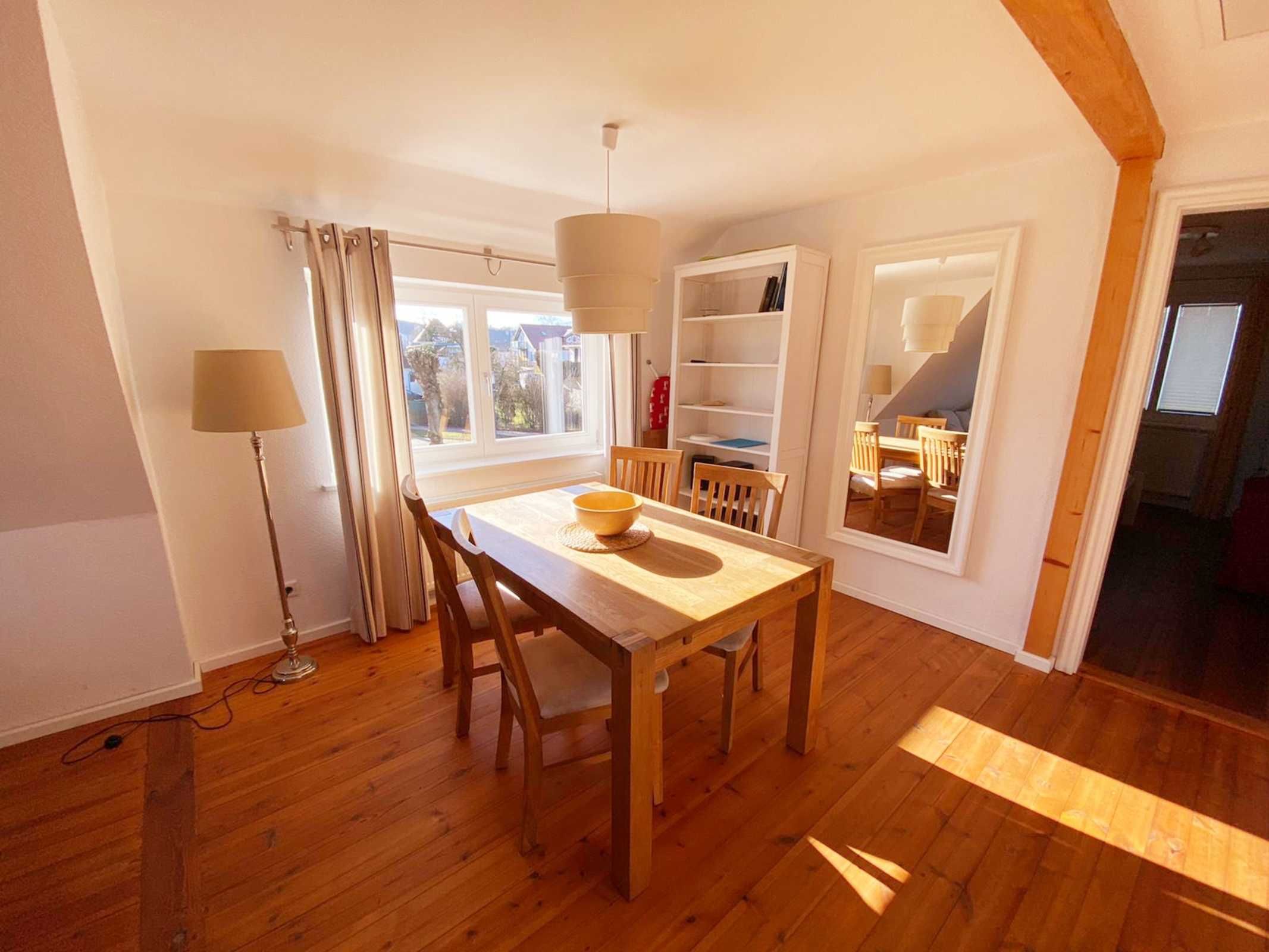 • Wohnzimmer: Gemütliche Couch, Sessel, Fußhocker, Flachbild-TV, Sideboard, Tisch, Leselampe, Radio, offen zum Essbereich für 4 Personen