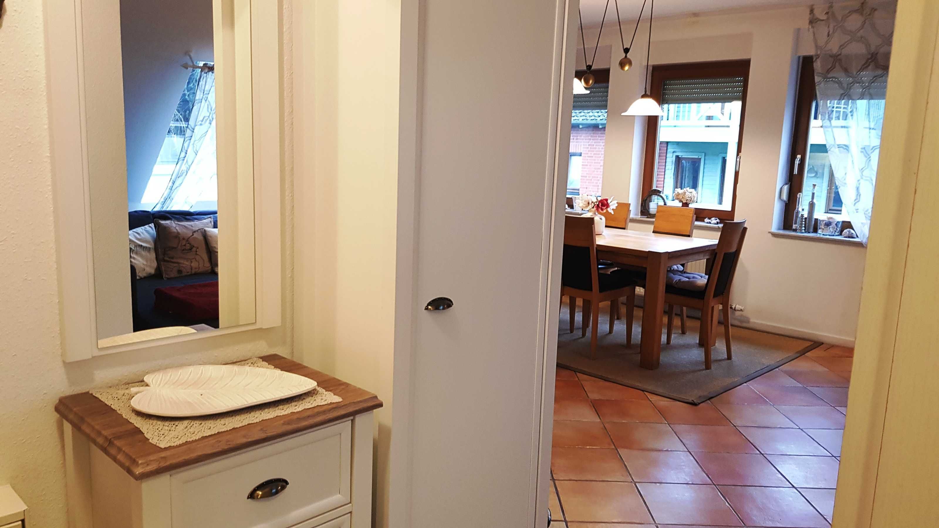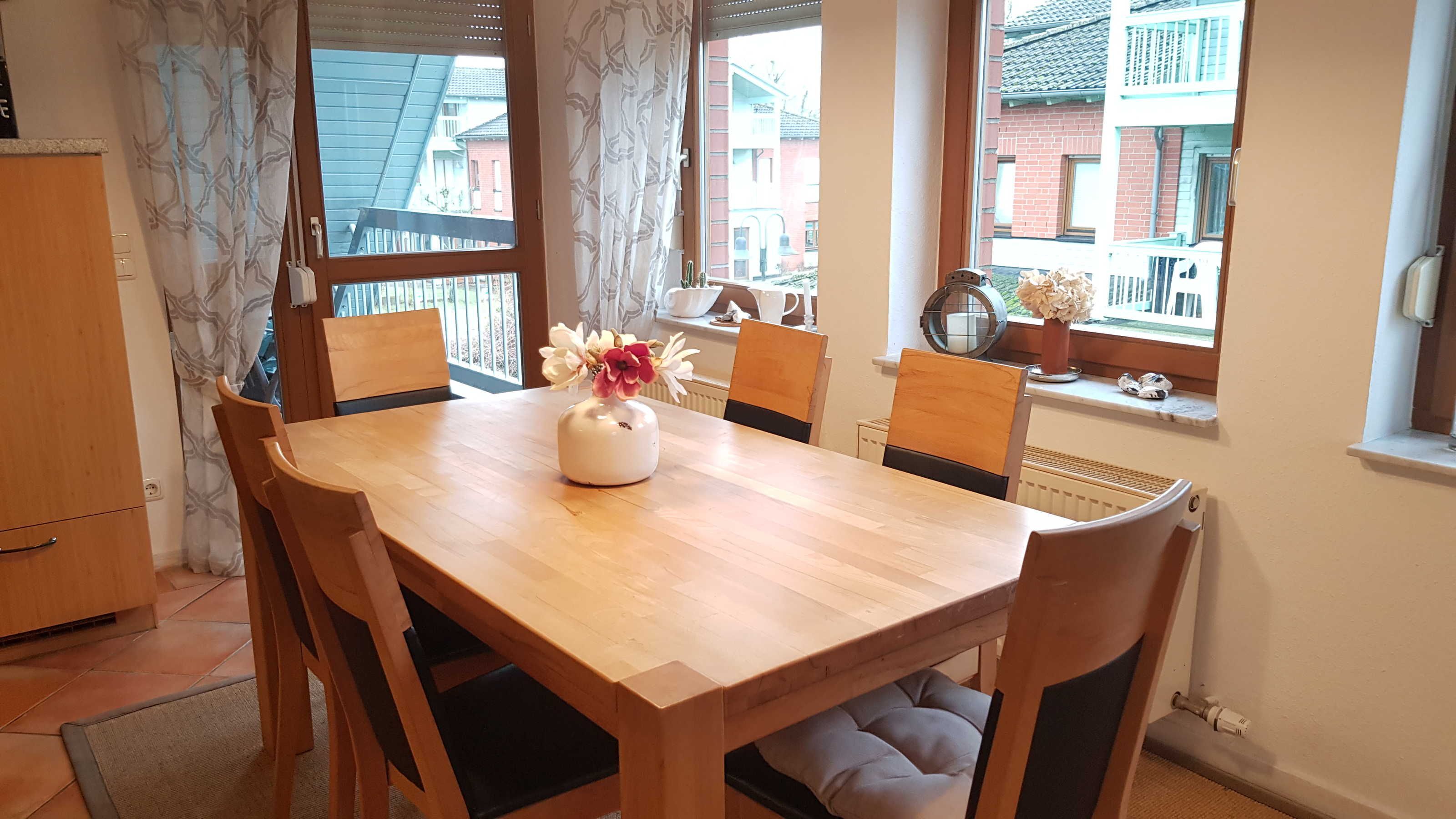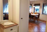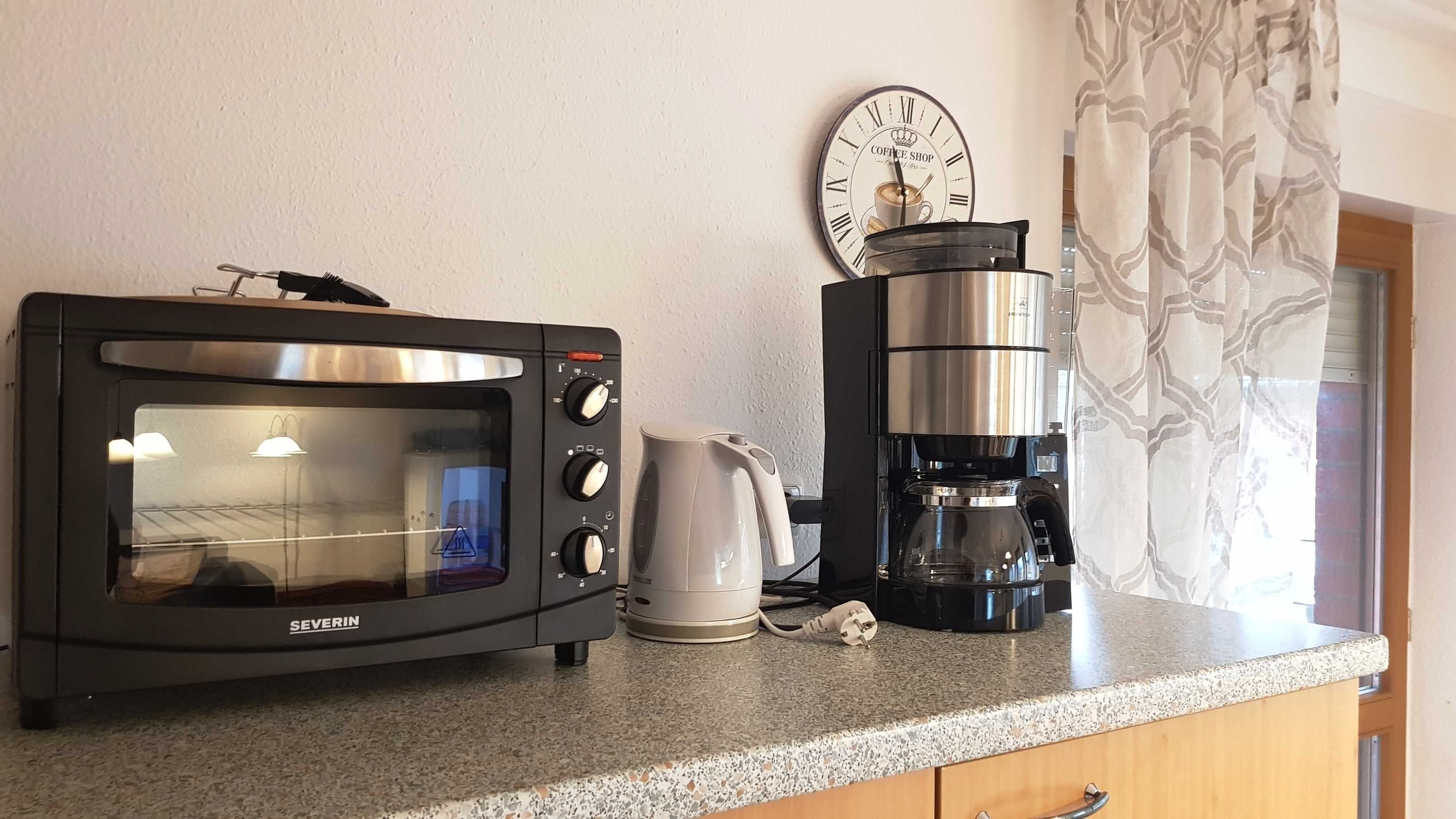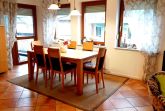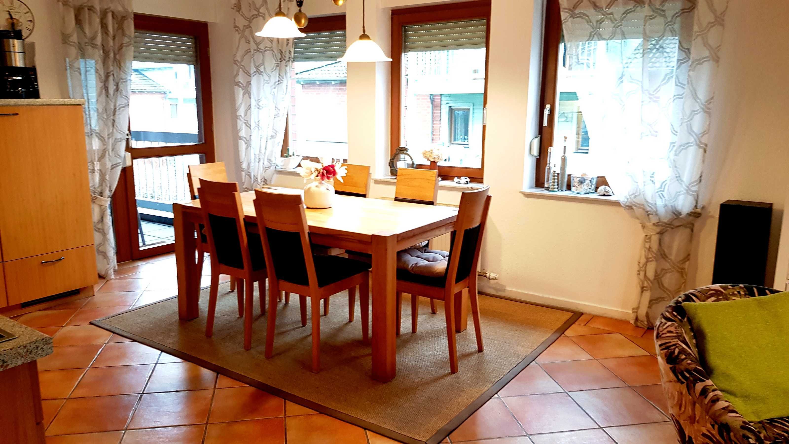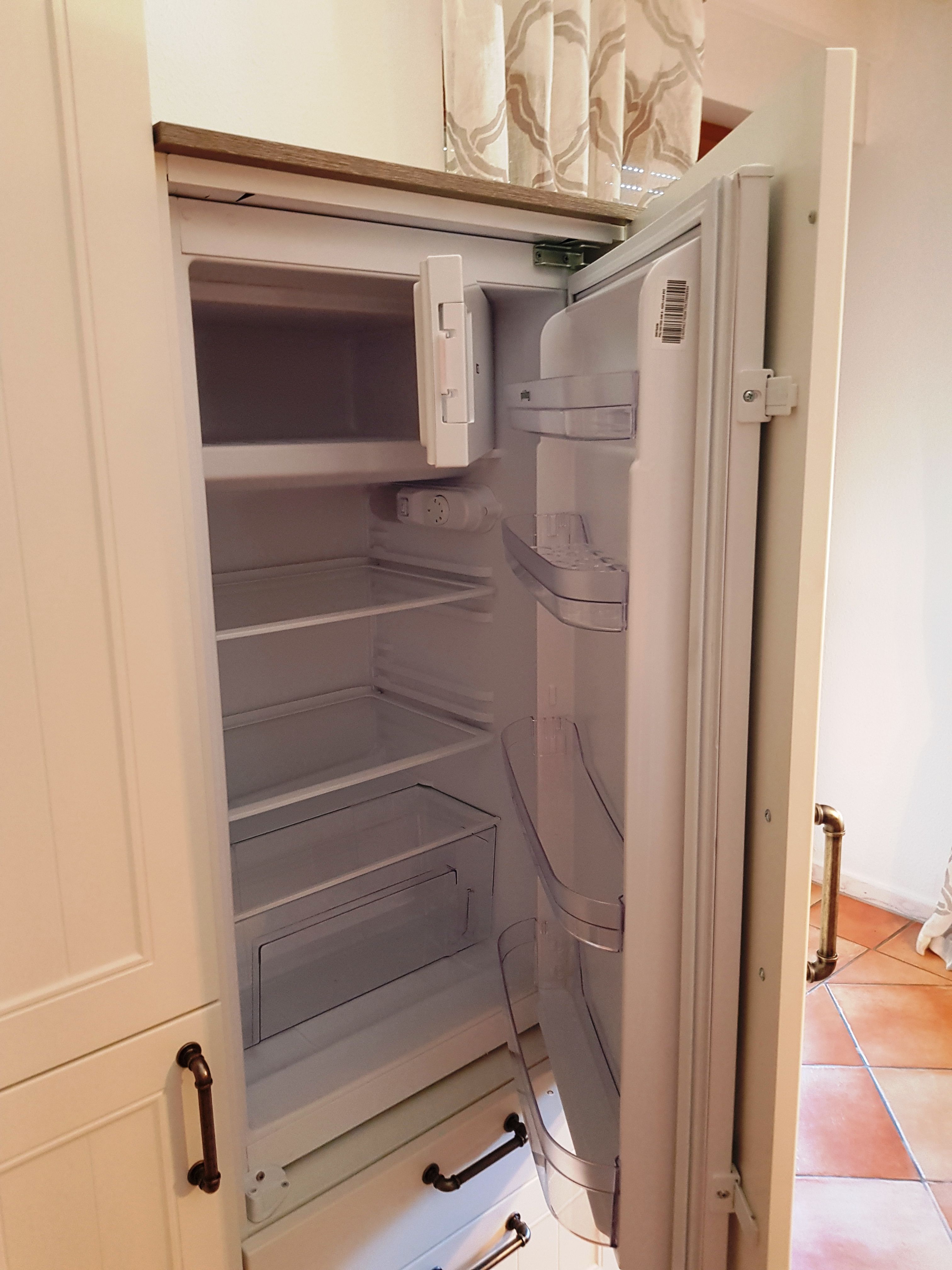 Der Essbereich schließt sich direkt an den Wohnbereich und die offene Küche an. Die Küchenausstattung beherbergt alles, was geübte Selbstversorger benötigen; einen Kühlschrank, eine Mikrowelle, ein 4-Platten-Cerankochfeld und eine Geschirrspülmaschine.