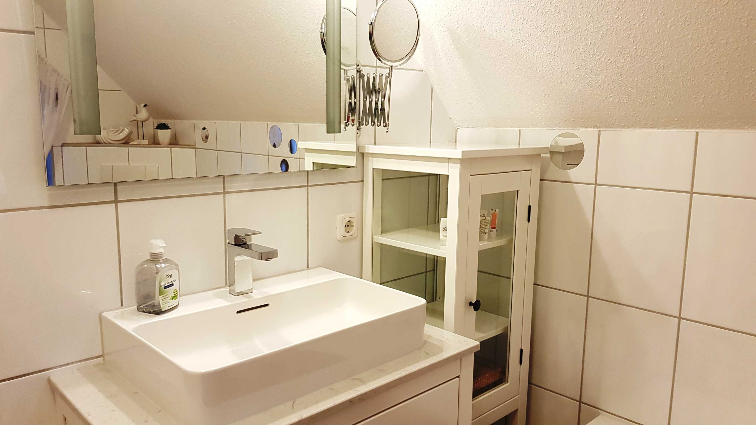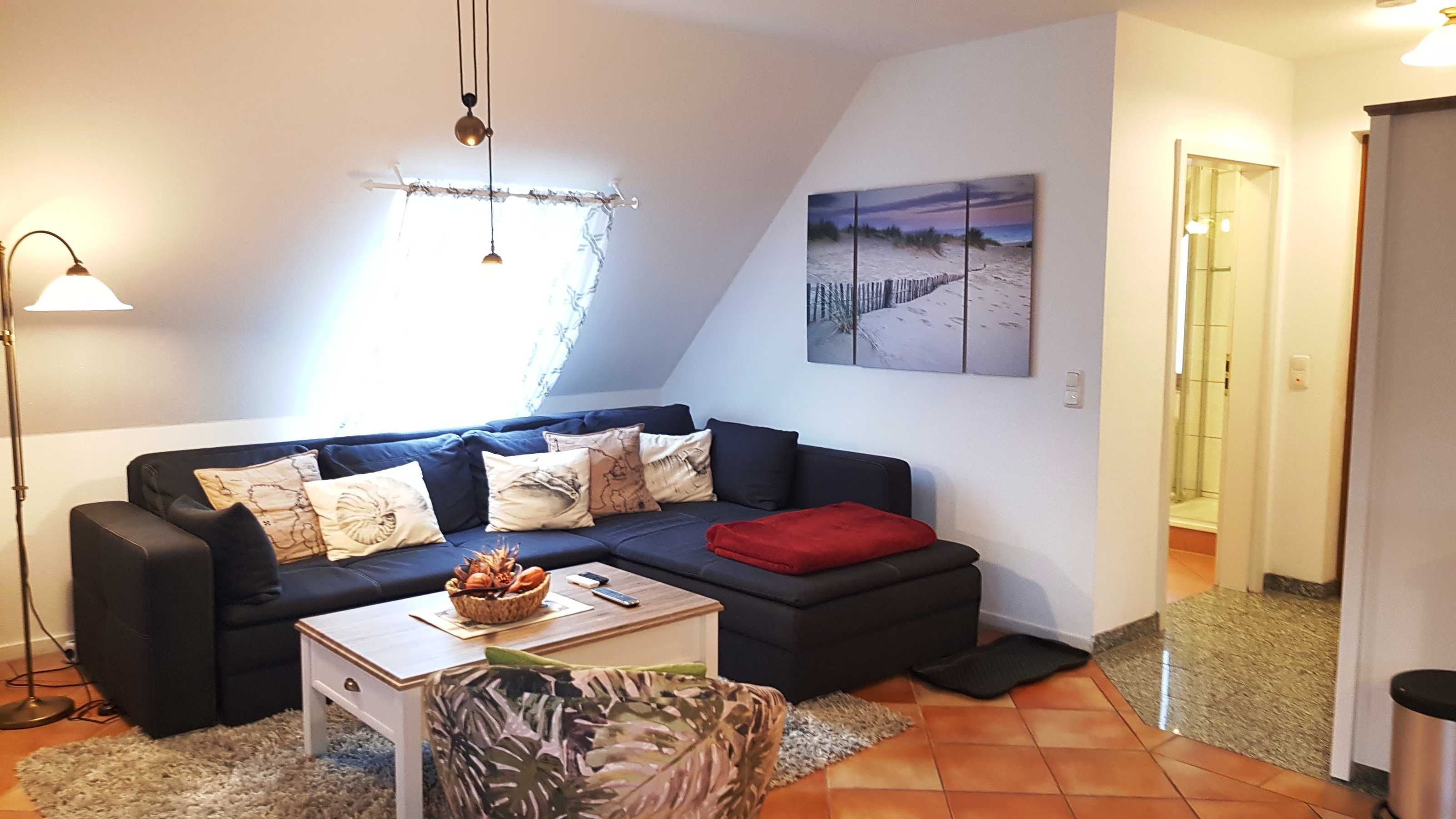 Das helle und modern eingerichtete Wohnzimmer ist mit einem TV und einer Schlafcouch ausgestattet. Hier bietet sich eine optimale zusätzliche Aufbettung für bis zu 2 Personen.