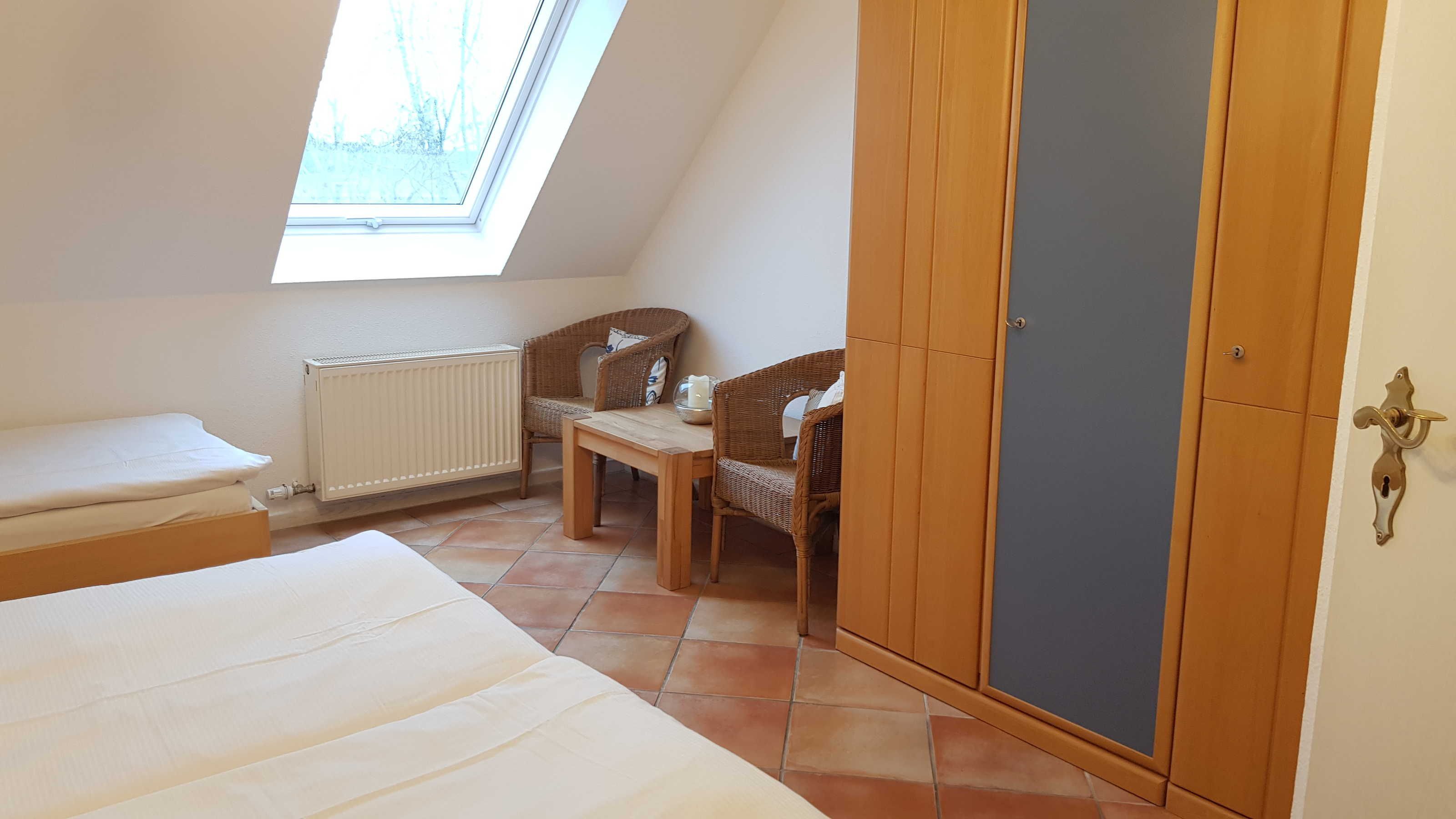 Im oberen Teil der Wohnung befindet sich das Schlafzimmer, welches Platz für bis zu 3 Personen bietet. Dank einem Doppelbett und einem zusätzlichen Einzelbett sind hier erholsame Schlafstunden garantiert.