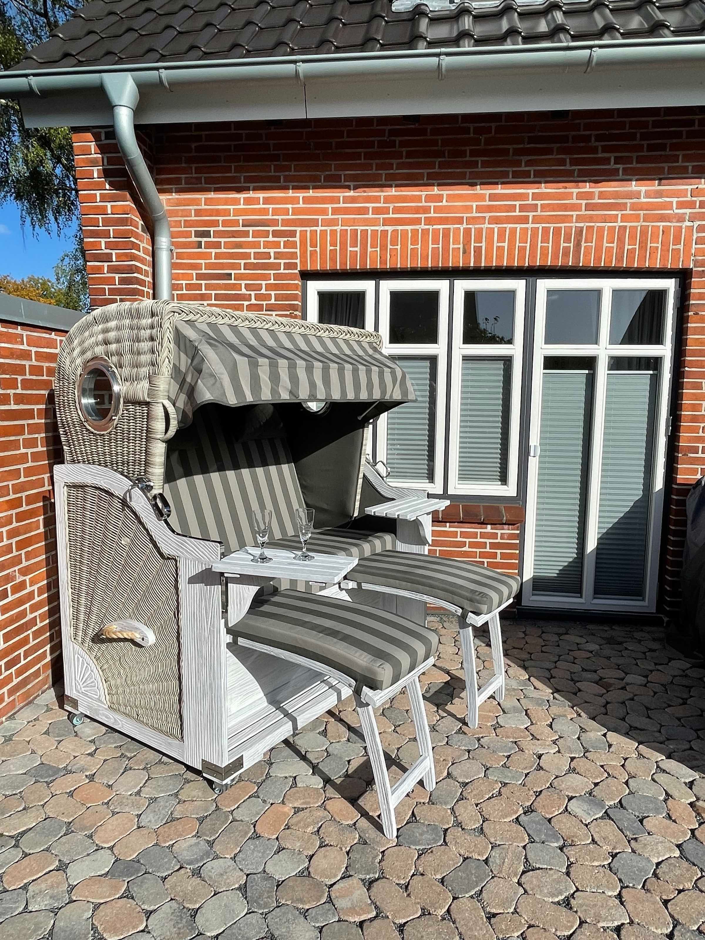 Des Weiteren eine überdachte Terrasse, u.a. mit einem XXL-Strandkorb ausgestattet. Es gibt einen Holzkohle-Grill (Kohle bitte selbst besorgen).