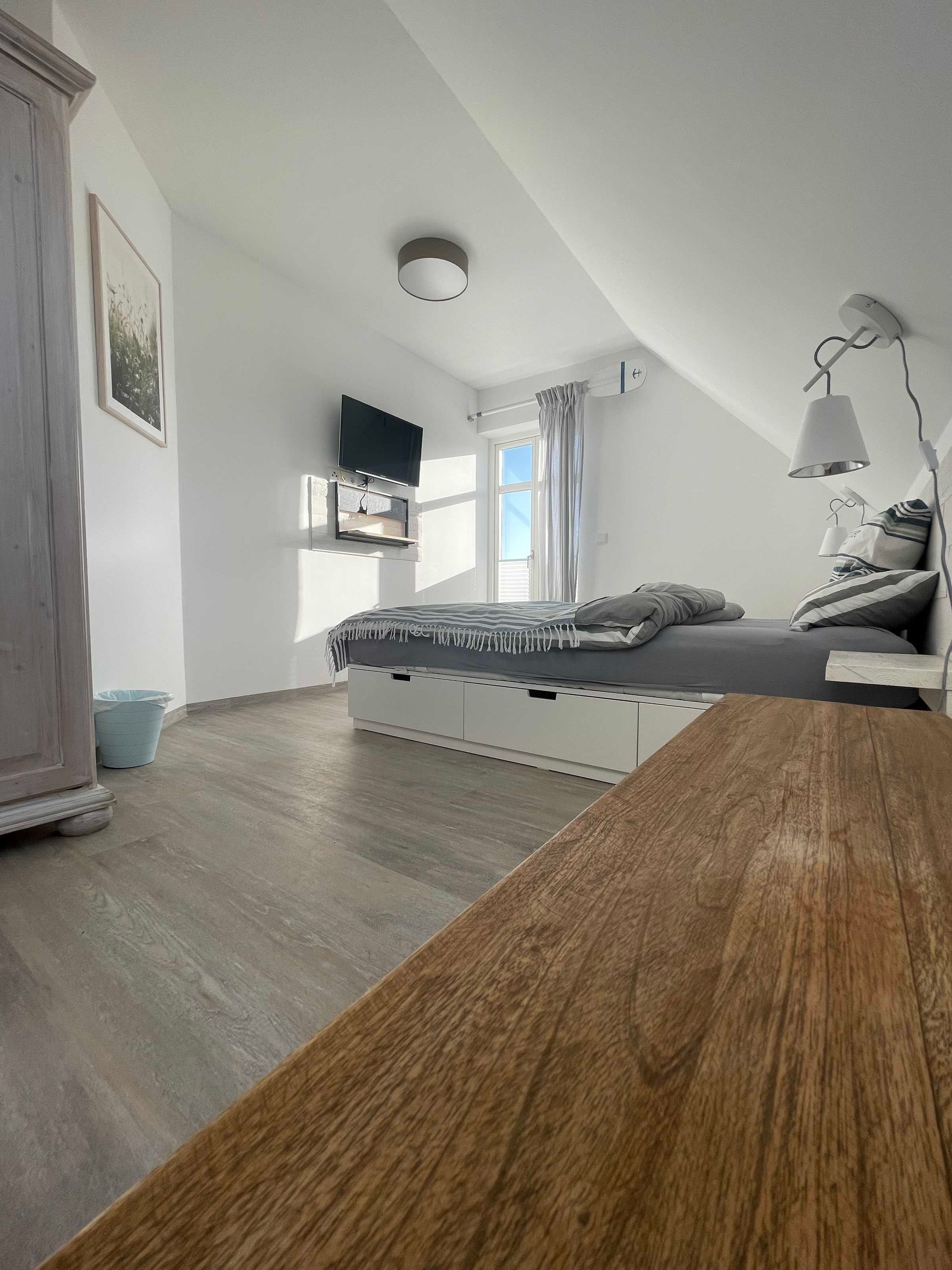 Ebenfalls im Erdgeschoss gibt es ein Schlafzimmer mit Doppelbett (1,40 m x 2,00 m), internetfähigem Fernseher, kleinem Schrank und Schreibtisch.