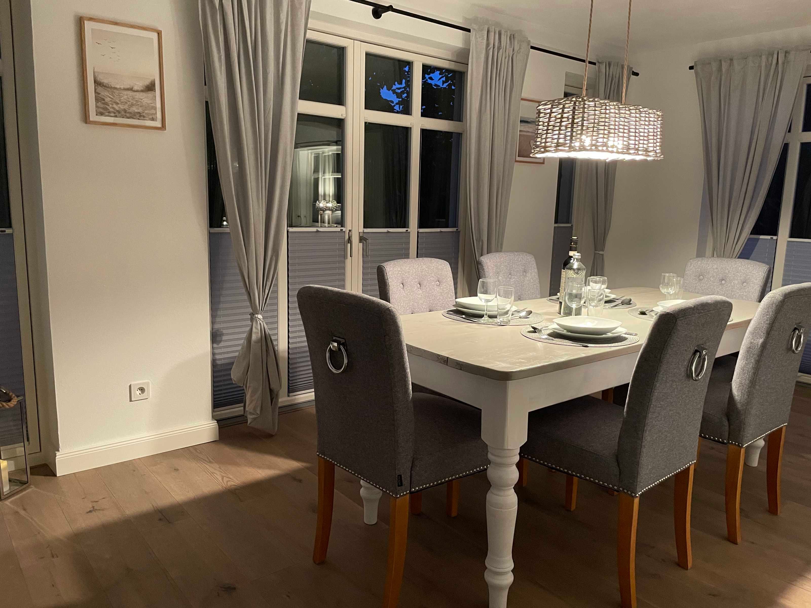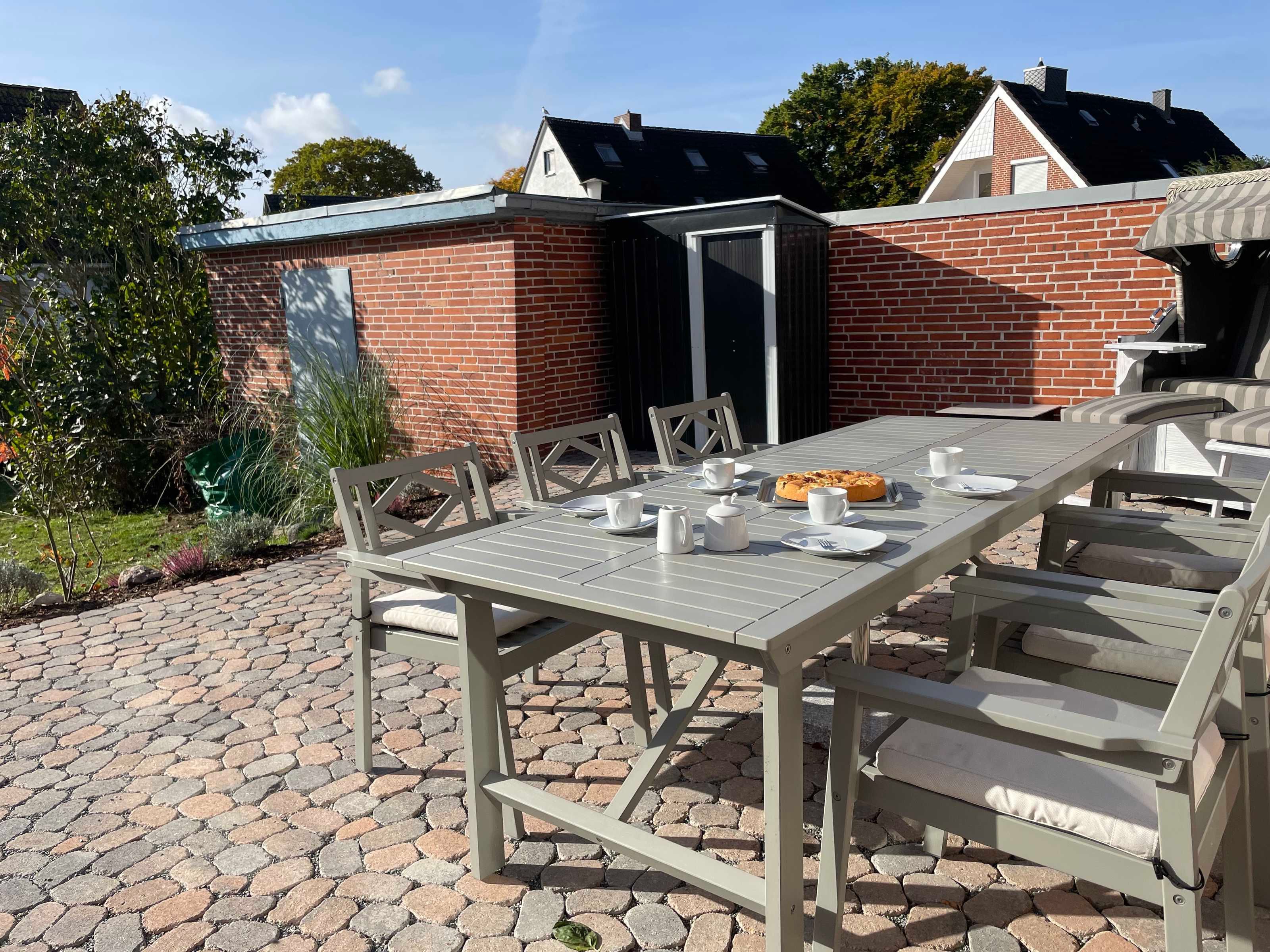 Vom Wohnbereich mit seiner bequemen Couchgarnitur und dem großen, internetfähigen Fernseher aus kommt man auf die vollständig neu gestaltete und überdachte Terrasse in Tropfenform. Ein langer Tisch mit 6 Stühlen bietet viel Platz für gesellige Ferienzeit und der breite, kuschelige Strandkorb lädt zu Urlaubsträumen ein. Ein Holzkohle-Grill (Kohle bitte selbst besorgen) steht für gemütliche Barbecue-Abende zur Verfügung.