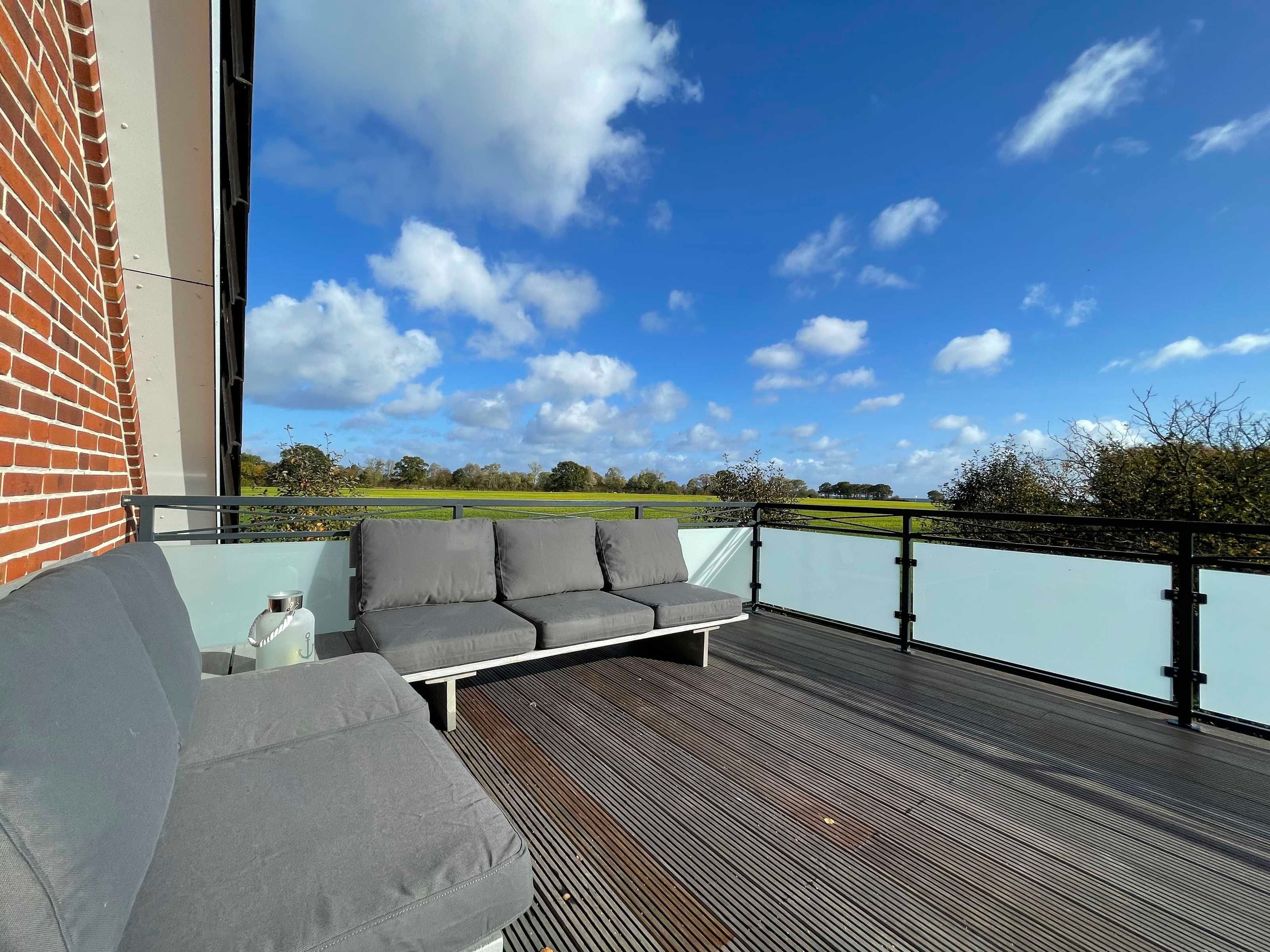 Das Obergeschoss ist nach Renovierung ein wahres Raumwunder. Hier finden sich 2 geräumige Schlafzimmer unterm Dach. Beide haben einen Zugang zur großen, außergewöhnlichen Dachterrasse, die mit modernen Loungemöbeln ausgestattet ist. Der weite Ausblick über die Felder bis zur Ostsee hin – traumhaft! Der Duft des Meeres ist spürbar…