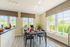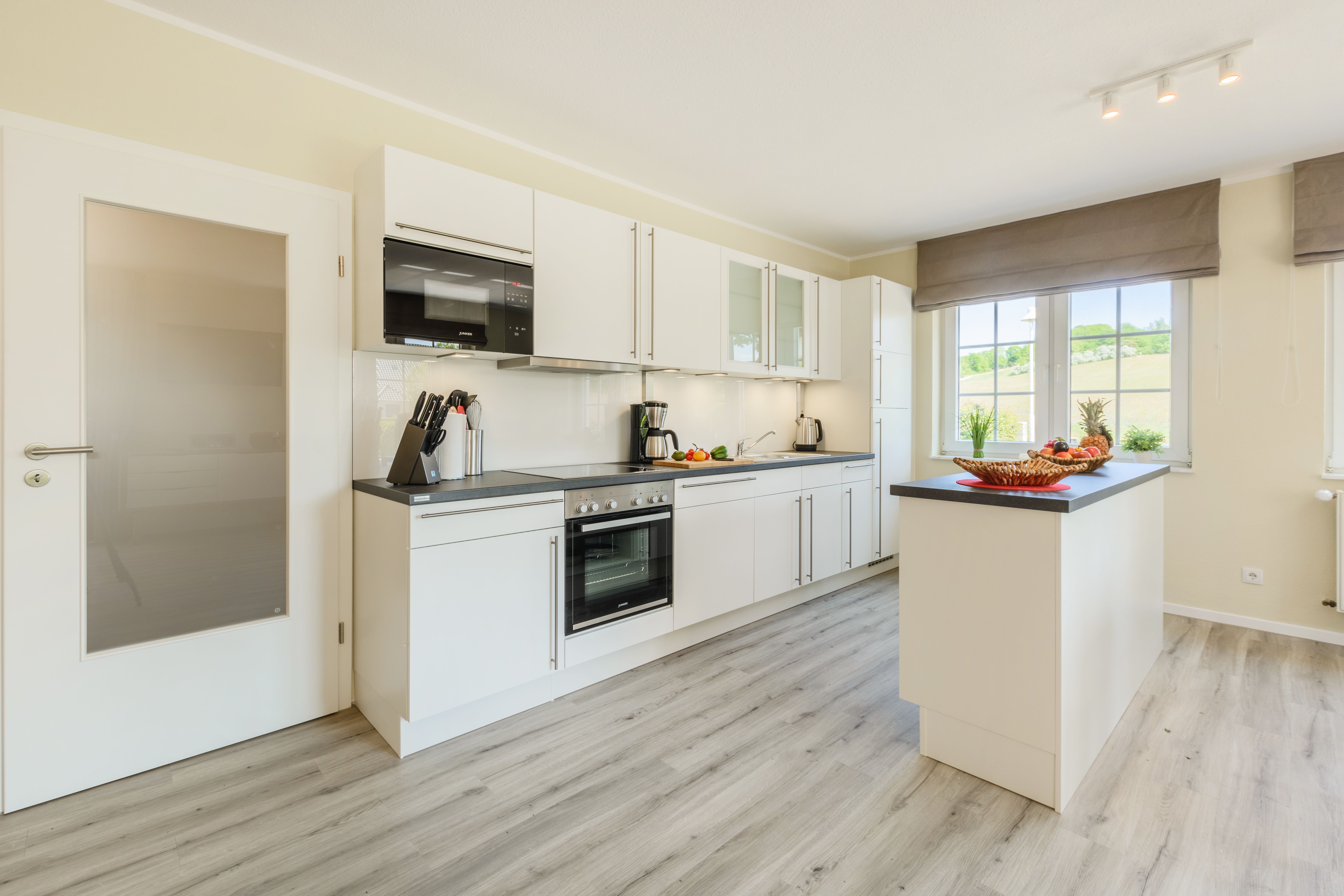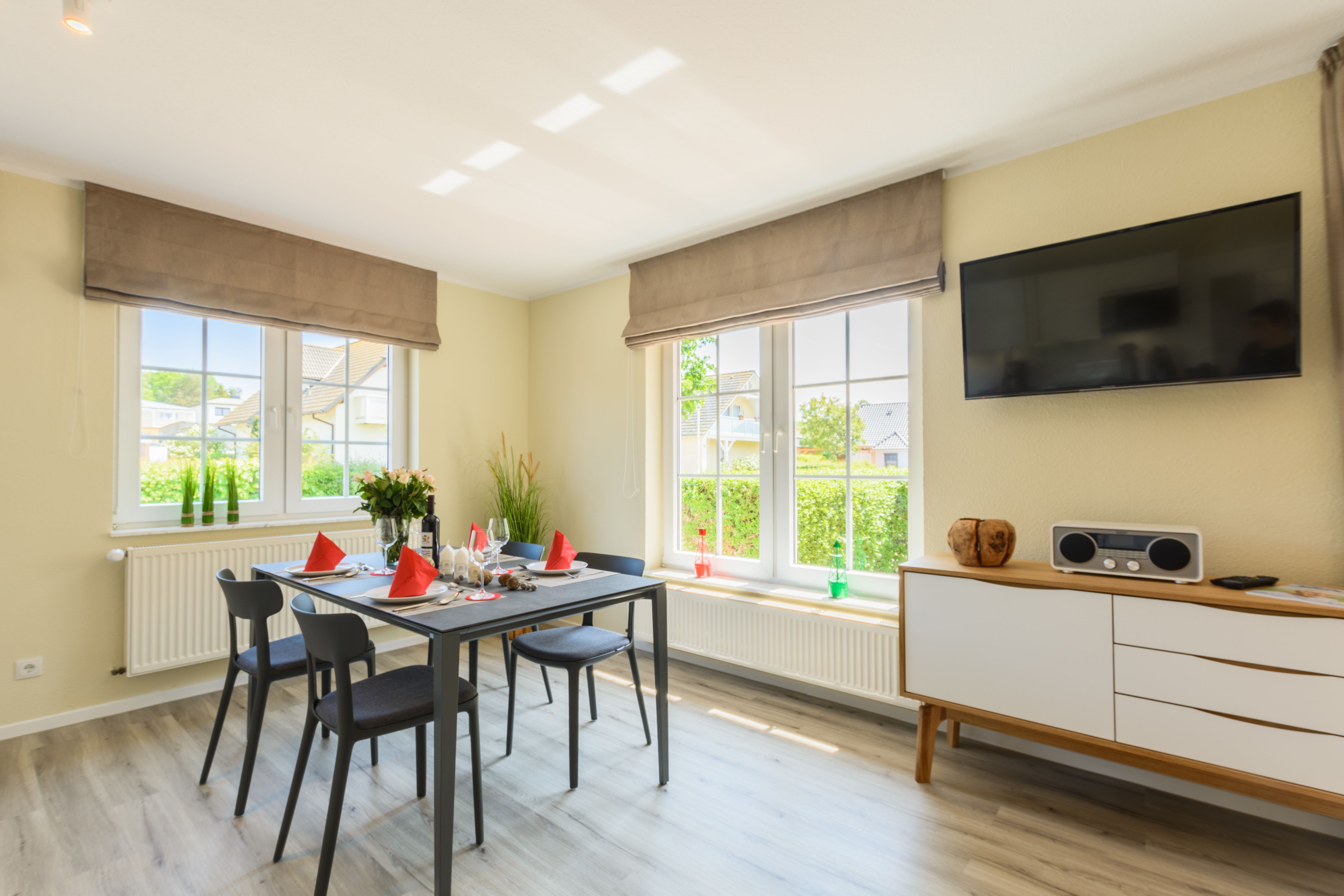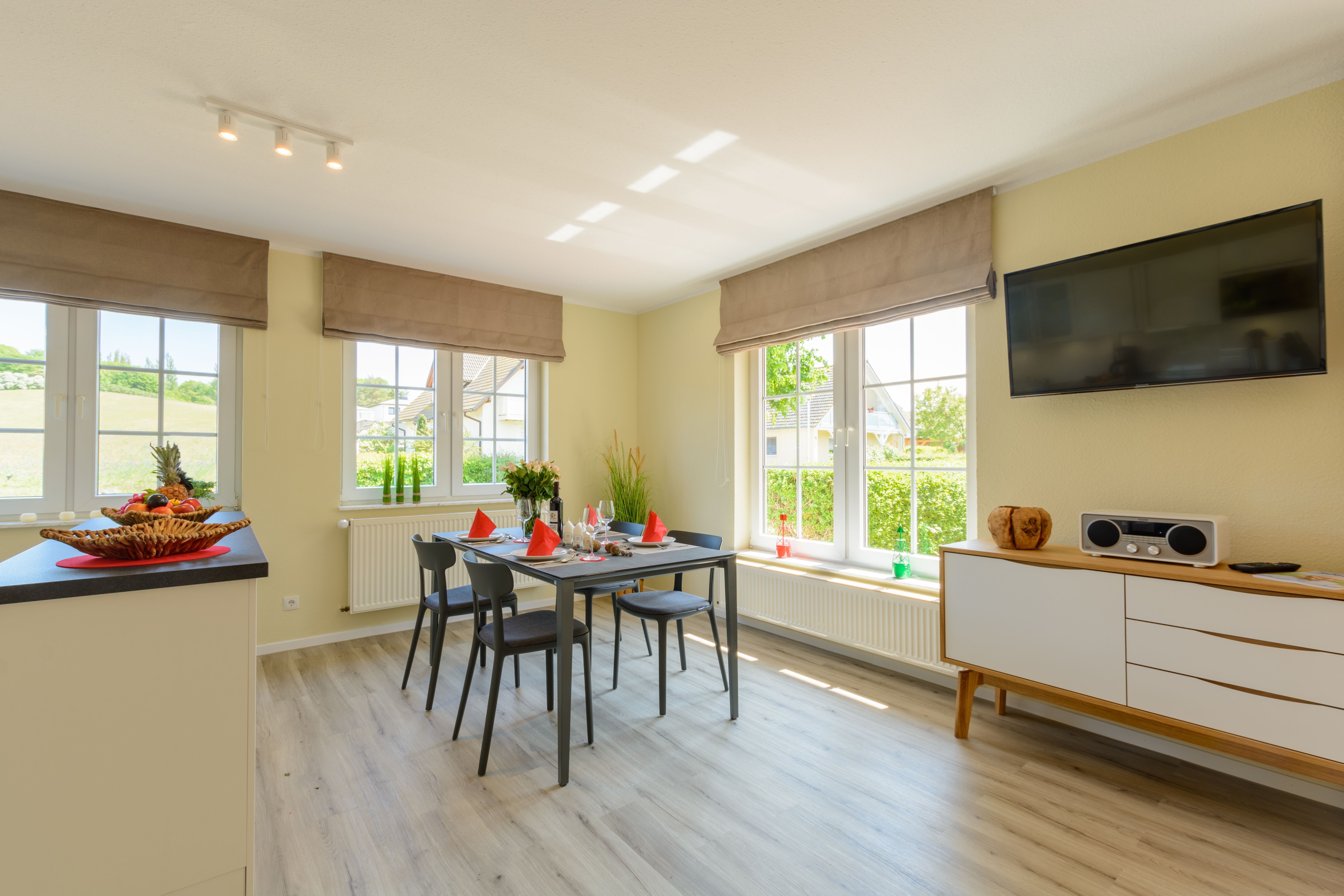 Die Nichtraucherferienwohnung befindet sich im Erdgeschoss und erstreckt sich über ca. 60 qm wo sich max. 4 Erwachsene wohlfühlen können. Der großzügige und helle Wohn- Essbereich ist mit einer modernen Küchenzeile ausgestattet. Mit einem Kühlschrank mit Eisfach, Geschirrspüler, Cerankochfeld, Backofen, Mikrowelle, Wasserkocher, Kaffeemaschine, Toaster, Mixer, Waffeleisen können Sie Ihre gemütlichen Kochabende ganz individuell gestalten. Ein passender Essbereich rundet die Gemütlichkeit ab. Im angrenzenden Wohnbereich trägt eine bequeme Couch (Aufbettungsmöglichkeit für 3./4.Person, 1,50m x 1,95m) mit Couchtisch, ein Lesesessel mit Hocker sowie ein TV-Board zu Ihrer Entspannung bei. Die technische Ausstattung umfasst einen Smart-TV, ein DAB-Bluetooth-Radio sowie einen WLAN-Anschluss. Vom Wohnbereich gelangen Sie auf Ihre bestuhlte Terrasse (Süd) mit Sonnenschirm, von wo Sie aus Ihren Tag entspannt bei einem Glas Wein ausklingen lassen können. Hell und freundlich eingerichtet erwartet Sie ein gemütliches Schlafzimmer, mit einem komfortablen Boxspring-Bett (1,80m x 2,00m) mit 5 Zonen Tonnen-Taschenfederkern-Matratzen, Nachttischablagen, einen großzügigen Kleiderschrank sowie ein Smart-TV. Der Schlafbereich verfügt zudem über Vorhänge, die nahezu lichtundurchlässig sind und einen guten Sicht- und Sonnenschutz bieten. Für einen angenehmen Schlaf sorgen zusätzlich Insektenschutzgitter im Wohn- & Schlafbereich. Das Tageslicht-Badezimmer ist mit einer ebenerdigen Dusche, einem WC, einem Fön sowie einem Waschtisch ausgestattet. Im Nachbarhaus C können Sie eine Waschmaschine sowie einen Trockner gegen Gebühr nutzen. Hier stehen auch ein Bügelbrett und ein Bügeleisen zur Verfügung. In der Wohnung finden Sie zusätzlich ein Staubsauger, ein Besen mit Kehrset, ein Wäscheständer sowie ein Wäschekorb. Haustiere sind nicht erlaubt. Das Grillen auf dem ausgewiesenen Gemeinschaftsplatz lädt zu gemütlichen Abenden ein. Zur Entspannung lädt eine münzbetriebene Sauna mit kleinem Ruheraum im Untergeschoss von Haus B ein. Ihre Fahrräder können Sie begrenzt im Gemeinschaftskeller oder auf dem Grundstück abstellen. Ein PKW-Stellplatz steht Ihnen inklusive zur Verfügung. Die Erstausstattung eines Wäschepaketes (komplette Bettwäsche, 1 Duschhandtuch, 2 kleine Handtücher) können Sie bis 14 Tage vor Anreise gegen einen Aufpreis dazu buchen oder durch eigene ergänzen. Ab 2 gebuchten Paketen erhalten Sie einmalig 1 Geschirrhandtuch und 1 Duschvorleger hinzu.