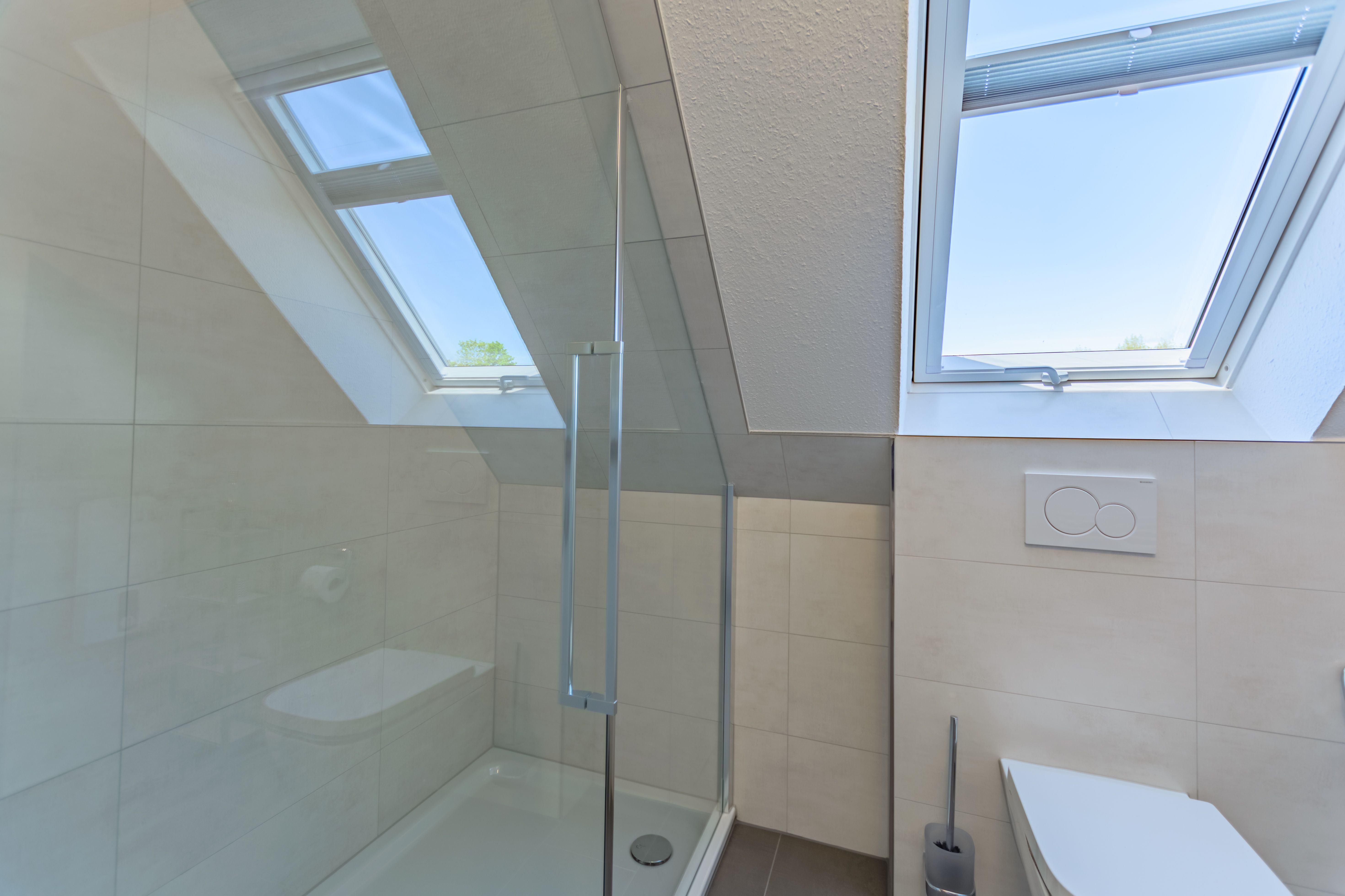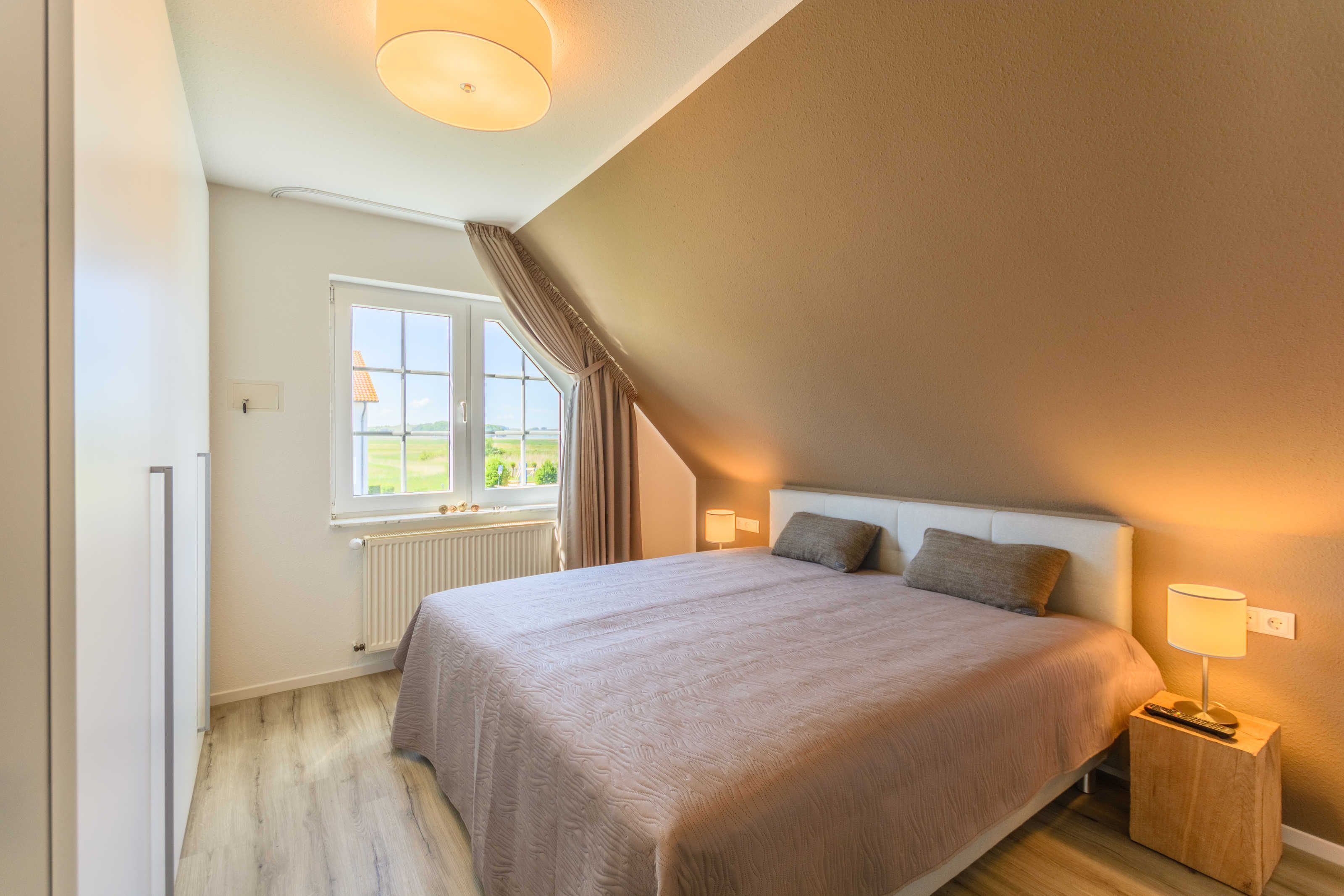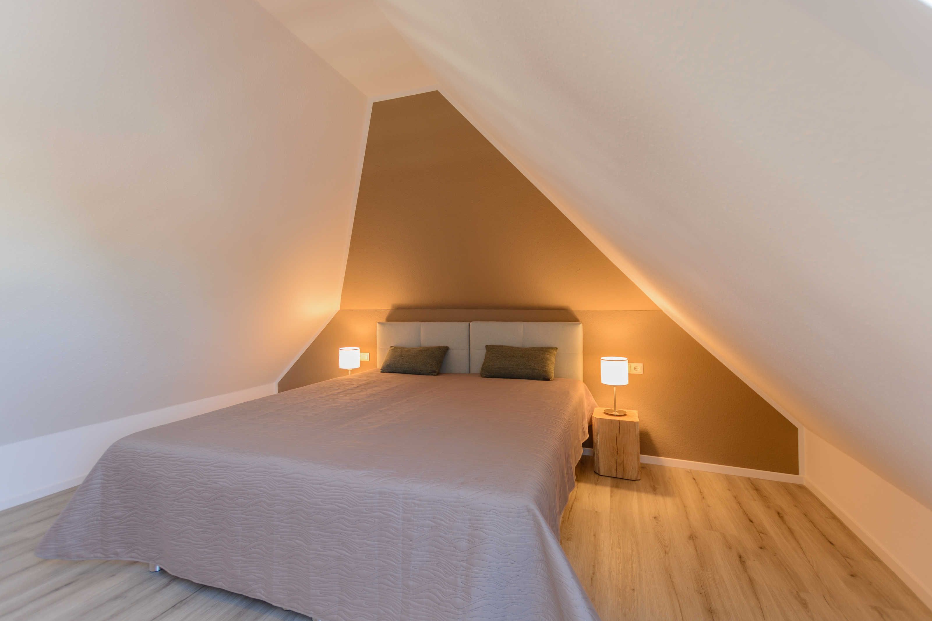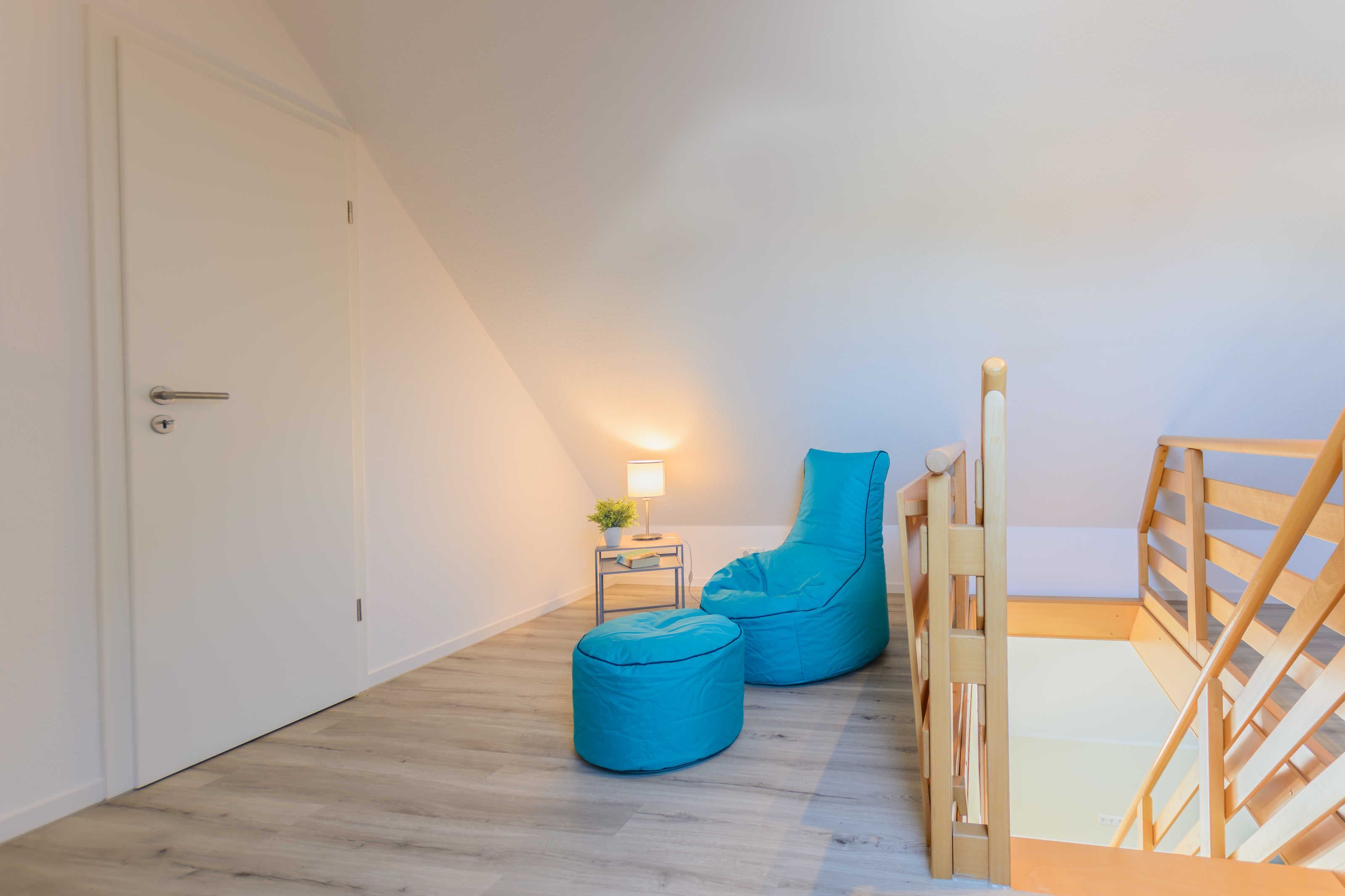Die Nichtraucherferienwohnung befindet sich in der 1. Etage und erstreckt sich über 2 Etagen. Mit Ihren ca. 75 qm können sich max. 6 Erwachsene wohlfühlen. Der großzügige und helle Wohn- Essbereich ist mit einer modernen Küchenzeile ausgestattet. Mit einem Kühlschrank mit Eisfach, Geschirrspüler, Cerankochfeld, Backofen, Mikrowelle, Wasserkocher, Kaffeemaschine, Toaster, Mixer, Waffeleisen können Sie Ihre gemütlichen Kochabende ganz individuell gestalten. Ein passender Essbereich rundet die Gemütlichkeit ab. Im angrenzenden Wohnbereich trägt eine bequeme Couch (Aufbettungsmöglichkeit für 5./6.Person, 1,50m x 1,95m) mit Couchtisch, ein Lesesessel mit Hocker sowie ein TV-Board zu Ihrer Entspannung bei. Die technische Ausstattung umfasst einen Smart-TV, ein DAB-Bluetooth-Radio sowie einen WLAN-Anschluss. Vom Wohnbereich gelangen Sie auf Ihren bestuhlten Balkon (Süd), von wo Sie aus Ihren Tag entspannt bei einem Glas Wein ausklingen lassen können. Hell und freundlich eingerichtet erwartet Sie ein gemütliches Schlafzimmer auf gleicher Ebene, mit einem komfortablen Boxspring-Bett (1,80m x 2,00m) mit 5 Zonen Tonnen-Taschenfederkern-Matratzen, Nachttischablagen, einen großzügigen Kleiderschrank sowie ein Smart-TV. Das 2. Schlafzimmer erreichen Sie durch eine Treppe, welche vom Wohnbereich aus startet. Hier befindet sich ebenfalls ein bequemes Boxspringbett (1,80m x 2,00m) mit Nachttischablagen sowie einer kleinen Leseecke oder Relax-Ecke. Beide Schlafbereiche verfügen zudem über Vorhänge/Rollos, die nahezu lichtundurchlässig sind und einen guten Sicht- und Sonnenschutz bieten. Für einen angenehmen Schlaf sorgen zusätzlich Insektenschutzgitter im Wohn- & Schlafbereich. Das Tageslicht-Badezimmer ist mit einer ebenerdigen Dusche, einem WC, einen Handtuchtrockner, einem Fön sowie einem Waschtisch ausgestattet. In der Wohnung finden Sie zusätzlich ein Staubsauger, ein Besen mit Kehrset, ein Wäscheständer sowie ein Wäschekorb. Im Nachbarhaus C können Sie eine Waschmaschine sowie einen Trockner gegen Gebühr nutzen. Hier stehen auch ein Bügelbrett und ein Bügeleisen zur Verfügung. Haustiere sind nicht erlaubt. Das Grillen auf dem ausgewiesenen Gemeinschaftsplatz lädt zu gemütlichen Abenden ein. Zur Entspannung lädt eine münzbetriebene Sauna mit kleinem Ruheraum im Untergeschoss von Haus B ein. Ihre Fahrräder können Sie begrenzt im Gemeinschaftskeller oder auf dem Grundstück abstellen. Die Erstausstattung eines Wäschepaketes (komplette Bettwäsche, 1 Duschhandtuch, 2 kleine Handtücher) können Sie bis 14 Tage vor Anreise gegen einen Aufpreis dazu buchen oder durch eigene ergänzen. Ab 2 gebuchten Paketen erhalten Sie einmalig 1 Geschirrhandtuch und 1 Duschvorleger hinzu.